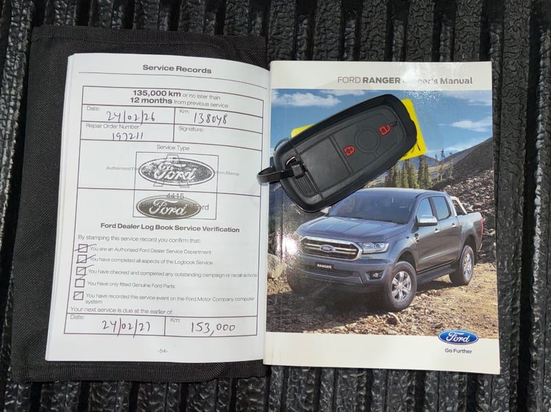The PX MkIII Ranger XLT with the 3.2-litre five-cylinder Duratorq turbo diesel is the engine that built the Ranger's reputation for long-haul reliability across remote Australia. Compliance date March 2020, VIN MPBUMFF50LX273011, Thailand manufactured, Australian-delivered. Service history is documented with a Ford dealer stamp confirming a service at 138,048 km in February 2026, next due at 153,000 km or February 2027. The 6-speed automatic is smooth, the 4WD system is switchable with centre and rear differential locks, and the GVM is 3,200 kg.