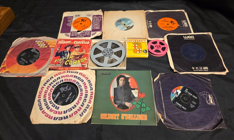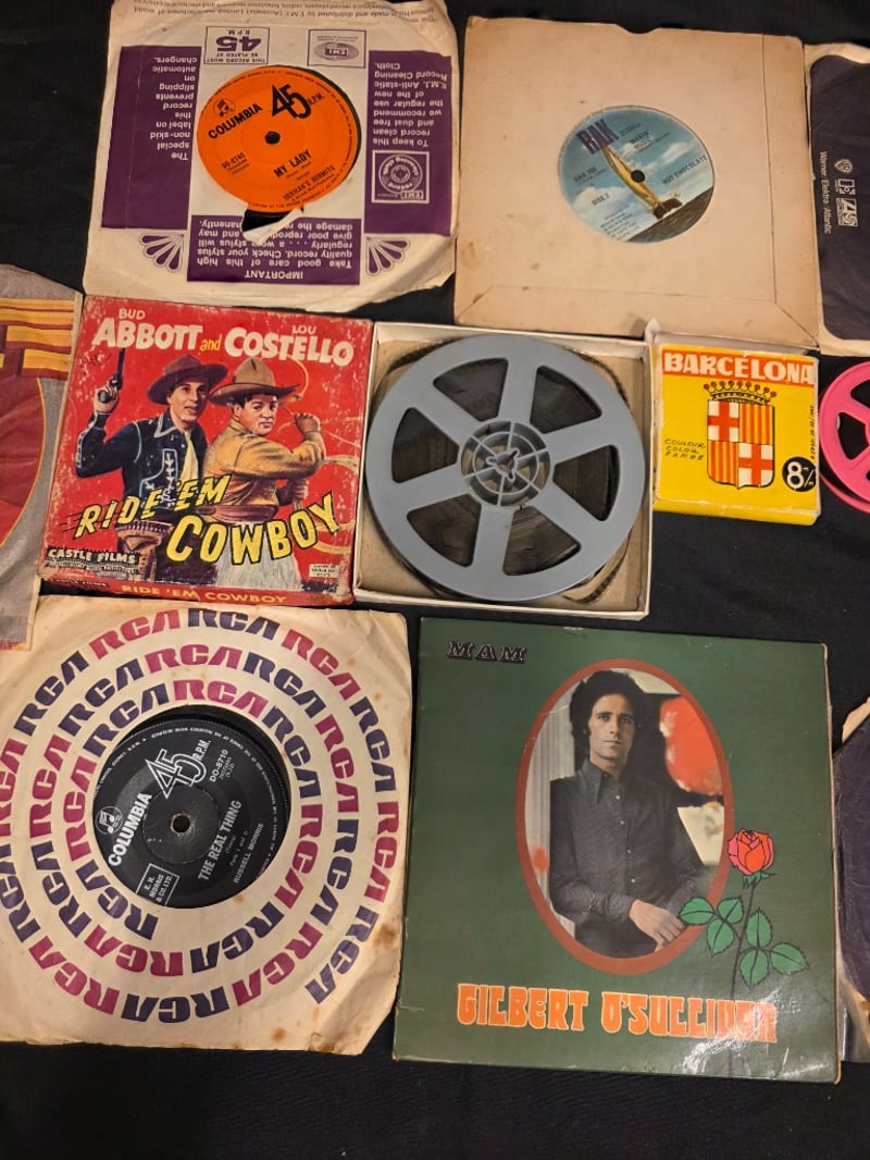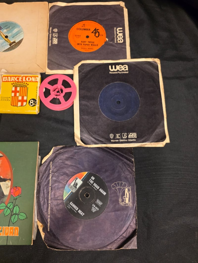 COLLECTION OF RECORDS AND ROLLS OF FILMS. Item Size: Height: 5cm, Width: 20cm, Depth: 20cm Records Included: Gilbert O Sullivan, On The Road Again Canned Heat, The Real Thing, Itchycoo Park, My Lady, Rak Hot Chocalate, Into Paper Walls, The Baby. Rolls Of Film Include: Ride Em Cowboy And Barcelona Couleur Color Farber. Note: Unknown Working Condition Condition: Fair - Refer To Images 584452+5