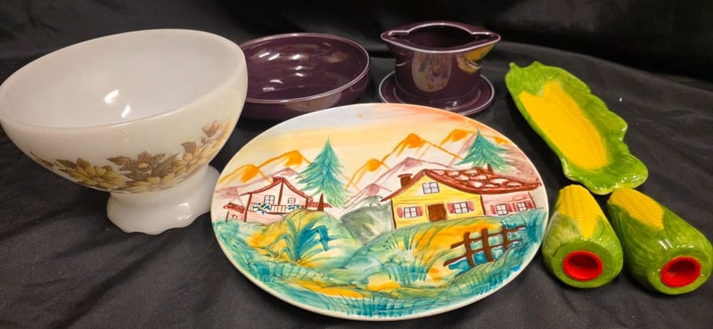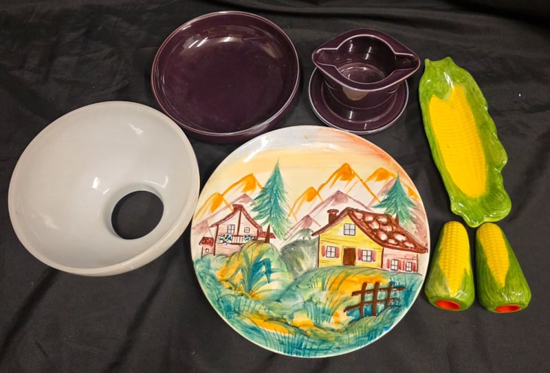 COLLECTION OF GLASSWARE AND KITCHENWARE Item Size: Height: 20cm, Width: 30cm, Depth: 30cm, Weight: 1Kg Collection Includes Pair Of Corn Shaped Salt And Pepper Shakers, Corn Shaped Dish, Hanging Plate Art Of Houses On Hills, Noirtake Gravy Boat And Under Plate, Etc Condition: Good - Refer To Images 584452+9