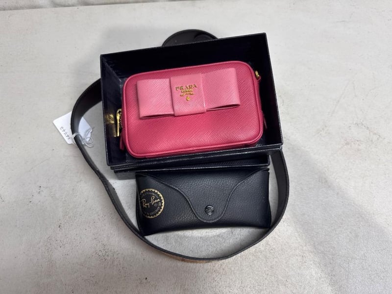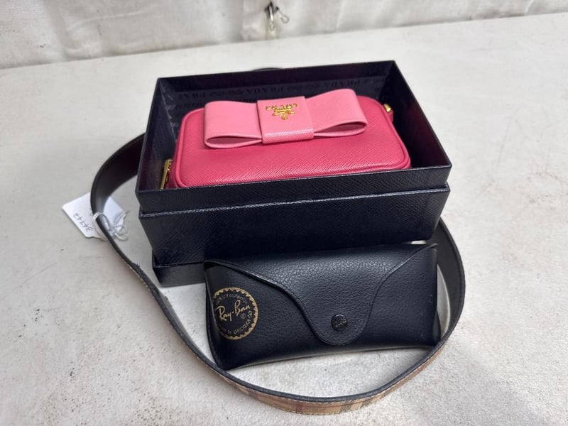 1x PRADA pink handbag, saffiano leather ribbon mini, camera bag, two-tone pink with leather strap, with box1x BURBERRY belt, classic checkmark logo, canvas/leather material, buckle belt size 40/100, 1x RAY-BAN sunglasses, RB 4165 justin, reflecting glasses, made in italy, with cover