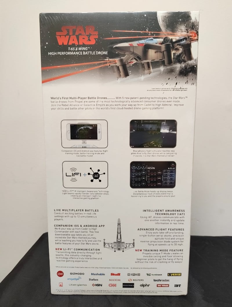 PROPEL STAR WARS T-65 X-WING HIGH PERFORMANCE BATTLE DRONE - BOXED Item Size: Height: 40cm, Width: 20cm, Depth: 20cm, Weight: 5Kg Propel Star Wars T-65 X-Wing High Performance Battle Drone Featuring Advanced Multi-Player Battle Capabilities With Intelligent Awareness Technology (Iat), New Li-Fi Communication System, And Training Mode Functionality. The Drone Includes Companion Ios/Android App Compatibility, Li-Fi Directional Flight Training, Real-Time Battle Tracking, And Precision Aerial Flight Controls With Auto-Stabilization. Box Displays Original Packaging With Technical Specifications And Feature Details Intact. Condition: Good - Refer To Images 655508+161
