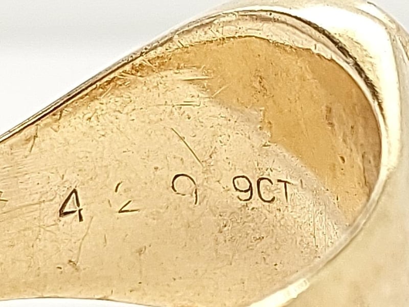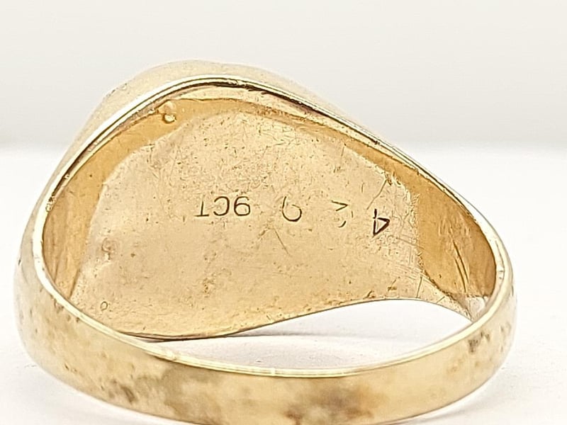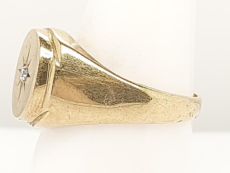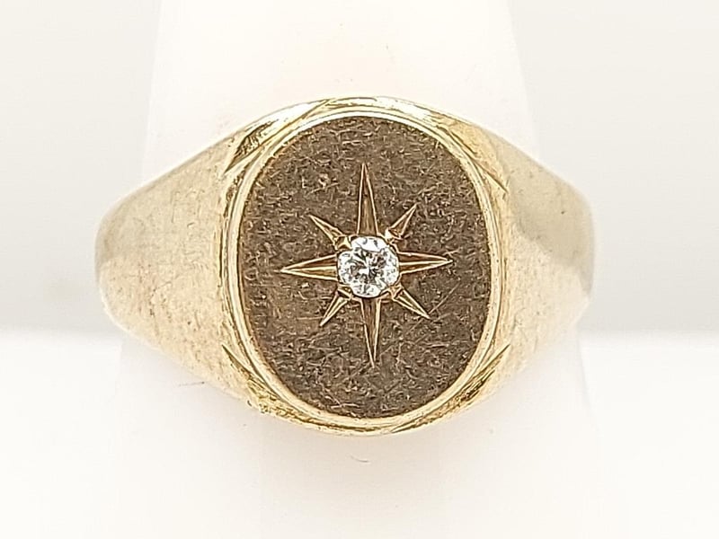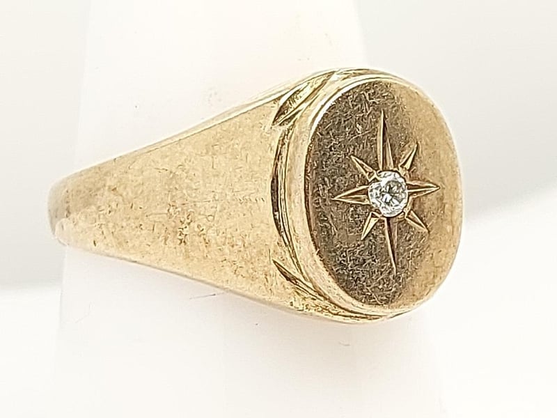9K YELLOW GOLD SIGNET RING WITH DIAMOND A Distinguished 9-Carat Yellow Gold Signet Ring Presenting A Classic Design Executed With Refined Craftsmanship. The Substantial Band Features A Textured Finish Providing Tactile Contrast To Polished Rim Detailing. The Oval Signet Face Showcases An Eight-Pointed Star Radiating From A Centrally Set Round Brilliant-Cut Diamond, Creating An Elegant Interplay Of Light And Geometry. The Design Balances Traditional Signet Ring Conventions With Decorative Embellishment. The Weighty Construction And Qua 9 Carat Yellow Gold Signet Ring Featuring A Circular Bezel With Eight-Point Star Design Set With A Single Round Brilliant-Cut Diamond, Textured Band With Polished Accents Good Condition With Light Surface Wear Consistent With Age. Band Shows Natural Patination And Minor Scuffing. Bezel Remains Crisp With Well-Defined Star Motif. Diamond Secure In Setting. Minor Wear To Polished Edges. Total Item Weight: 5.73g Length: 2.50cm Dimensions: Height: 13.70mm, Width: 21.70mm, Depth: 25.80mm Markings: 9Ct, 429 Condition: Good - Refer To Images TOORMINA 548663+21