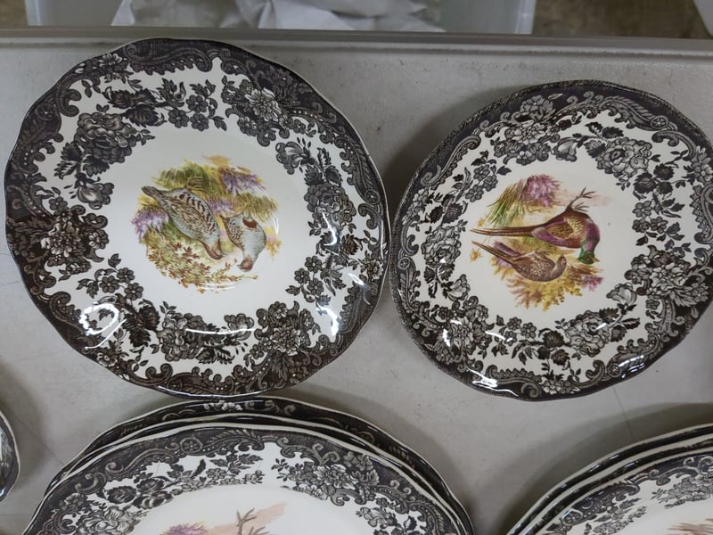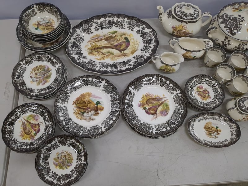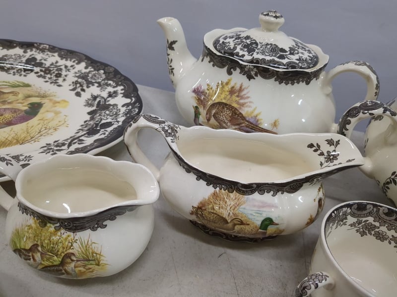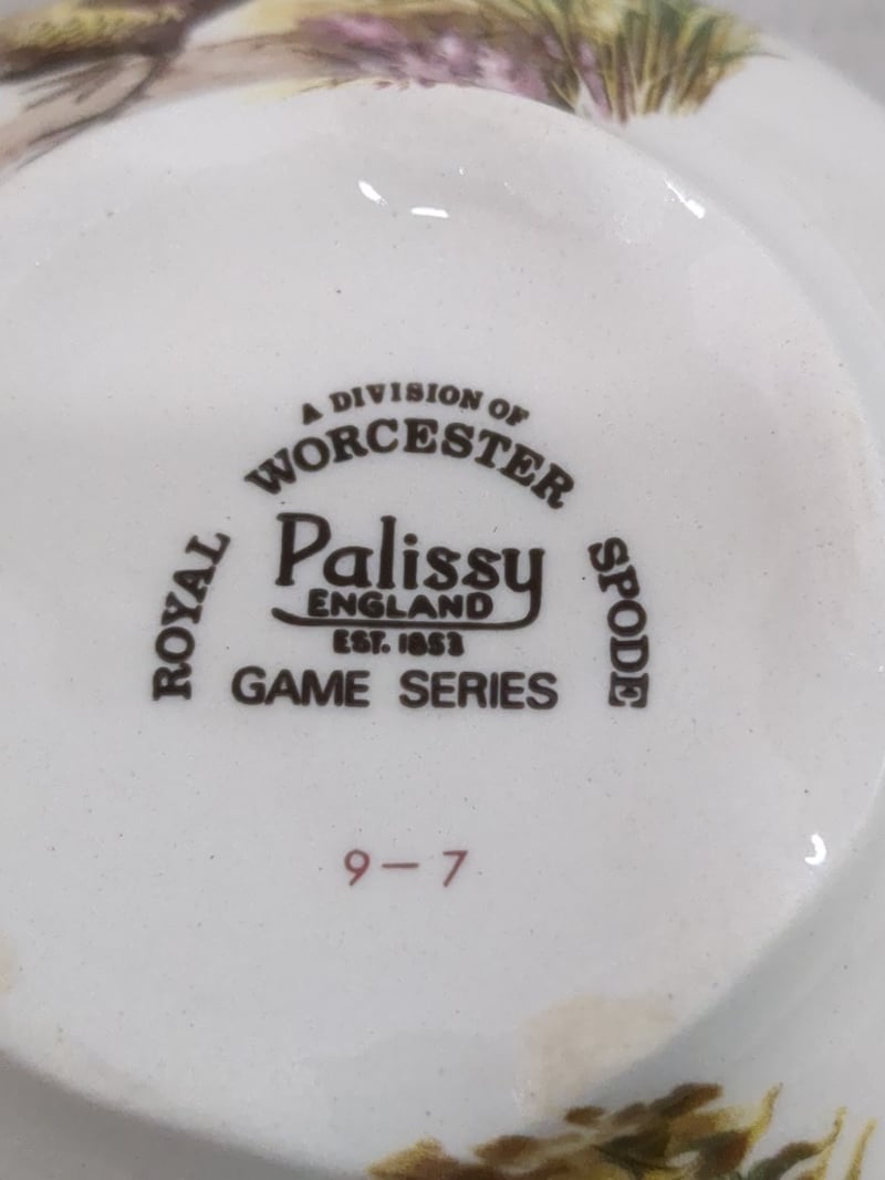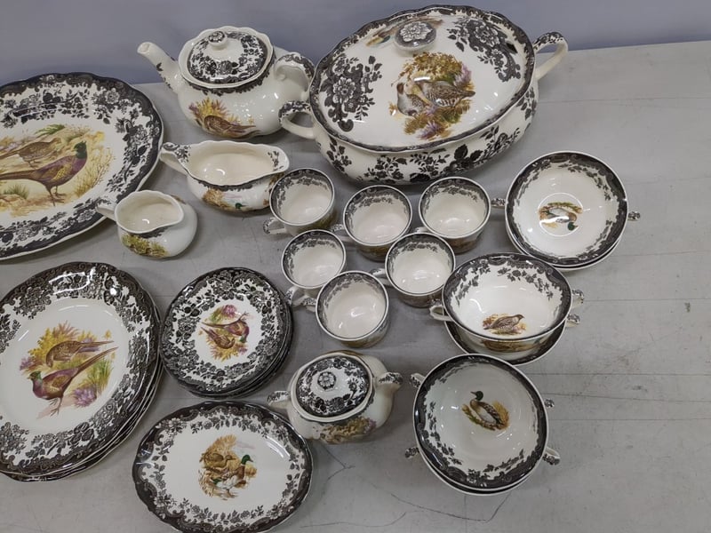 Extensive Royal Worcester Palissy Game Series Dinner Service Comprising Multiple Place Settings With Hand-Painted Game Bird Motifs. The Set Features Black Floral Transfer Decoration Borders With Naturalistic Centre Medallions Depicting Various Wild Birds In Landscape Settings. Includes Dinner Plates, Side Plates, Bowls, Teapot, Sauce Tureen, Gravy Boat, And Serving Vessels. Marked "A Division Of Worcester Royal Spode, Palissy England, Est. 1863, Game Series." Each Piece Exhibits Meticulous Hand-