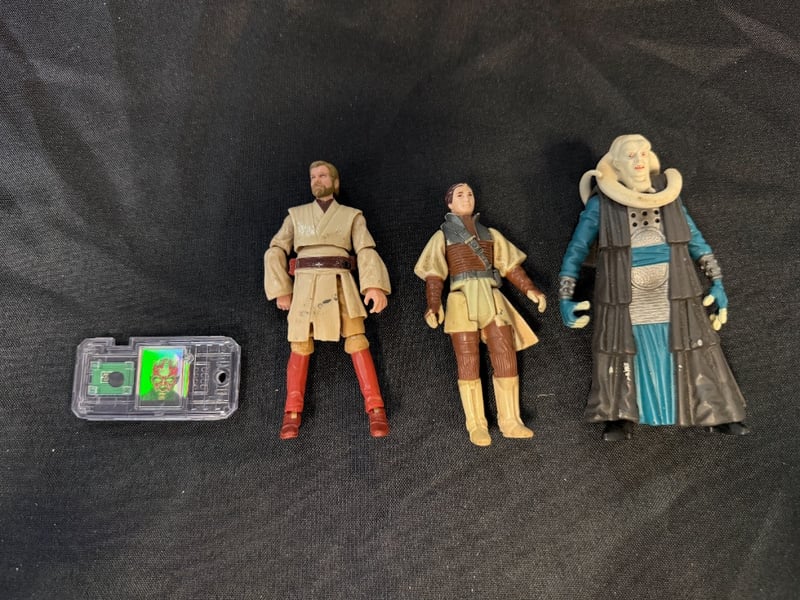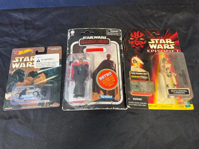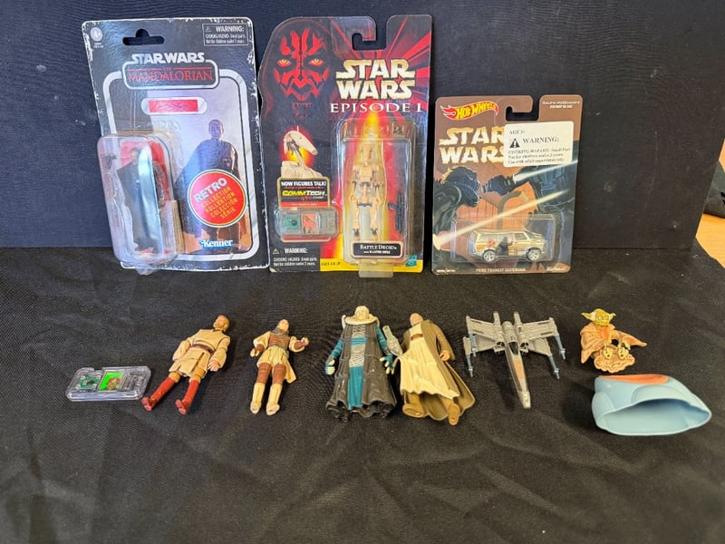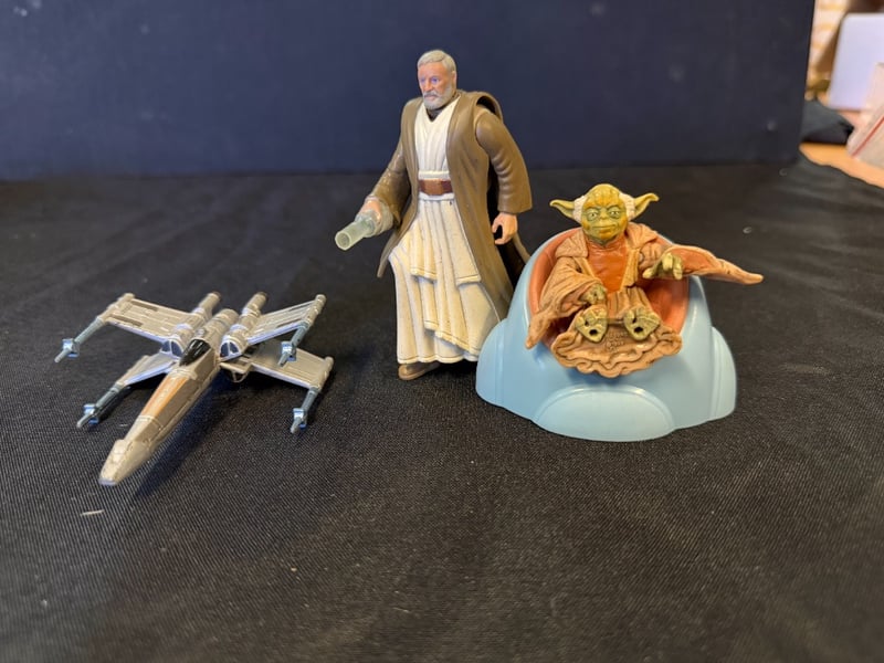 ASSORTED ACTION FIGURINES 1X Ford Transit Van 1X Kenner Figurine 1X Battle Droid 1X Yoda 1X Battle Ship 1X Obi-Wan Kenobi Condition: Fair - Refer To Images SR 233637+3