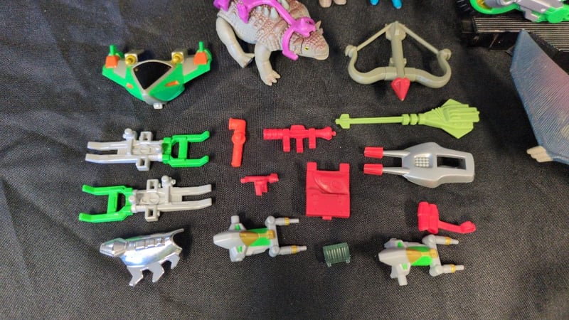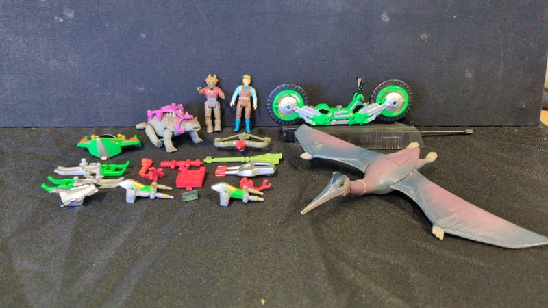 ASSORTED FIGURINES AND ACCESSORIES Item Size: Height: 25cm, Width: 20cm, Depth: 15cm, Weight: 1Kg 1X Dino Riders Pterodactyl 1X Dino Riders Ankylosaurus 1X Hot Wheels Thunder Cycles V-Rogue Moto 2X Dino Riders Figurines 15X Accessories Condition: Good - Refer To Images SR 233637+31