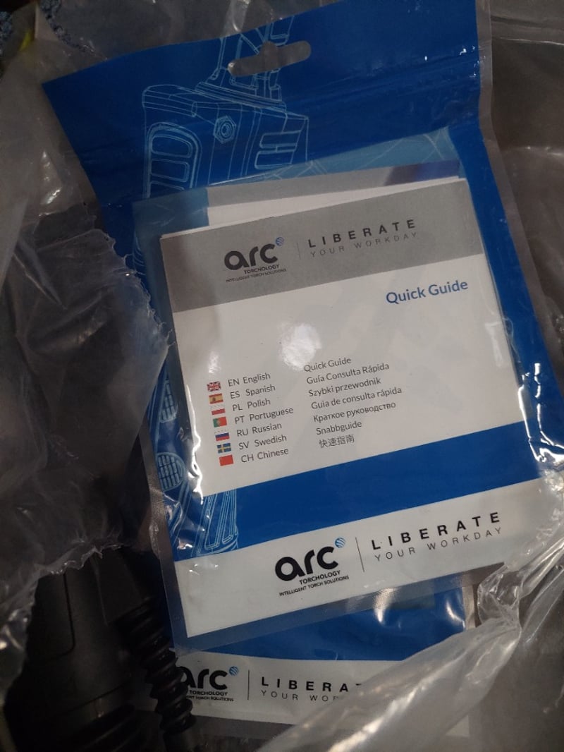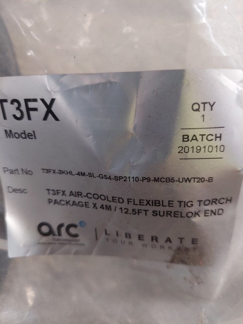T3FX Air-Cooled Flexible TIG Torch Package - 4M (12.5ft) with Surelok End connection. This professional-grade welding torch system by ARC (Torchology) is designed for TIG (Tungsten Inert Gas) welding applications. The package includes a blue torch head with ergonomic black grip handle, flexible hose assembly with quick-disconnect couplers, and comprehensive multilingual quick guide documentation. Note: untested