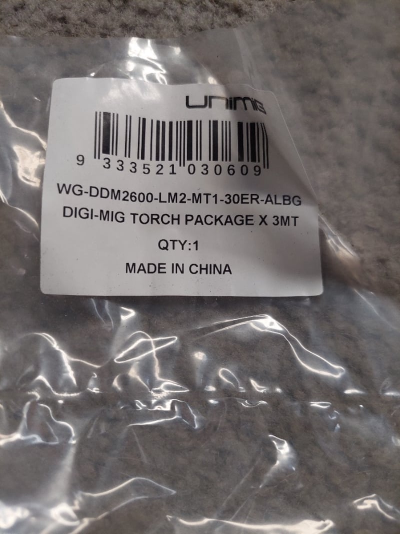Unimig DIGI-MIG torch package featuring a 3-metre cable assembly. Model WG-DDM2600-LM2-MT1-30ER-ALBG. Complete MIG welding torch with integrated gas nozzle, contact tip, and power connector. Includes full cable harness with industrial-grade connectors. New, factory-sealed in original plastic packaging.