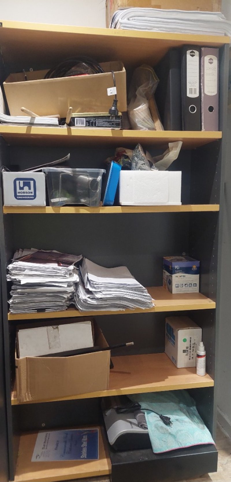 4 Tier Wooden Display Shelf, includes assorted items. Sold as lot Note: Signs Of Wear does not include paperwork shown in photos.