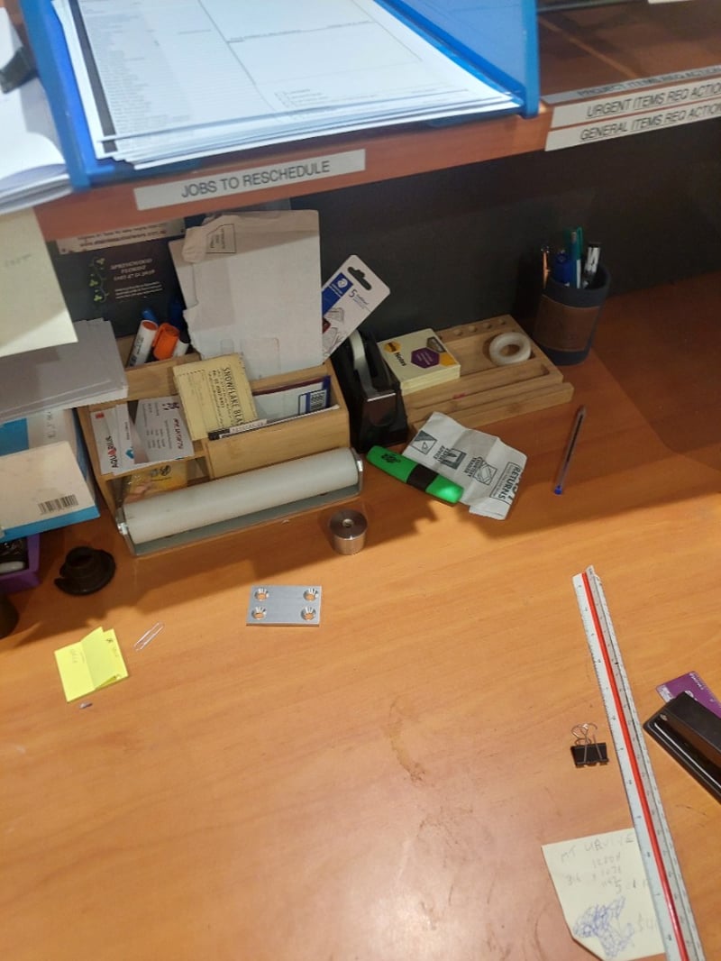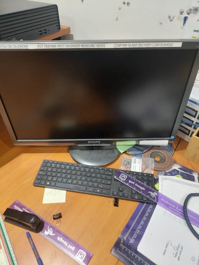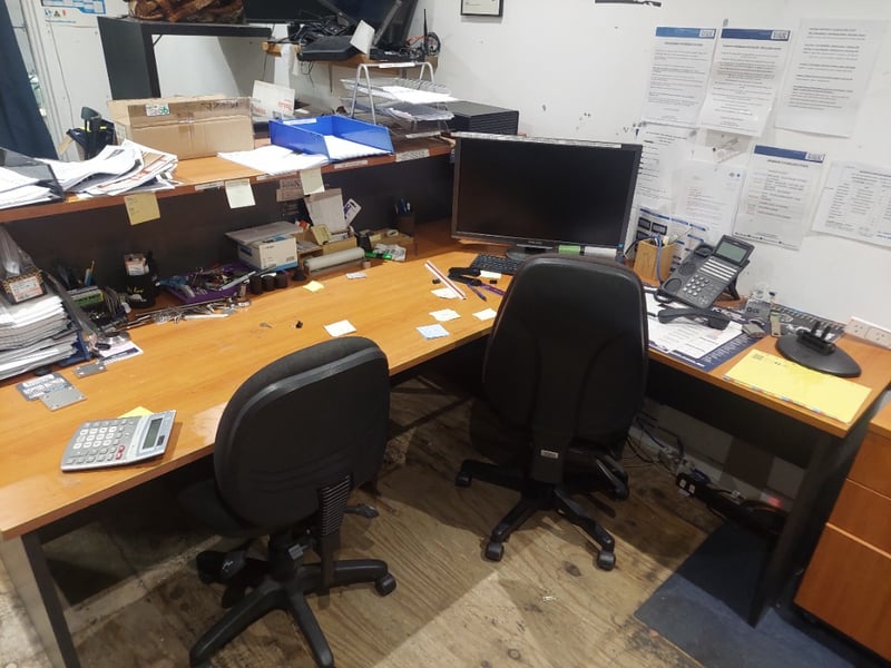 Office workstation lot ,includes monitor keyboard, stationary ,desk, chairs and more.... Sold as lot Note: Untested,signs of wear