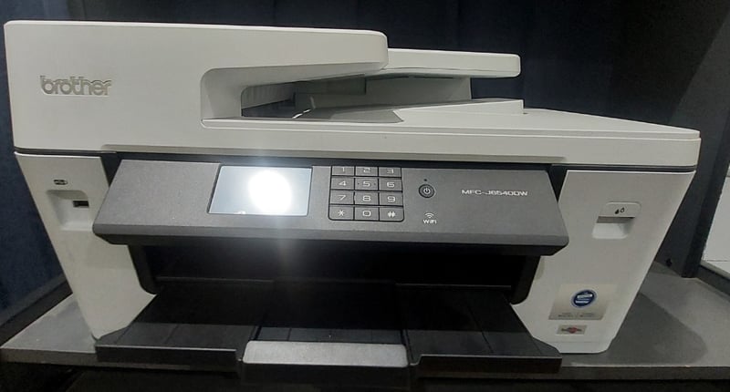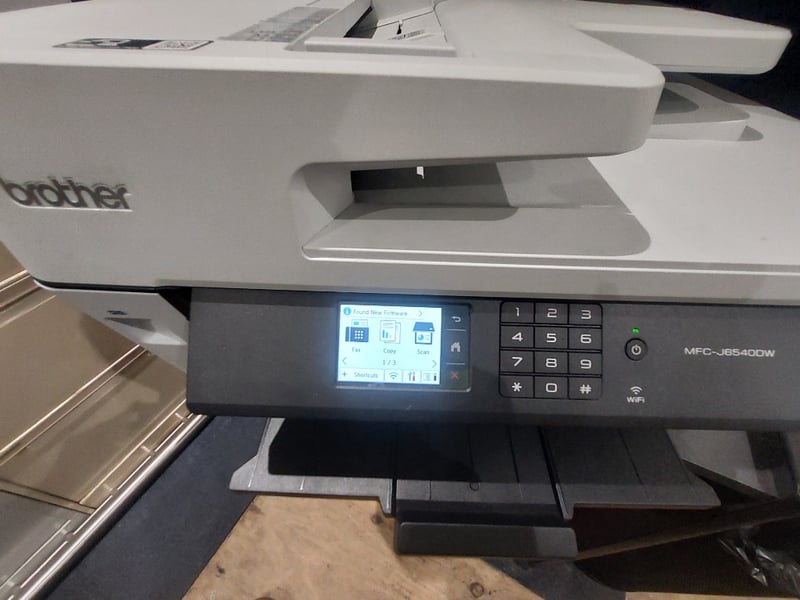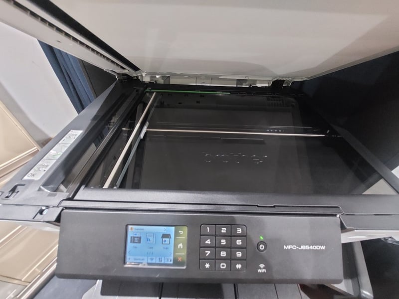 Brother MFC-J6540DW multifunction inkjet printer. This all-in-one device offers printing, copying, scanning, and faxing capabilities with WiFi connectivity. Features a color touchscreen display, automatic document feeder, and flatbed scanner. Note: Untested signs of wear