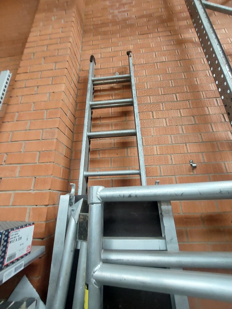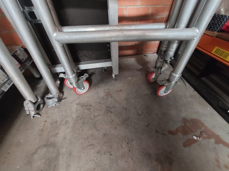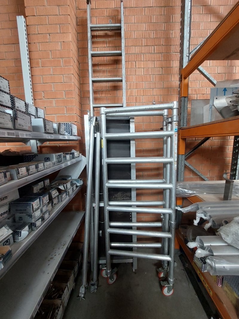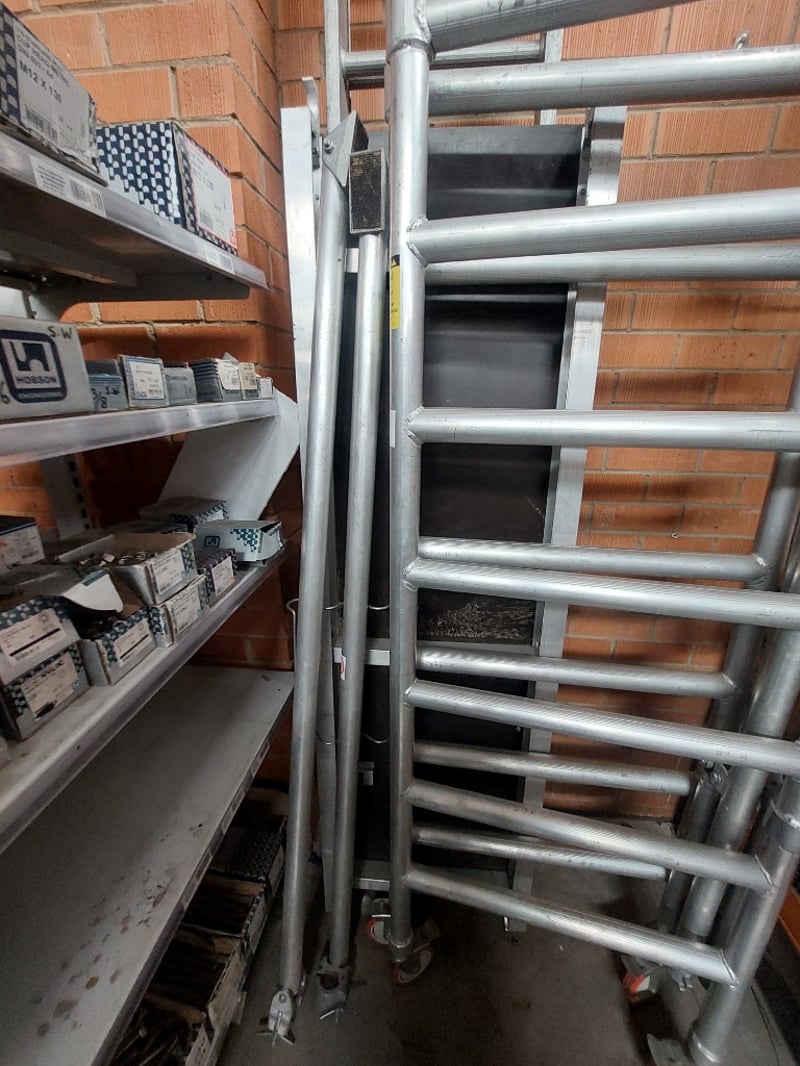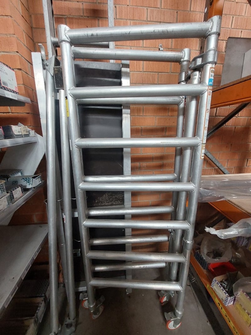 Industrial aluminium mobile work platform ladder with integrated tool storage. Features robust welded aluminium tubing construction with multiple horizontal rungs for safe access. Equipped with red swivel castors.Sold as Lot