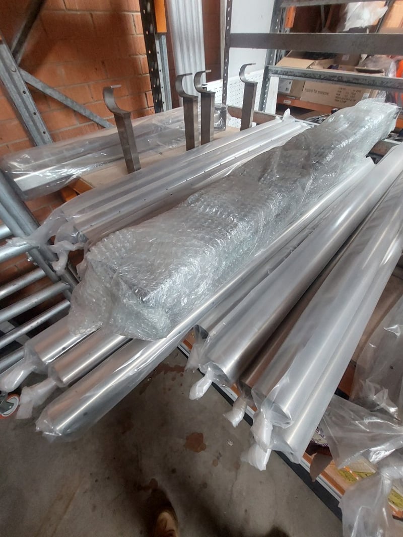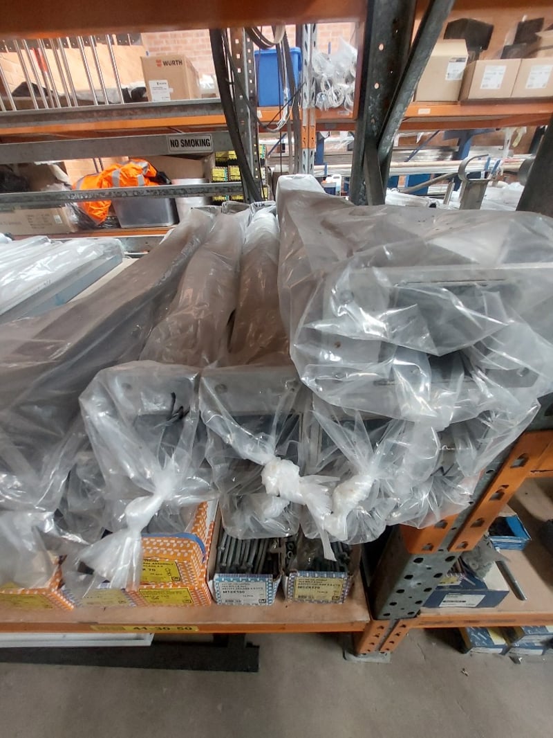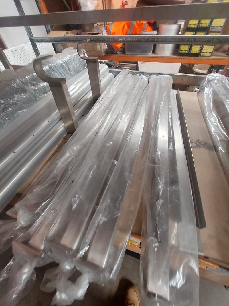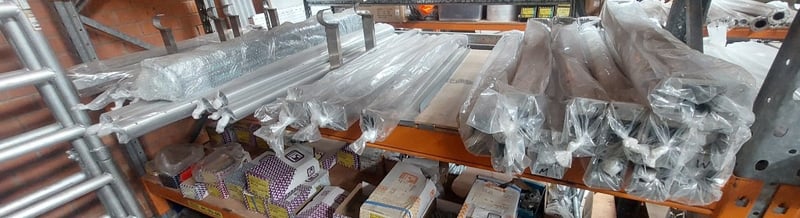 Aluminium extrusions and metal components in original packaging. Includes various profiles such as channels, angles, and structural sections wrapped in protective plastic film. Sold as Lot
