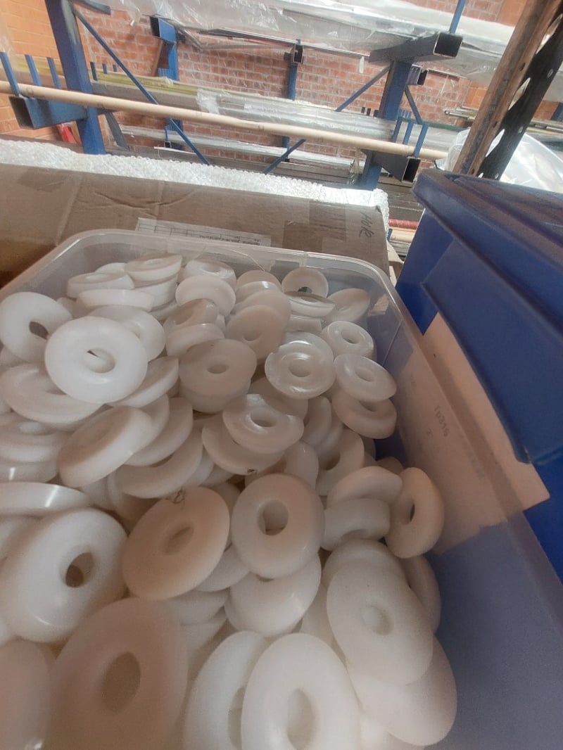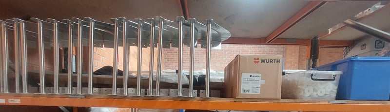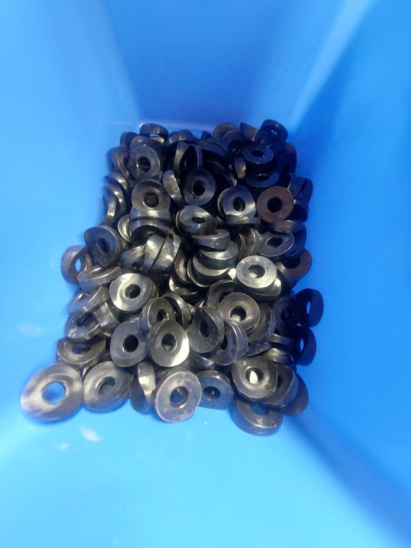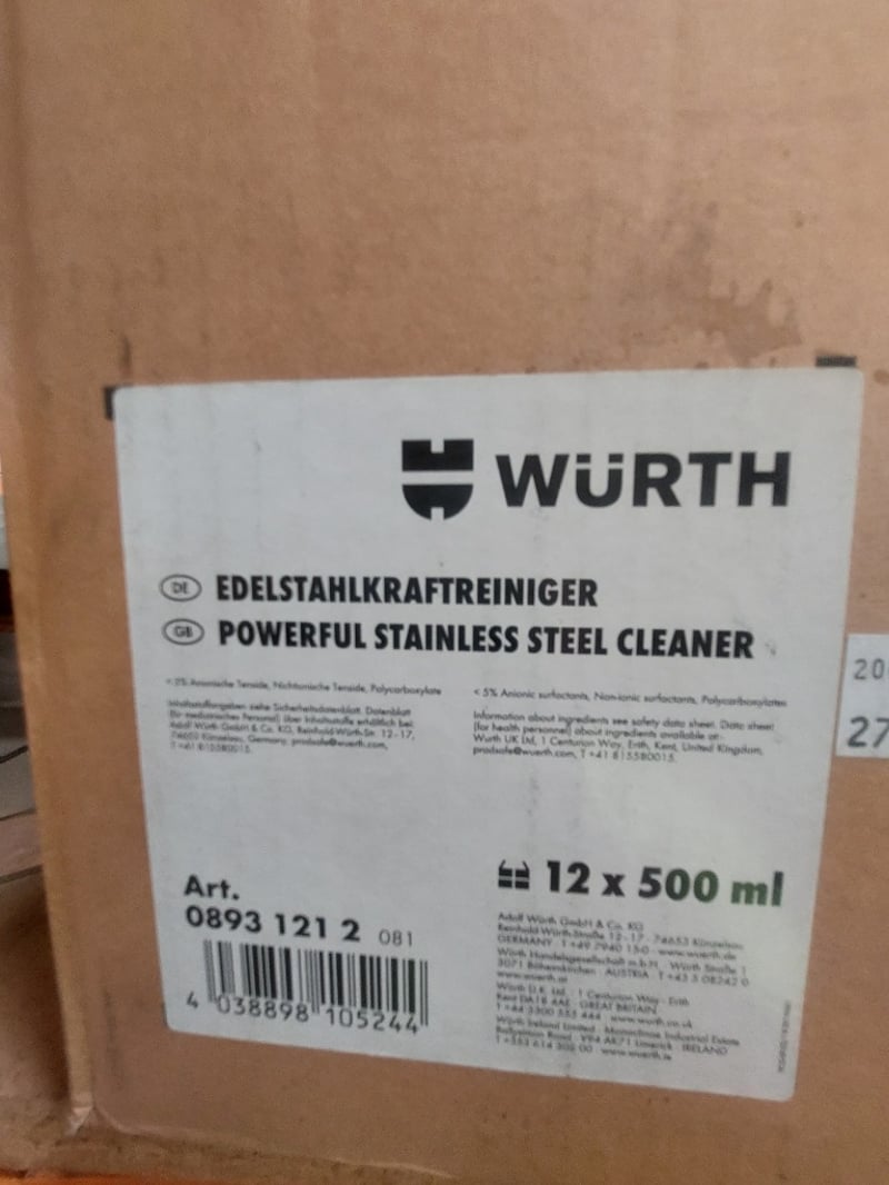 Comprehensive industrial fastener and maintenance supplies lot. Includes extensive collection of stainless steel washers in various sizes (white nylon and metal variants), precision metal washers with black oxide finish stored in blue container, galvanized steel washers, and chrome-plated cylindrical hardware fixtures. Also includes sealed case of 12x500ml Würth Edelstahlkraftreiniger and more .... Sold as Lot