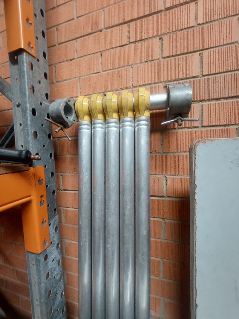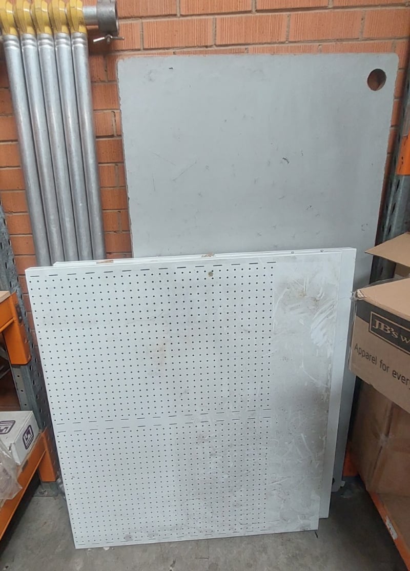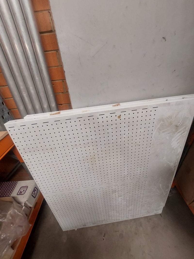Lot comprises white perforated pegboard panels with comprehensive hole pattern spacing, ideal for retail display, workshop organization, or storage solutions. Includes multiple panels in good working condition. Also featured is a brass manifold assembly with five chrome-plated steel pipes featuring brass compression fittings and shut-off valve mechanism.Sold as Lot