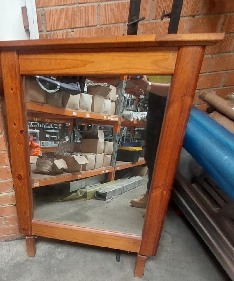 Timber framed Mirror Features wooden frame. Note: signs of wear