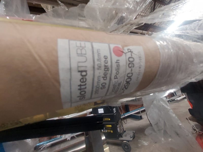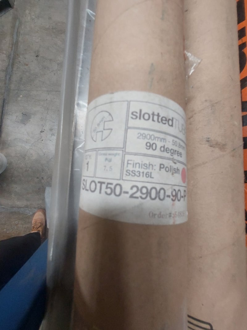 Stainless steel slotted tube stock, industrial-grade tubing suitable for fabrication and construction projects. Specifications include 2900mm length, 50mm diameter, 90-degree slot orientation, and SS316L polish finish and moreSold as Lot