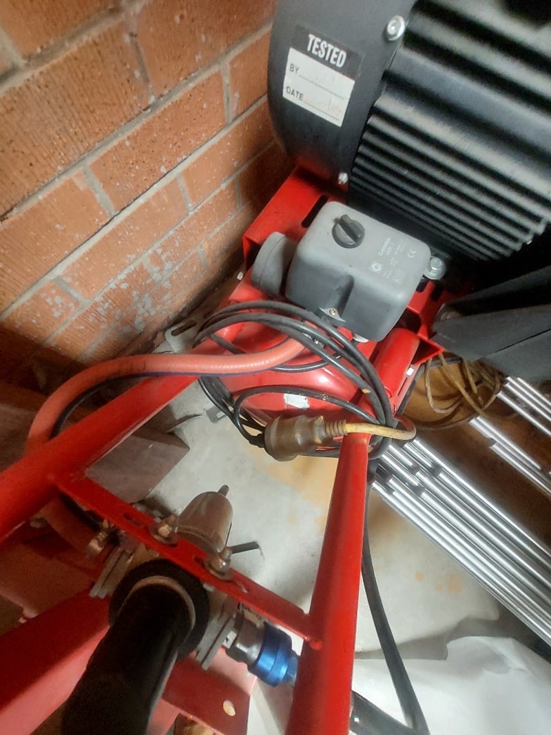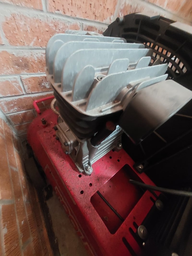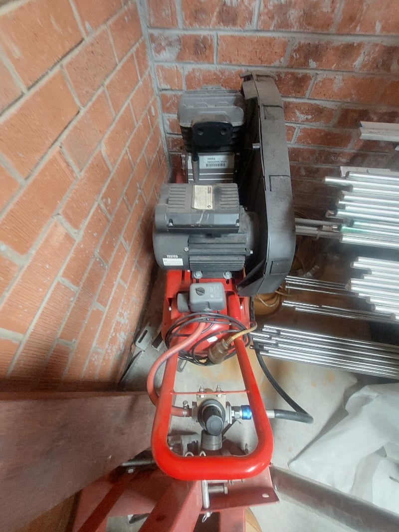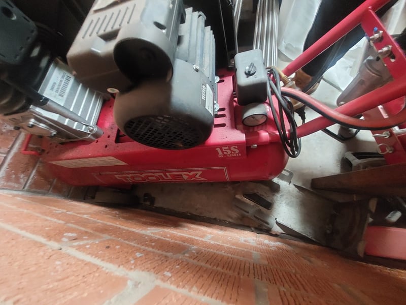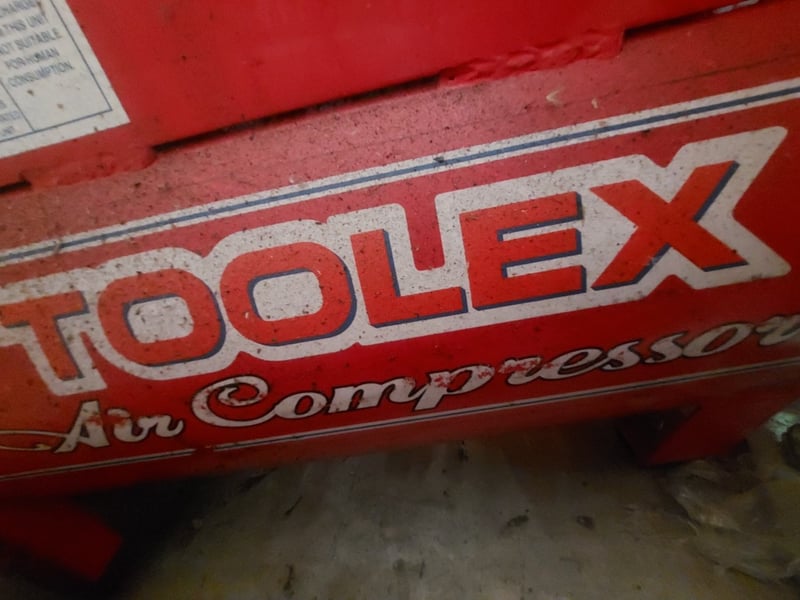 Toolex air compressor, 150L capacity, red painted steel tank with "Air Compressor" text. Features electric motor (model 2800000BMCM001, serial 388900).Note: untested,sold as lot