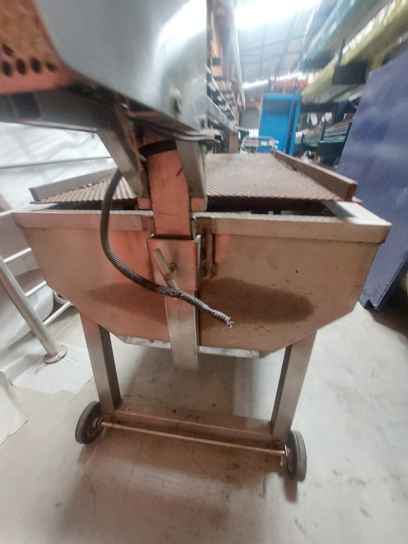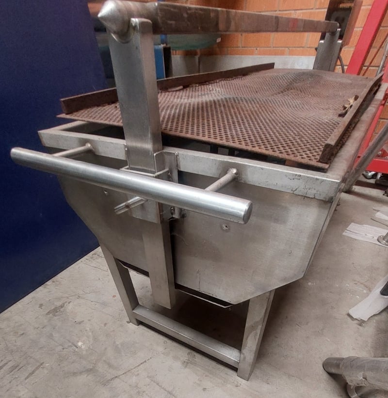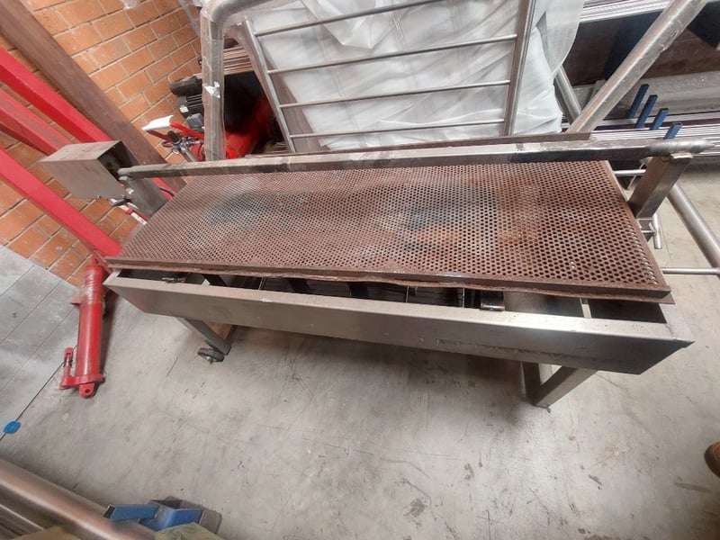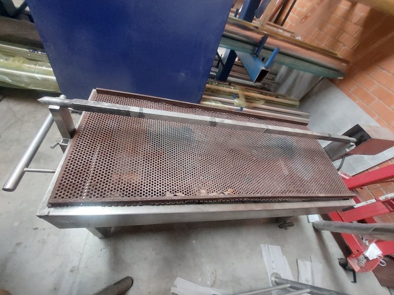 Commercial-grade stainless steel preparation table with perforated metal work surface. Features a removable perforated grill tray insert, sturdy welded construction, and mobile base with wheels for portability. Note: untested,signs of wear