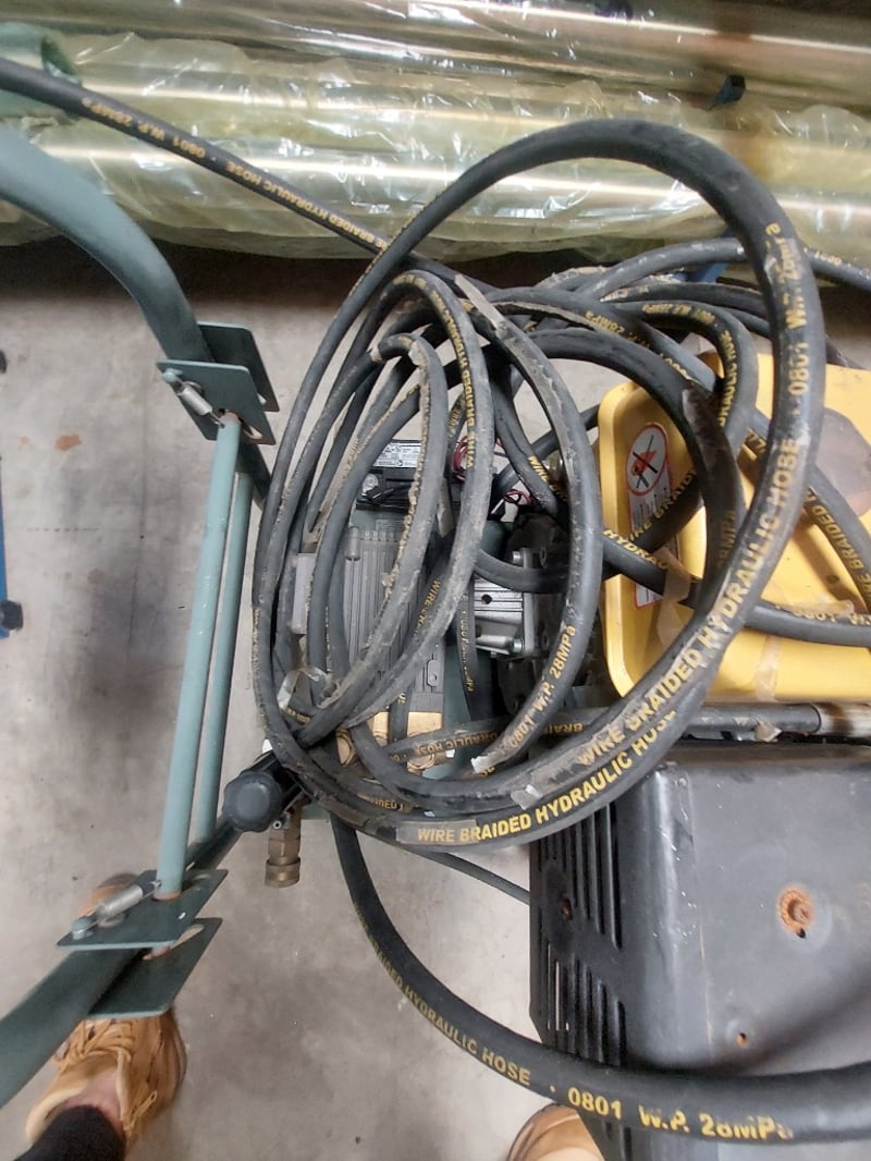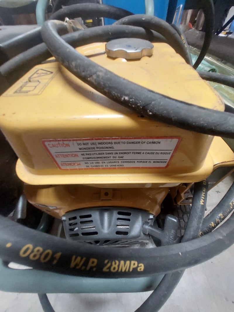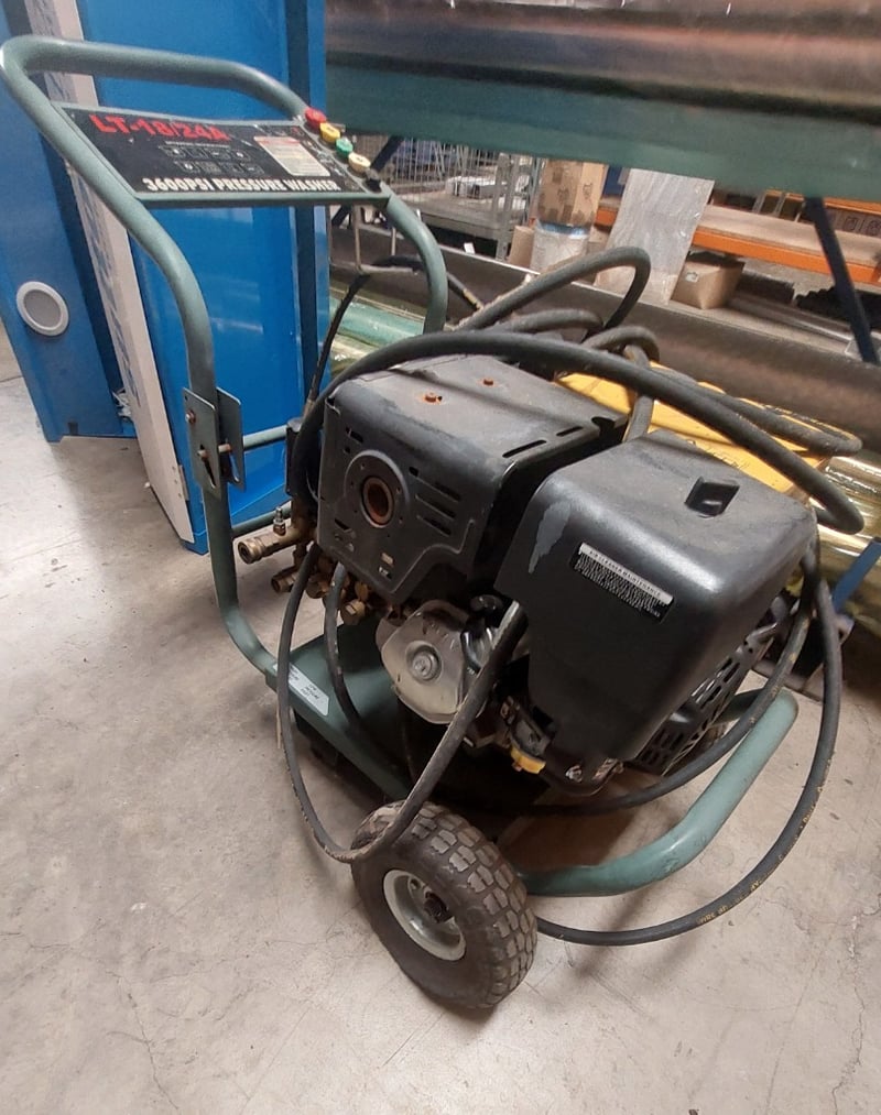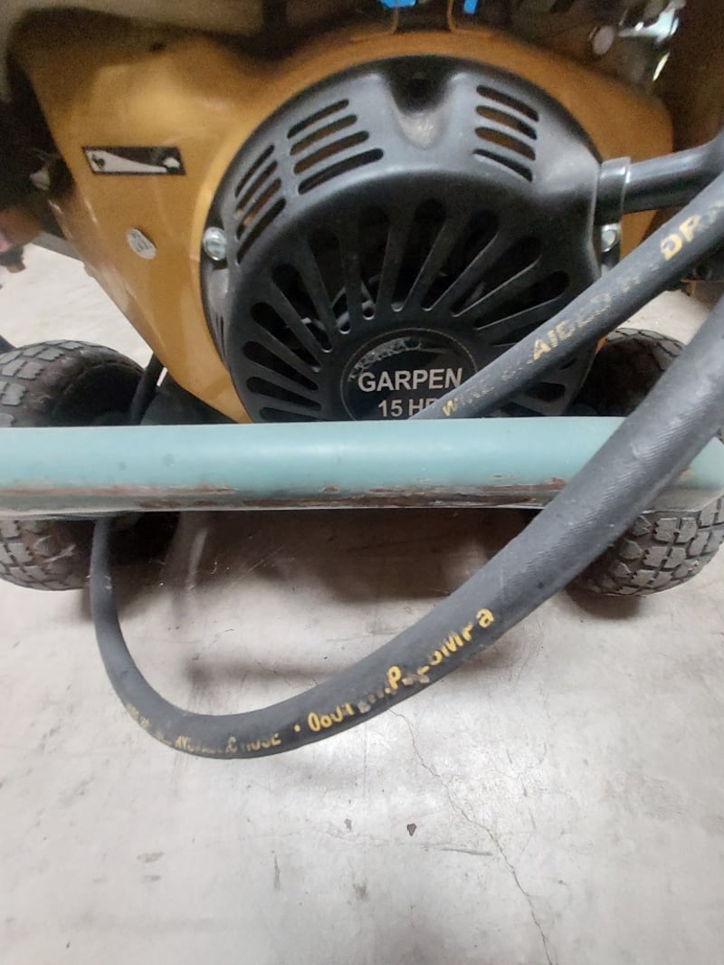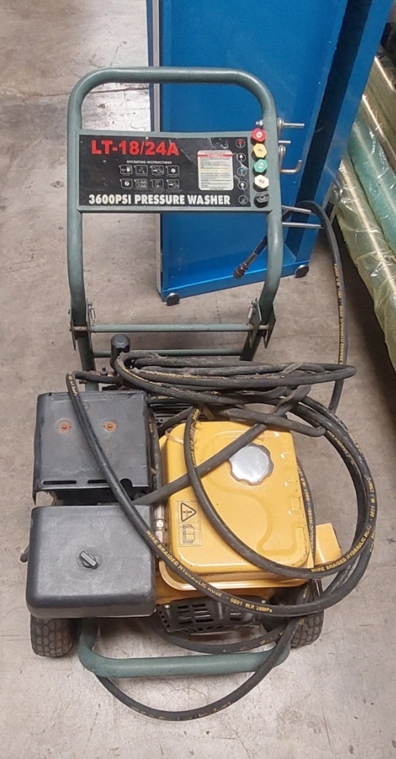 LT-18/24A petrol-powered pressure washer unit featuring a 3600 PSI output capacity. The system comprises a Garpen 15 HP engine mounted on a mobile frame with pneumatic tyres, connected via wire-braided hydraulic hose assemblies (rated 0801 W.P. 28MPa) to a pressure-washing control panel. Control panel displays red, yellow, and green operational indicators,includes trolley.Note: untested, signs of wear