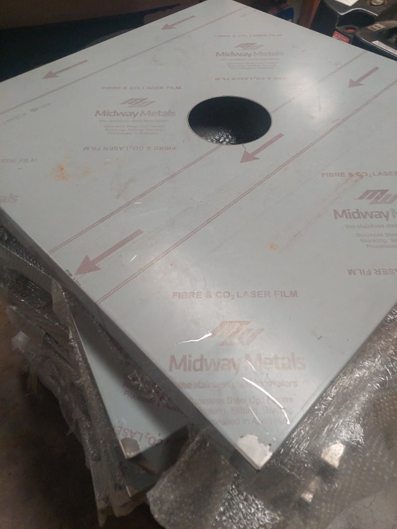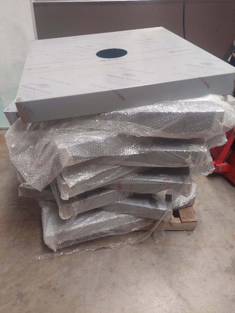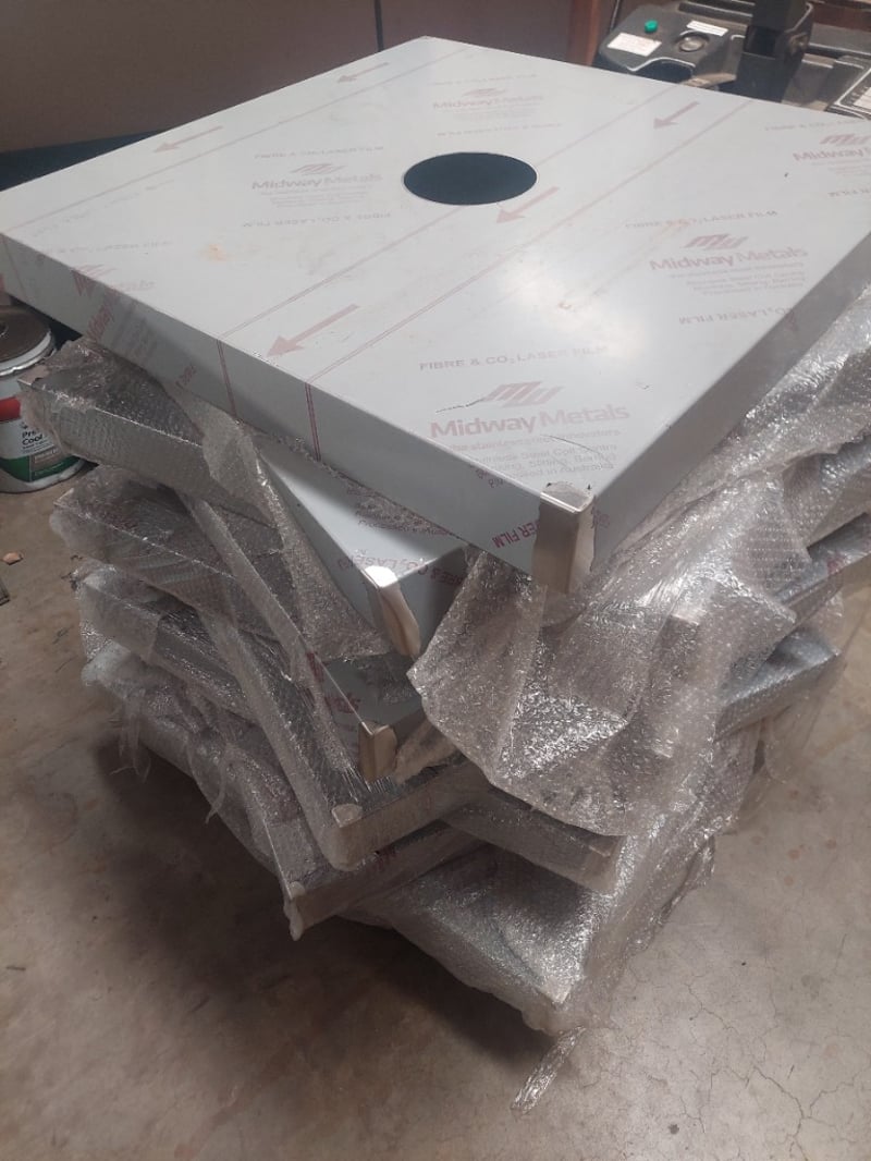 Pallet of laser-cut metal components from Midway Metals, featuring precision-engineered stainless steel parts with protective bubble wrap packaging. The lot includes multiple laser-cut panels with central circular apertures and printed branding. Sold as Lot