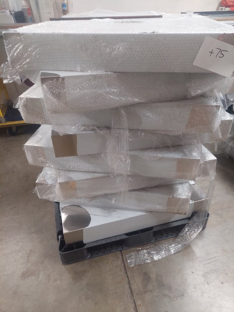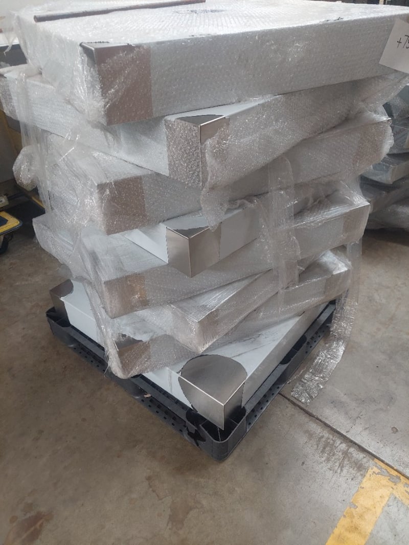 Pallet of laser-cut metal components from Midway Metals, featuring precision-engineered stainless steel parts with protective bubble wrap packaging. The lot includes multiple laser-cut panels with central circular apertures and printed branding.