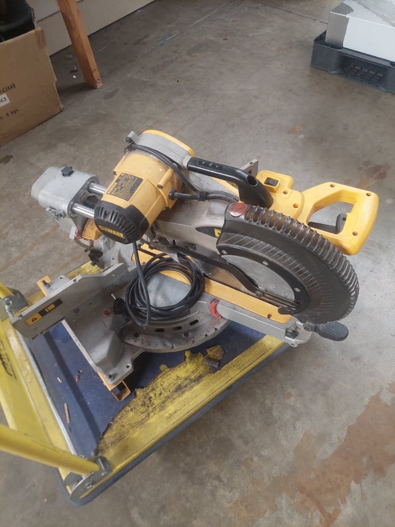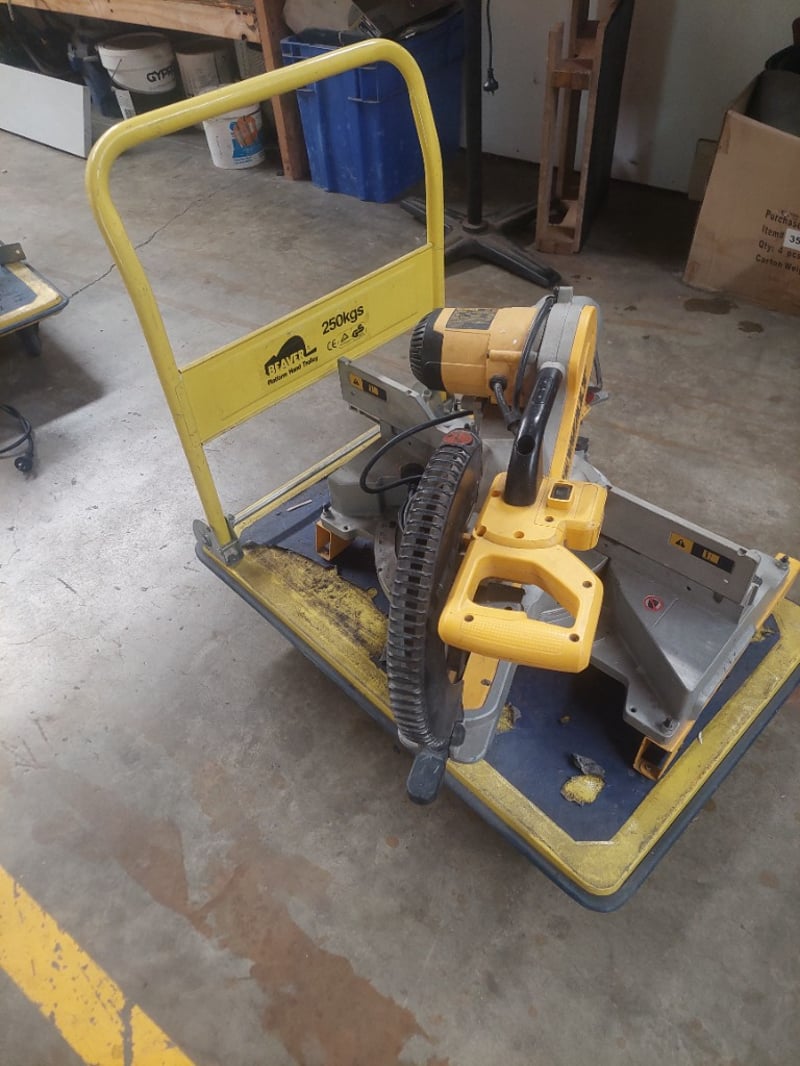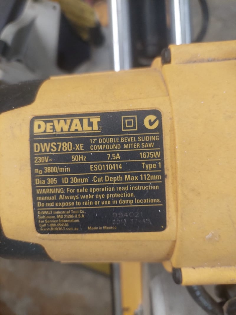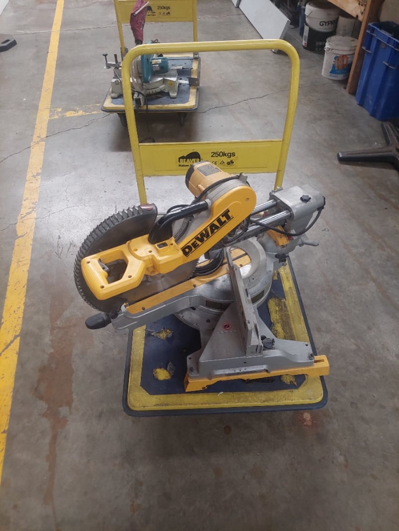 DeWALT DWS780-XE 12" Double Bevel Sliding Compound Miter Saw mounted on a yellow portable work station base rated for 250kg capacity. The miter saw features a 1675W motor operating at 3800/min with 230V 50Hz power input. Specifications include 305mm blade diameter with 30mm bore, maximum 112mm cutting depth, and double bevel sliding compound functionality. The unit is equipped with a dust collection hose and mounted securely to the yellow steel base frame with carrying handles. Note: untested,signs of wear