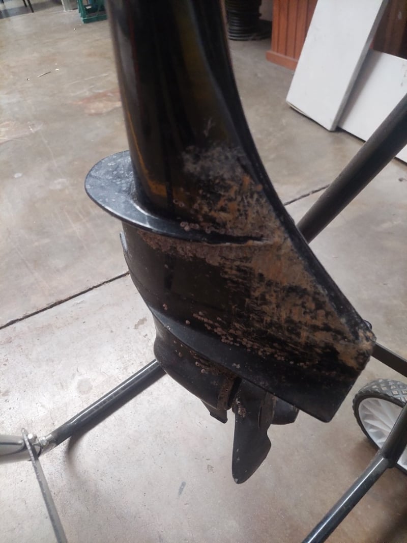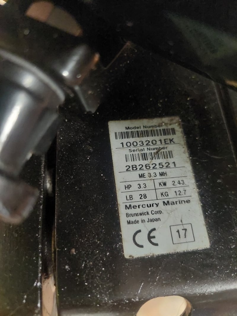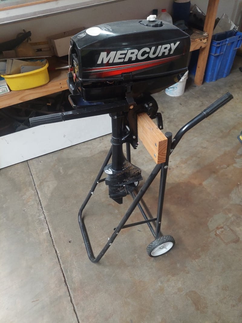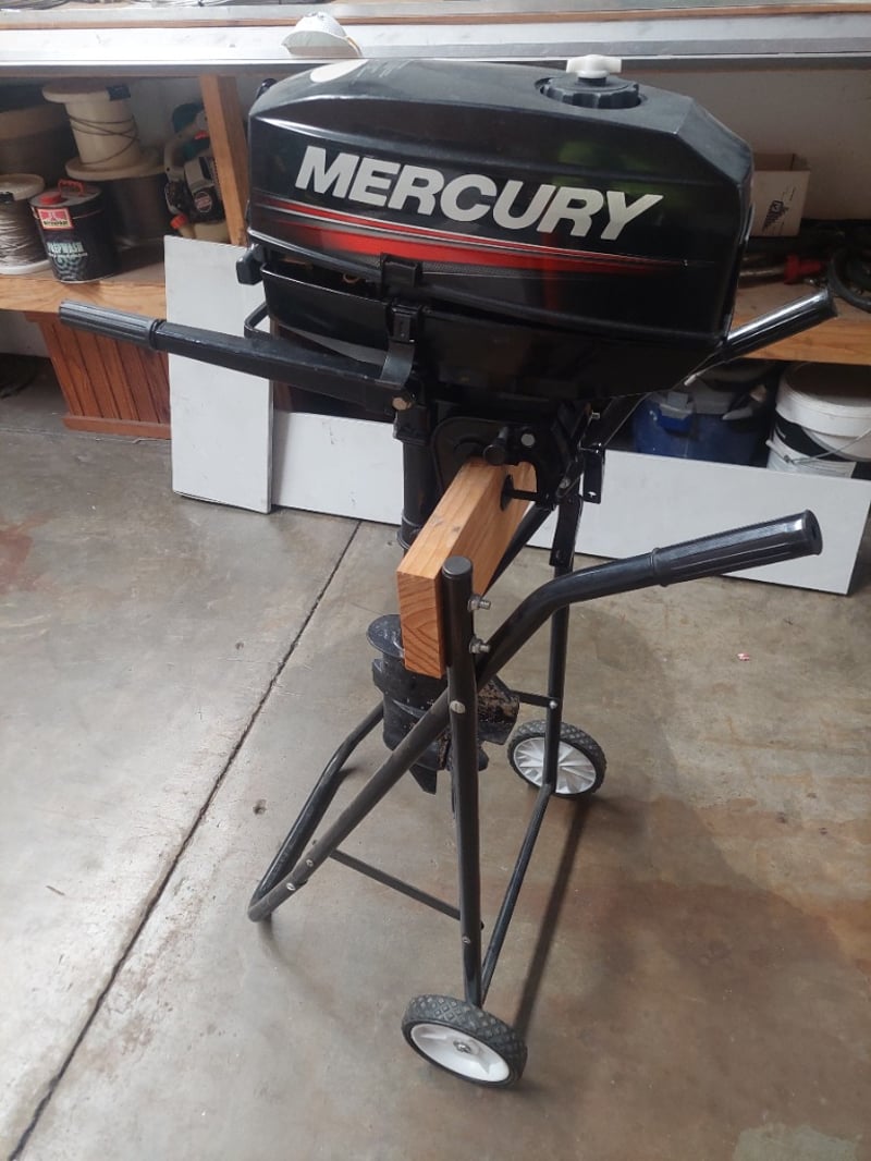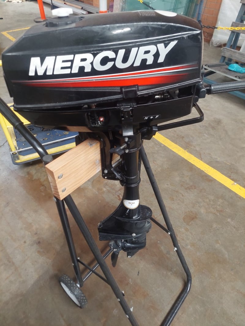 Mercury 3.3HP portable outboard motor mounted on custom stand with wooden support beam. Model 1003201EK, Serial 2B262521. 2-stroke engine, 2.43KW output, 12.7kg displacement. Features red stop button control, manual pull-start ignition, and tilt/trim capability. Includes adjustable tripod stand with wheels for portability and storage. Motor shows visible salt-water corrosion on lower unit and propeller housing, indicating marine use. Fitted with wooden beam support for secure mounting. Sold as LotNote: untested,signs of wear