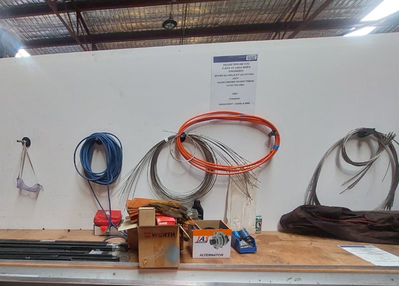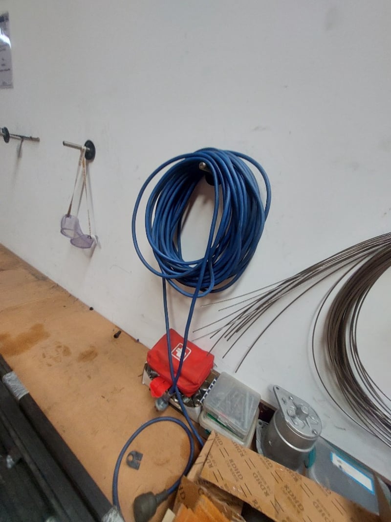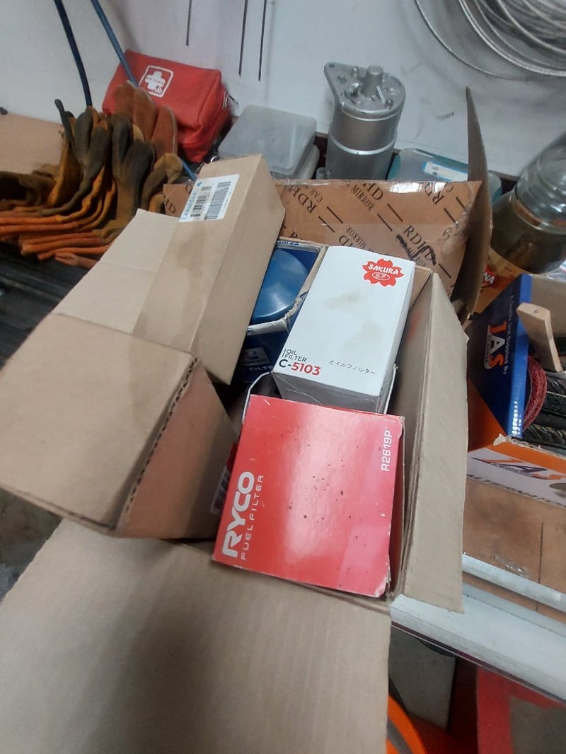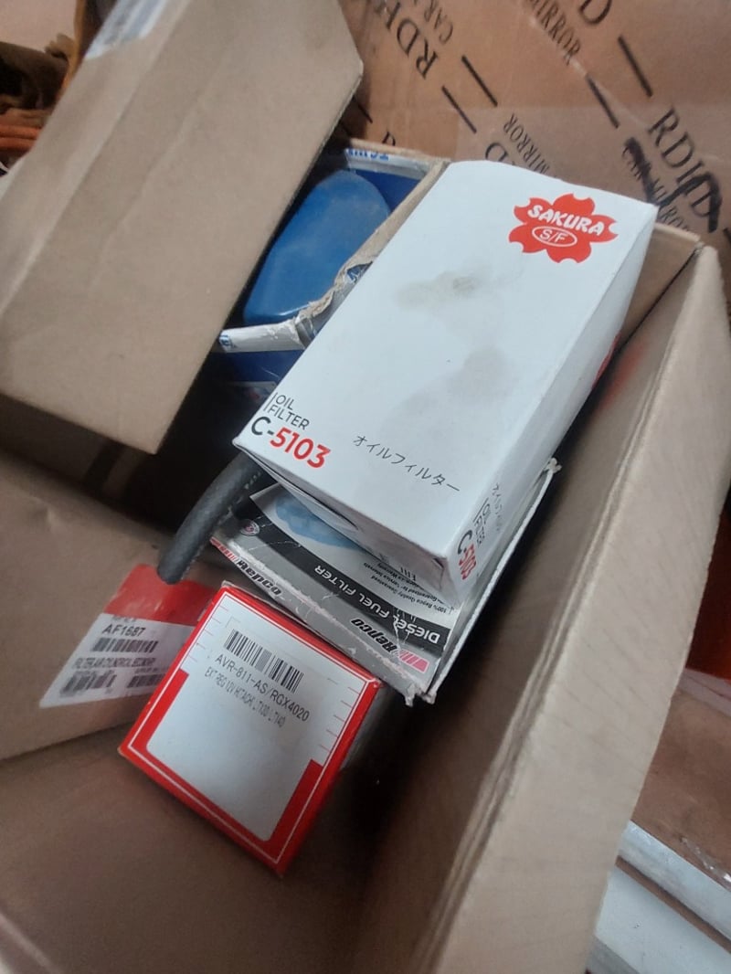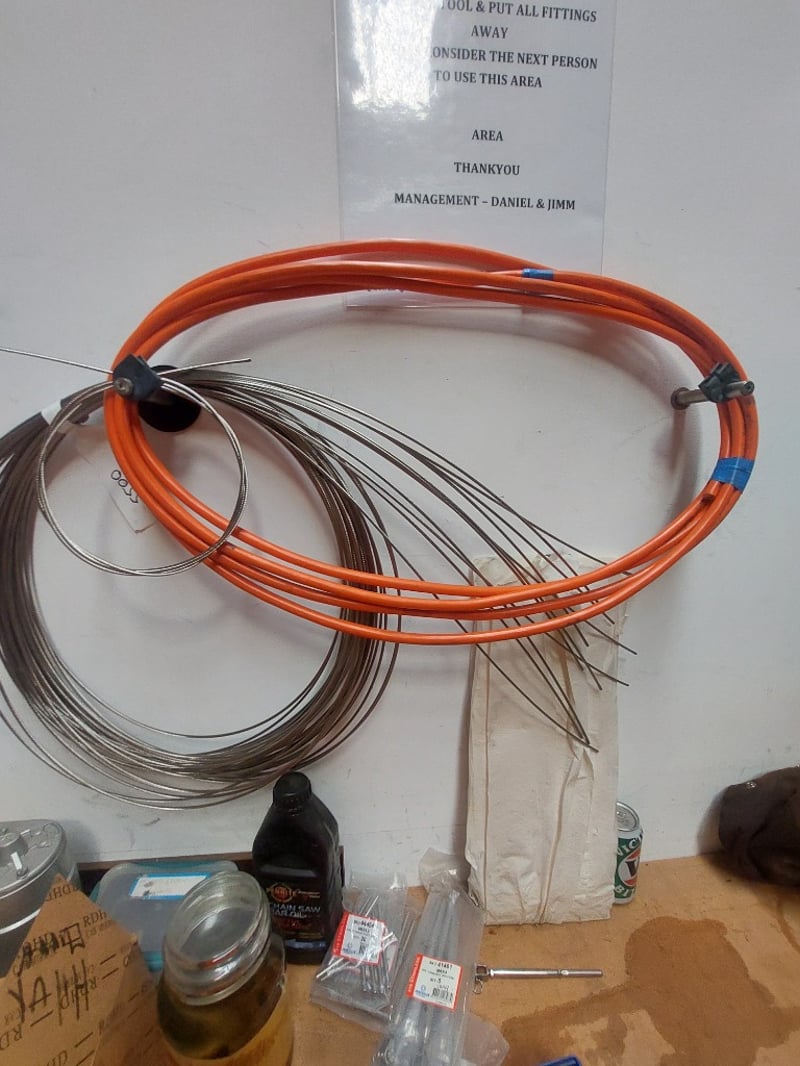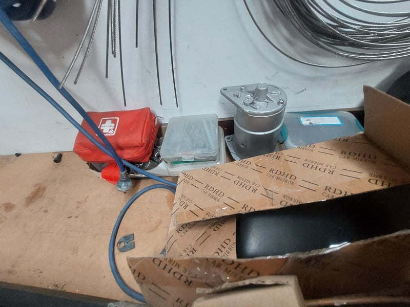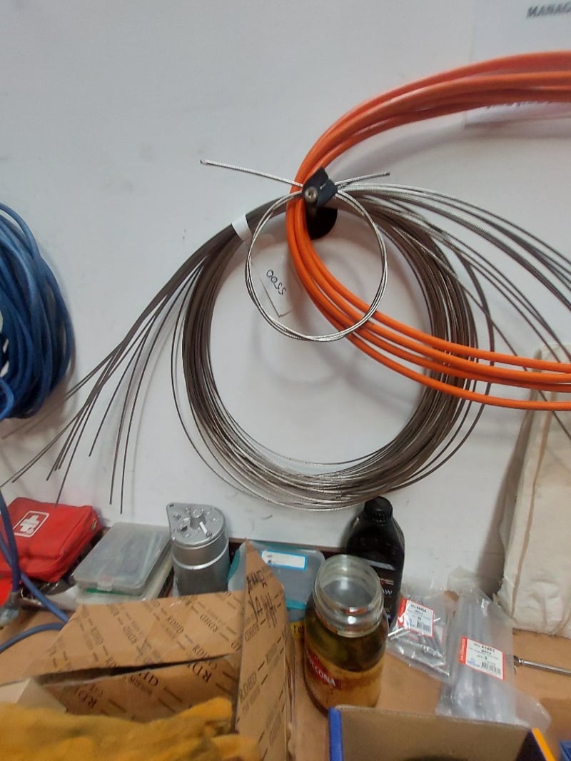 Comprehensive automotive electrical and mechanical components lot including various copper and steel cables/wires in orange, blue, and grey colorways (some coiled, some straight), electrical connectors with black terminals, a Würth branded cardboard box containing assorted fittings, 103), and more .... Sold as Lot