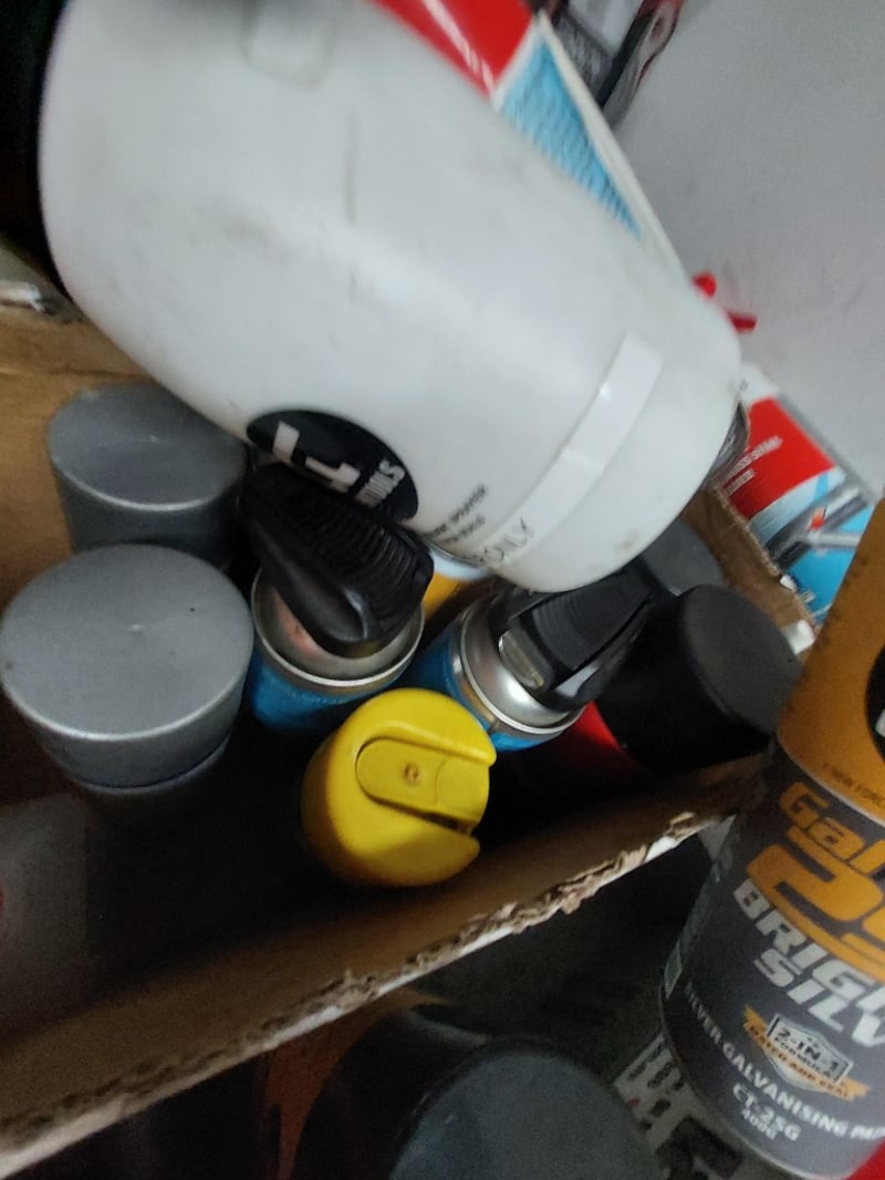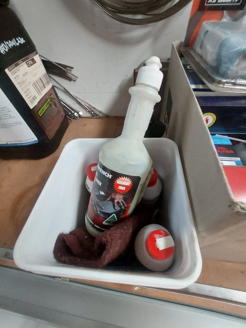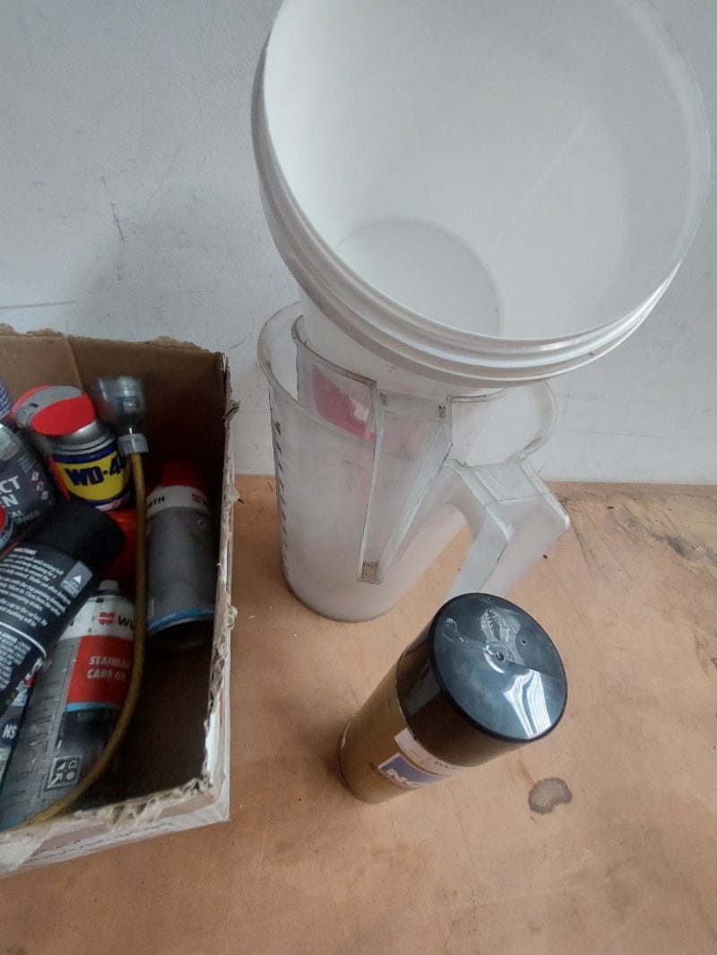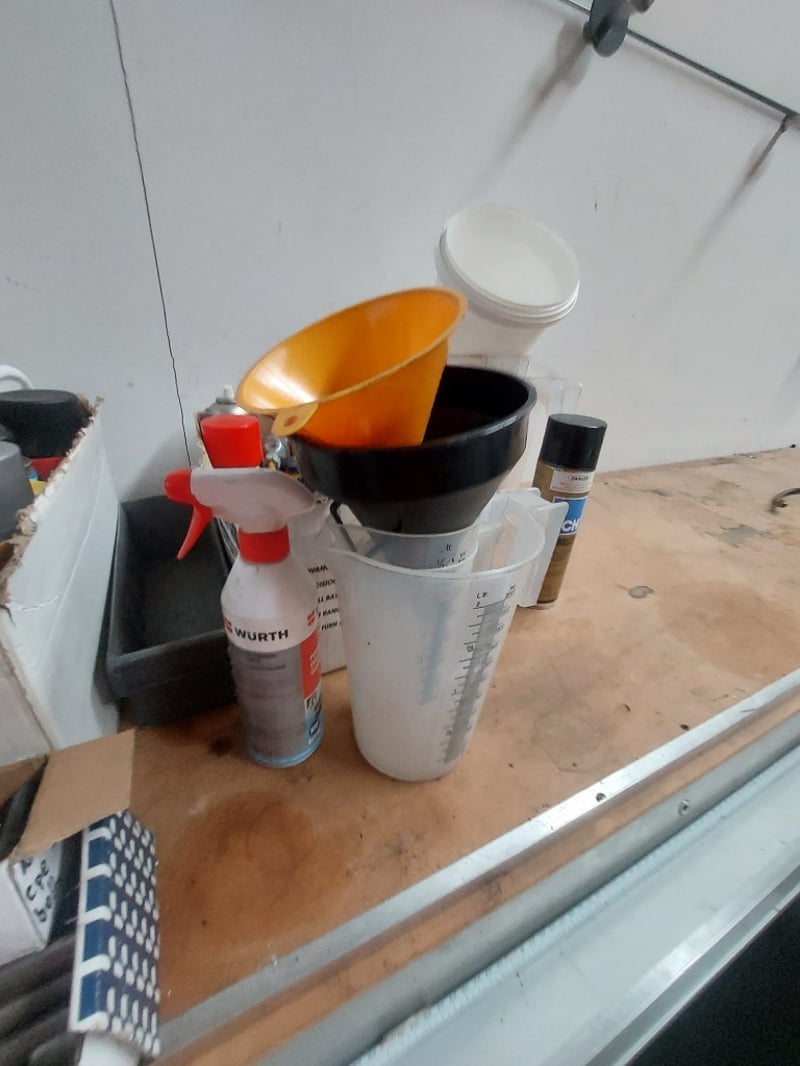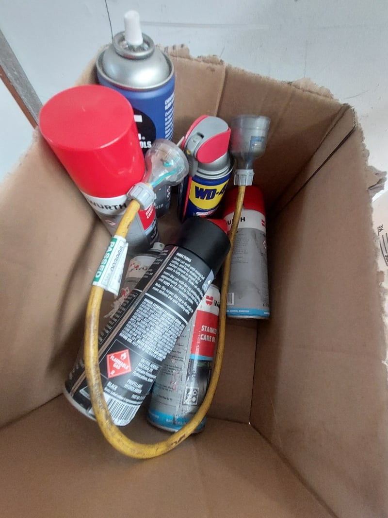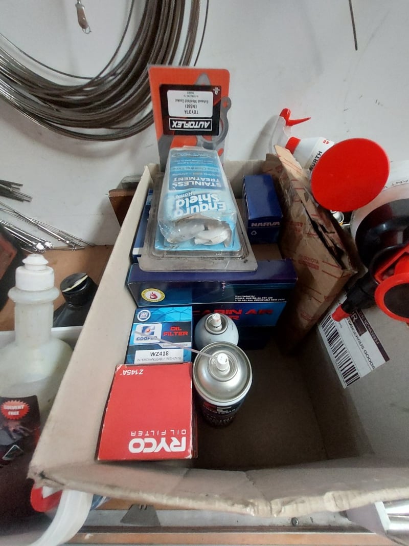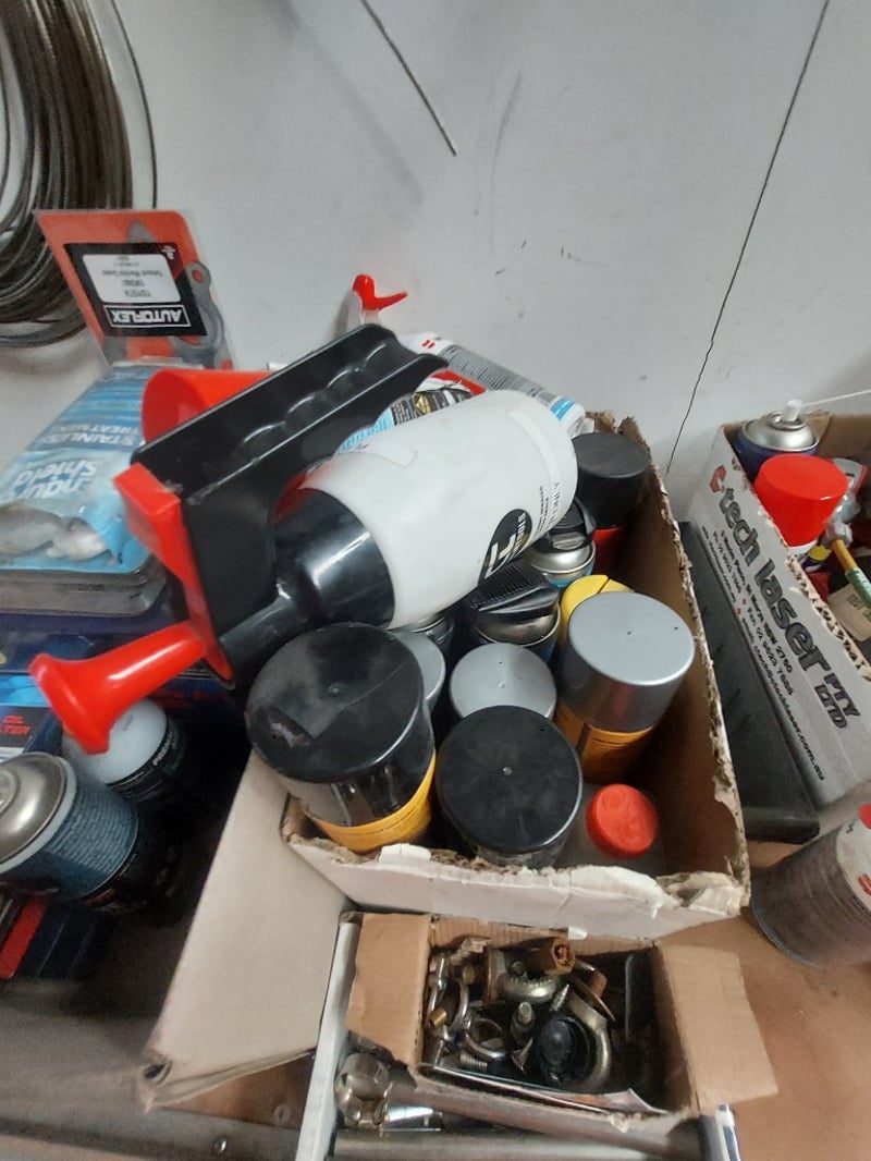 Comprehsive Lot includes (multiple spools of various gauges),aerator equipment, cleaning supplies (Wurth brand cleaner), paint supplies (spray paint cans in red and black), solvent-free cleaners, and more ... Sold as Lot