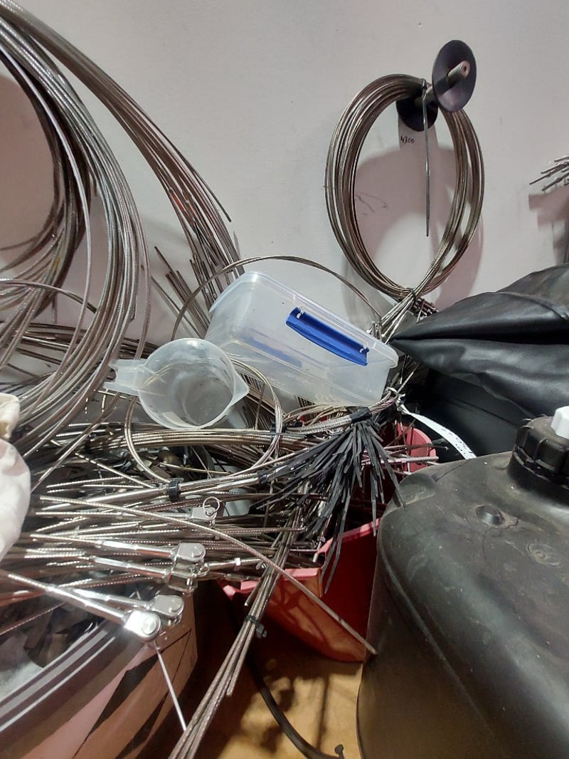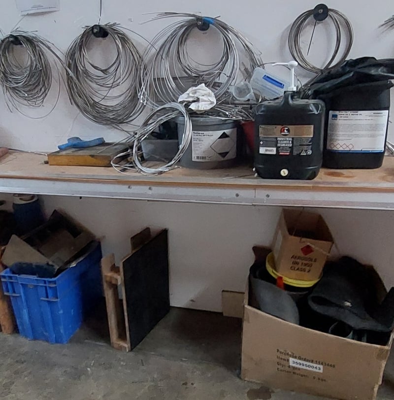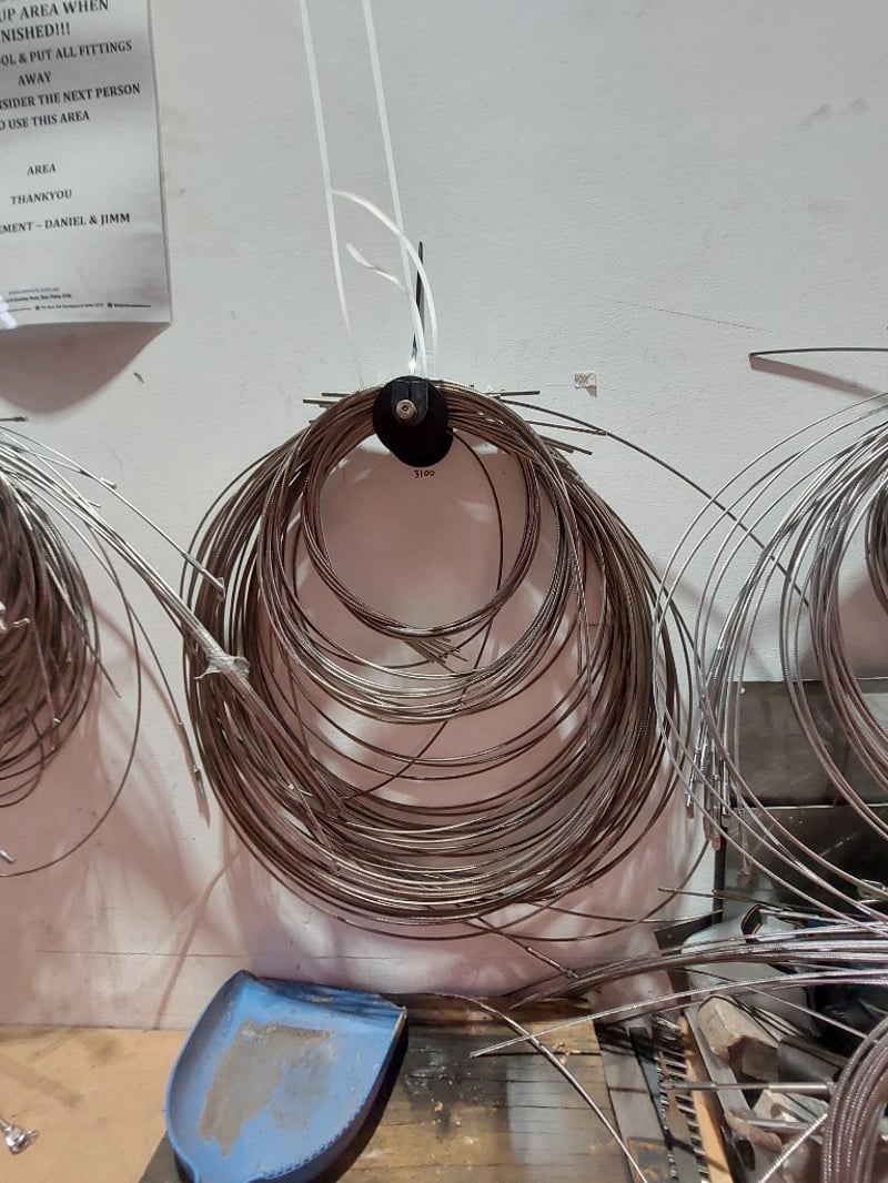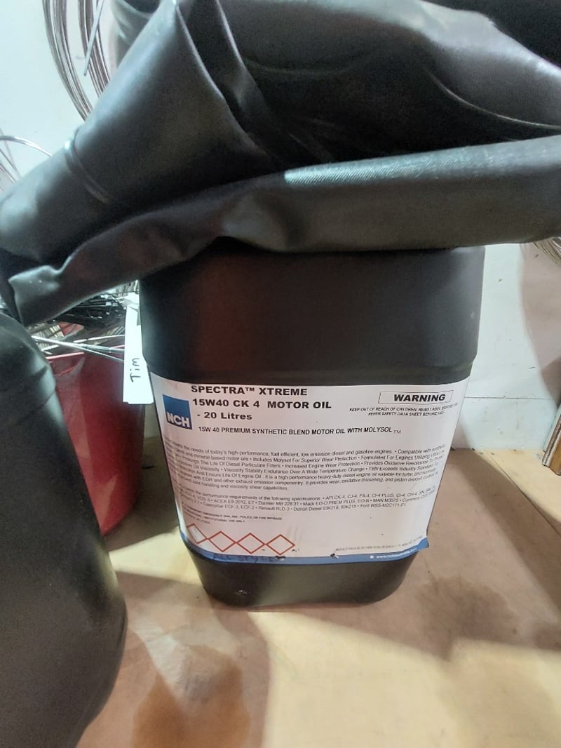 Comprehensive plumbing and HVAC contractor's workshop inventory lot. Collection includes extensive stainless steel coiled tubing in various diameters (hanging storage), multiple 20-litre industrial fluid containers including premium synthetic motor oil (Spectra Xtreme 15W40 CK-4), Cresttools industrial cleaner & degreaser, and aerosol products (UN1950 Class 2) and more ..... Sold as Lot Note: untested, signs of wear
