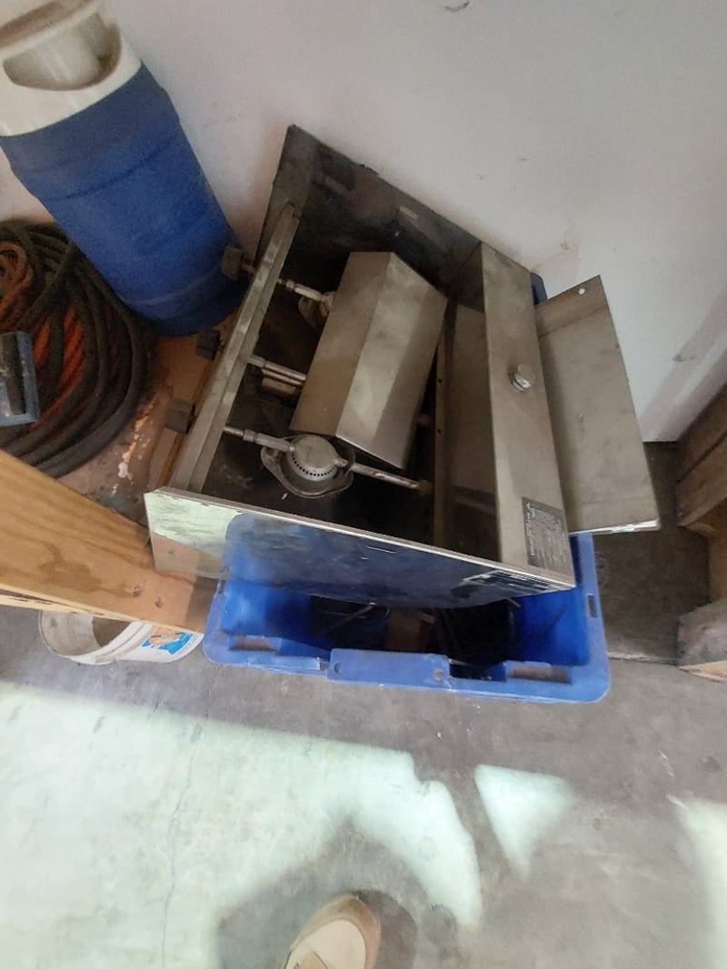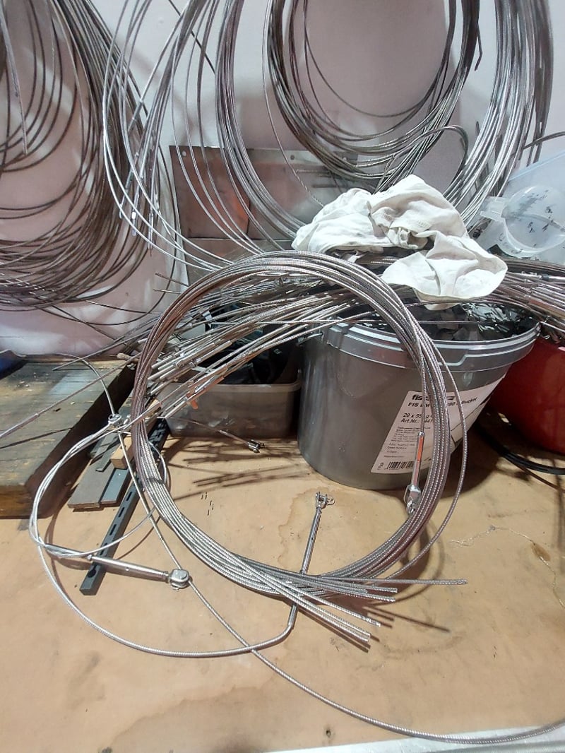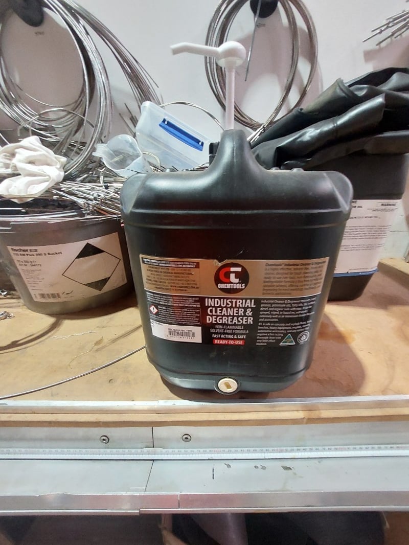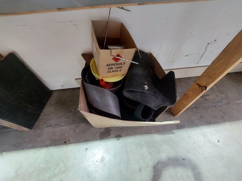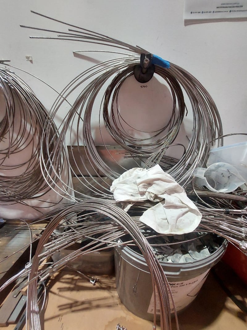 Comprehensive plumbing and HVAC contractor's workshop inventory lot. Collection includes extensive stainless steel coiled tubing in various diameters (hanging storage), multiple 20-litre industrial fluid containers including premium synthetic motor oil (Spectra Xtreme 15W40 CK-4), Cresttools industrial cleaner & degreaser, and aerosol products (UN1950 Class 2) and more ..... Sold as Lot Note: untested, signs of wear