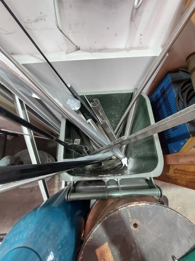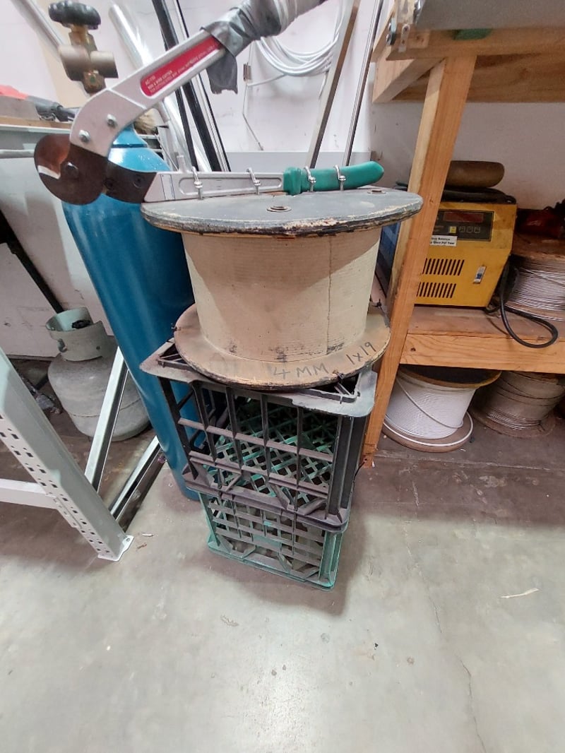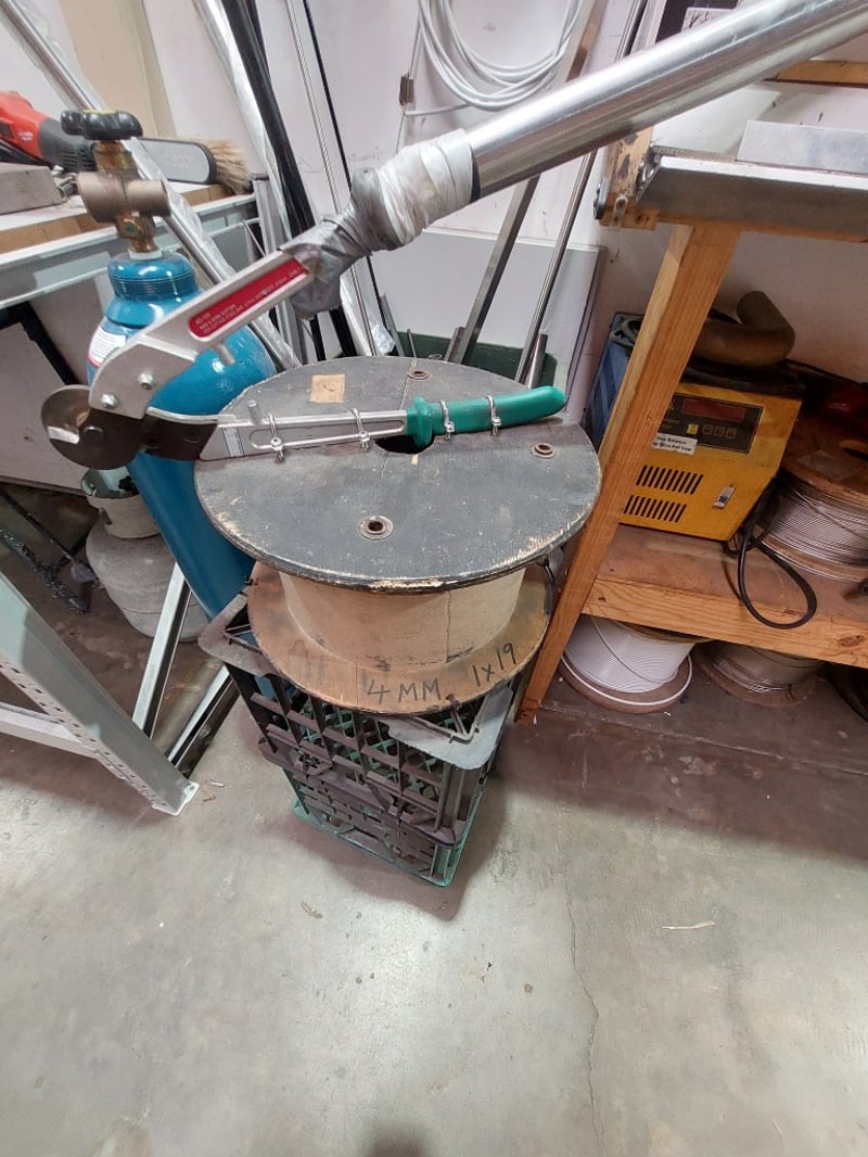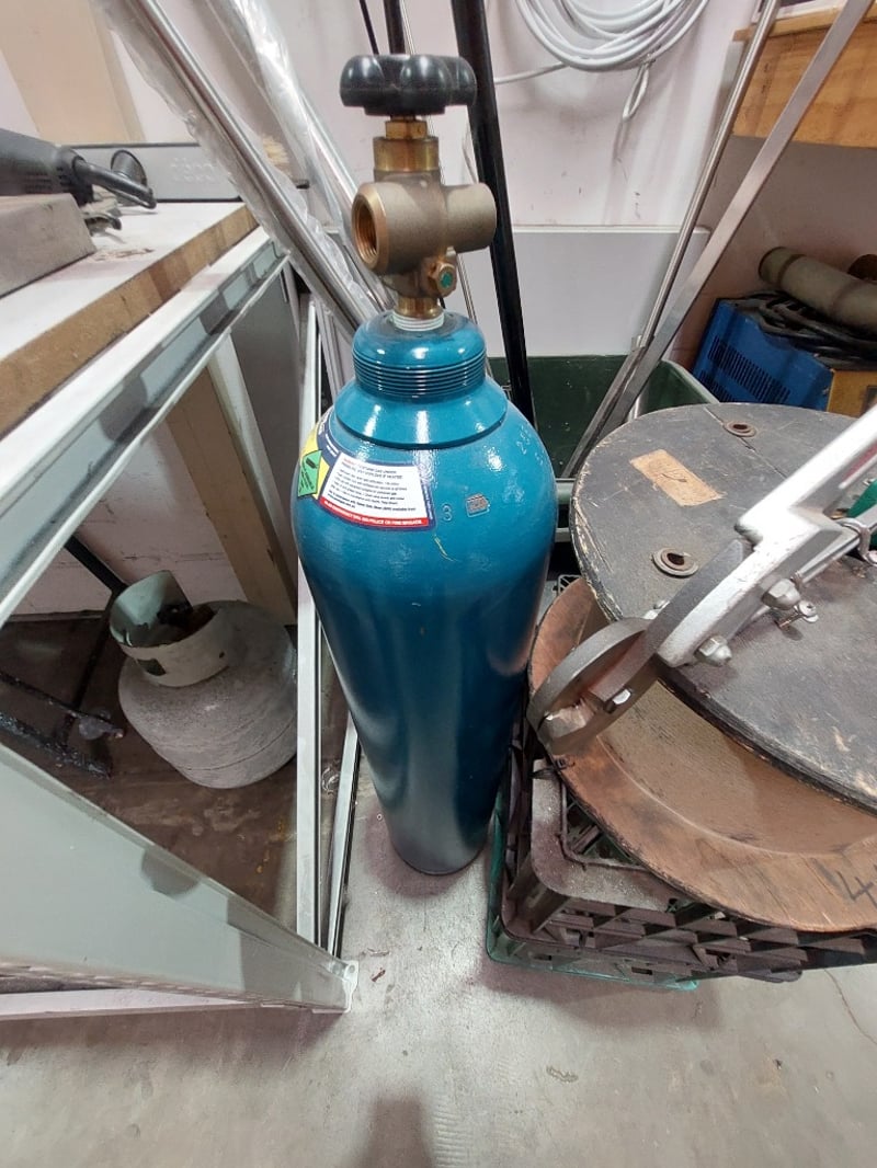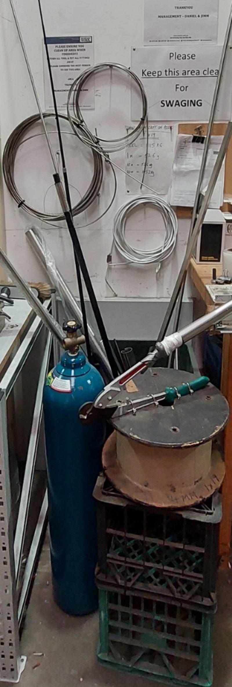 Professional swaging workstation setup featuring a blue compressed gas cylinder with dual-stage regulator and control valve and more ..... Sold as Lot Note: untested,signs of wear