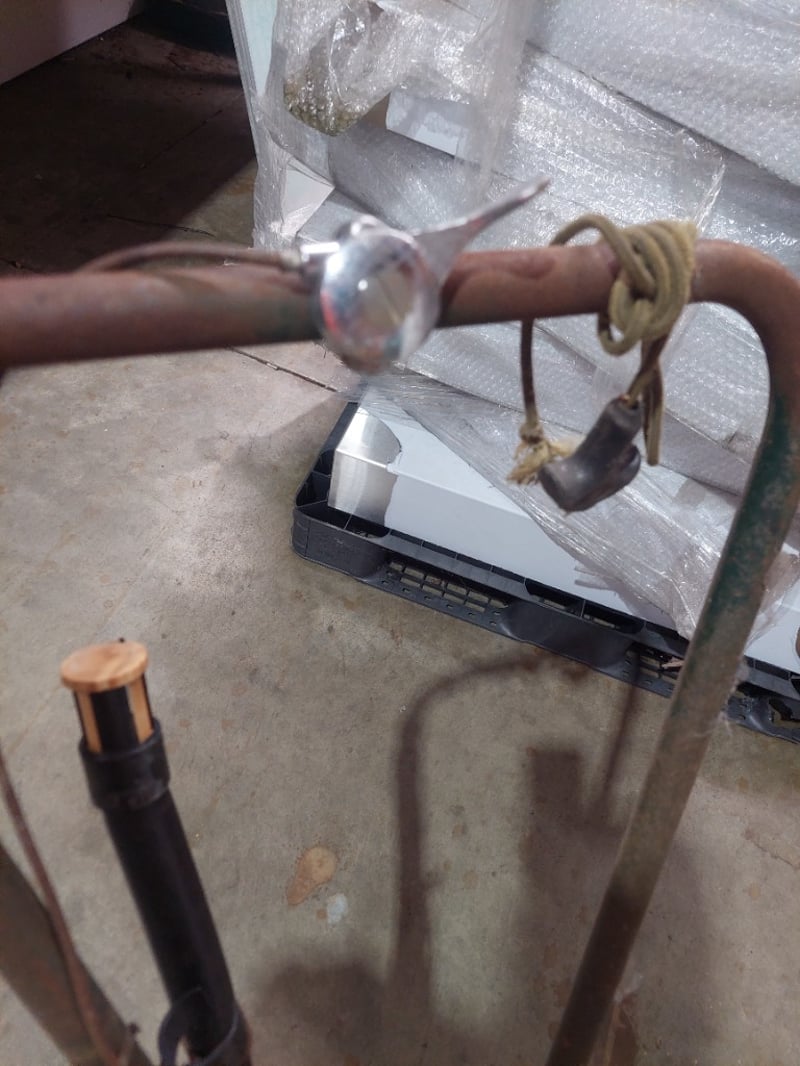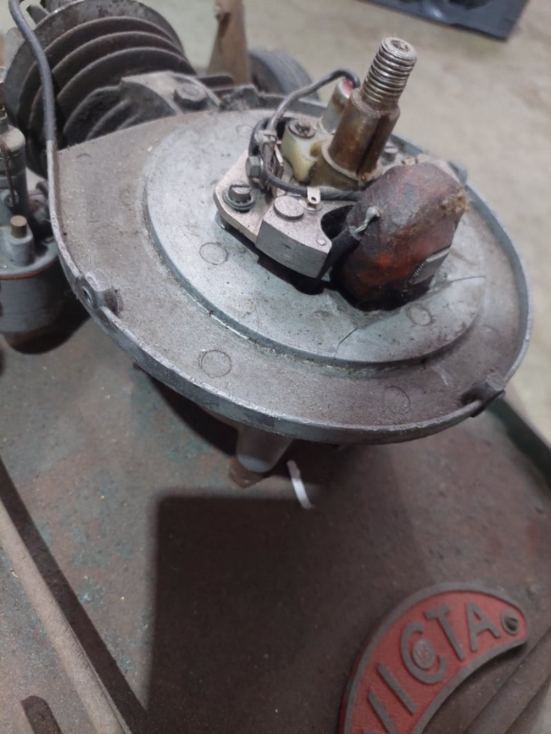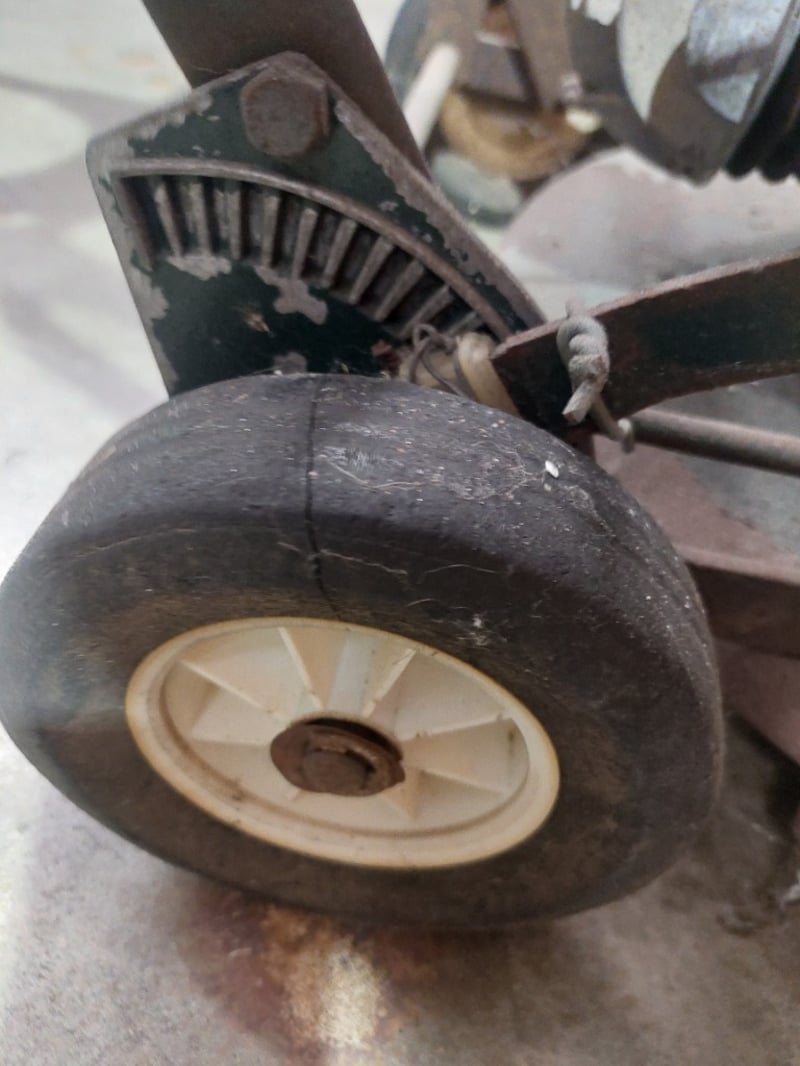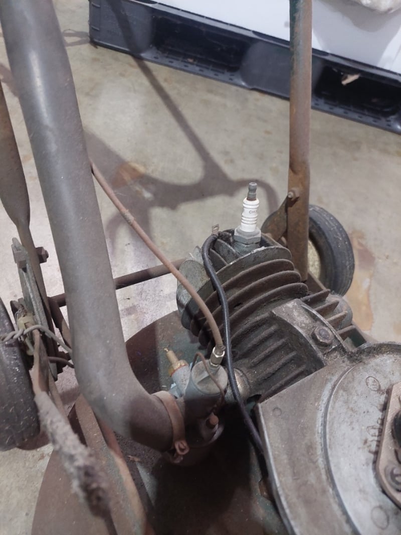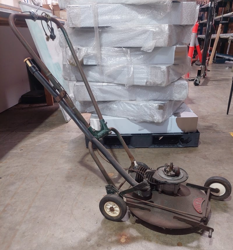 Victa lawn mower, appears to be mid-20th century model. Features distinctive red Victa badge on dark metal housing. Missing PiecesNote: untested,signs of wear