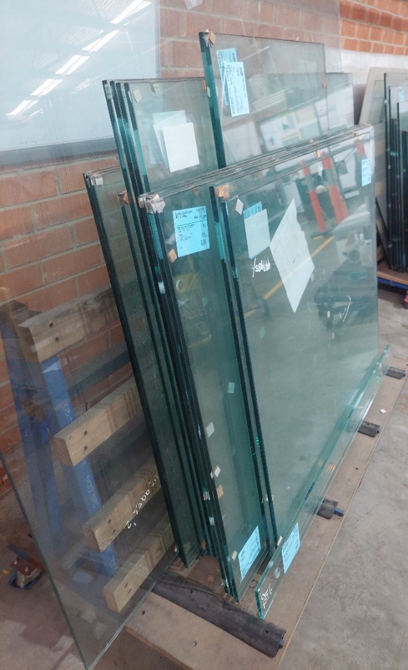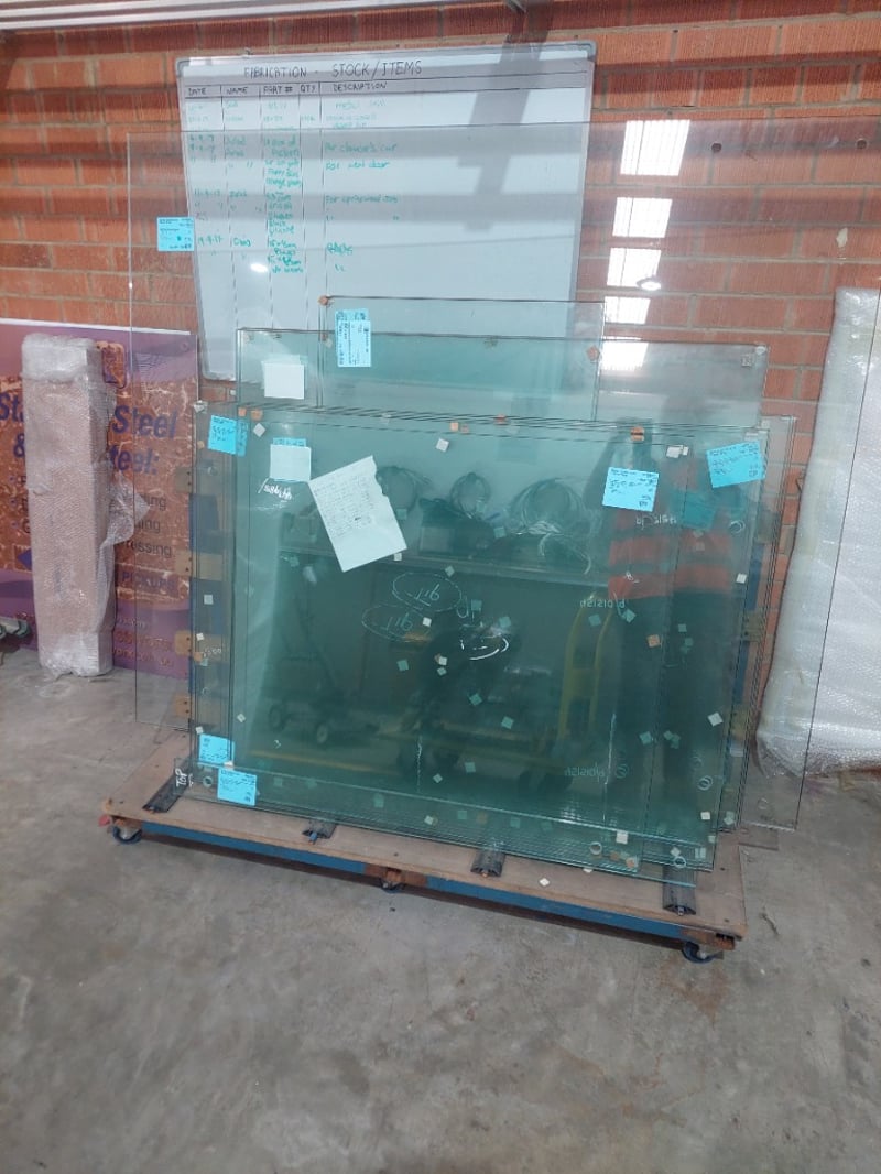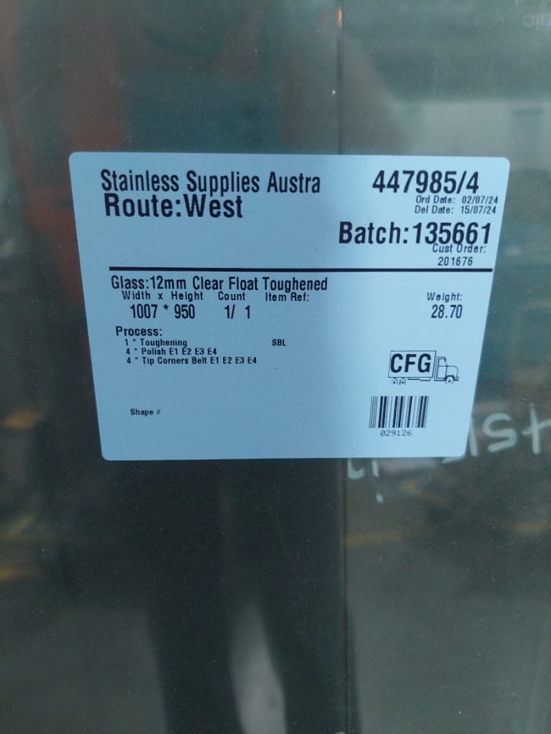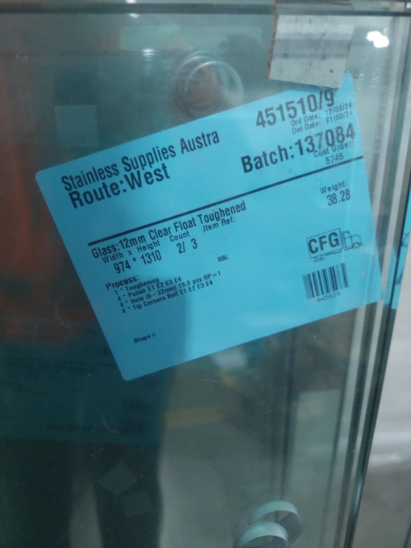 Comprensive Lot of 12mm clear float toughened glass panels from Stainless Supplies Austra, Route West. Includes multiple pieces with various dimensions and specifications. Sold as Lot