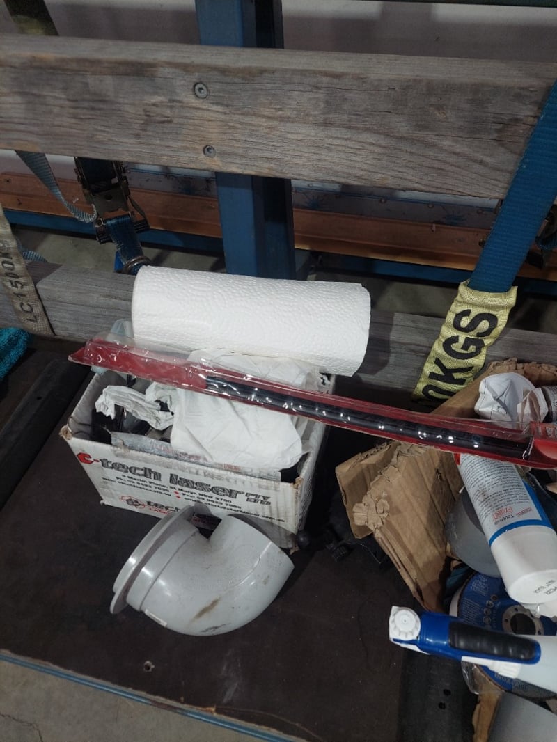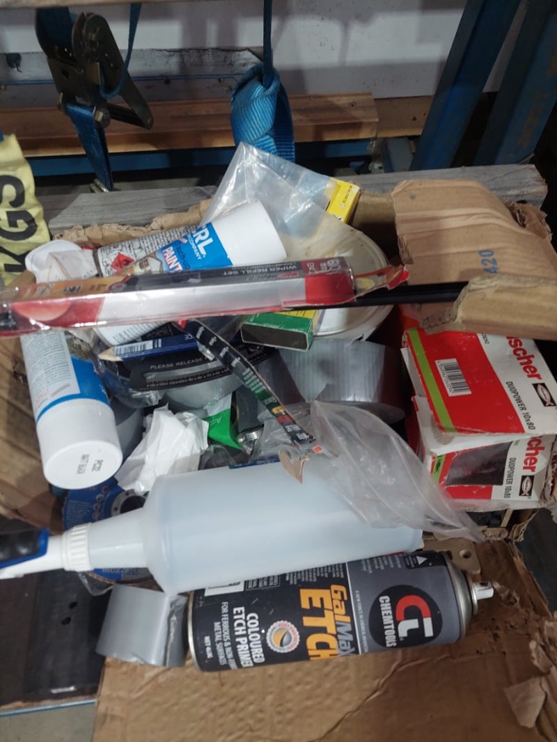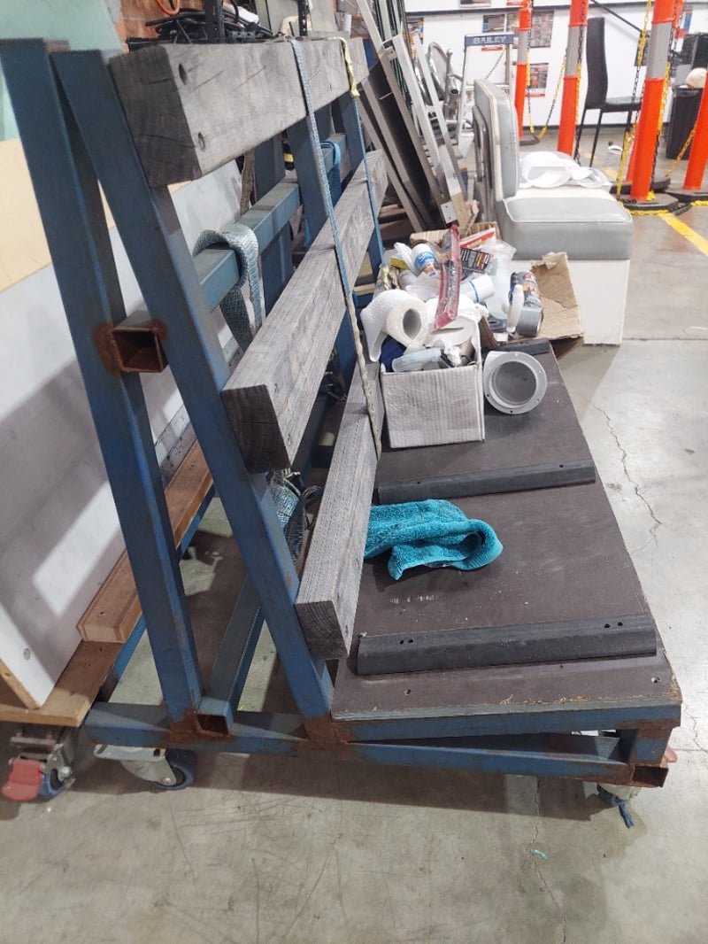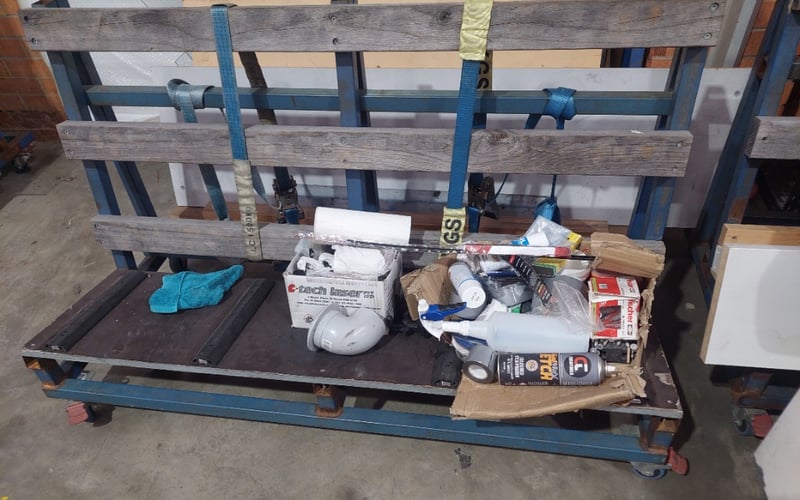 Heavy-duty industrial work bench featuring a robust blue steel frame with wooden top rails and a dark rubber work surface. The unit includes integrated storage shelving with wooden supports and comes equipped with a comprehensive collection of supplies and consumables. Visible inventory includes paint rollers, drop cloths, cleaning materials, caulk, sealants, paint containers, adhesives, paper towels, plastic sheeting, and various finishing materials. The bench is mounted on red castors for mobility. Sold as Lot