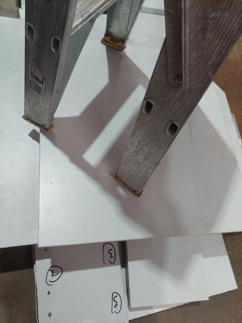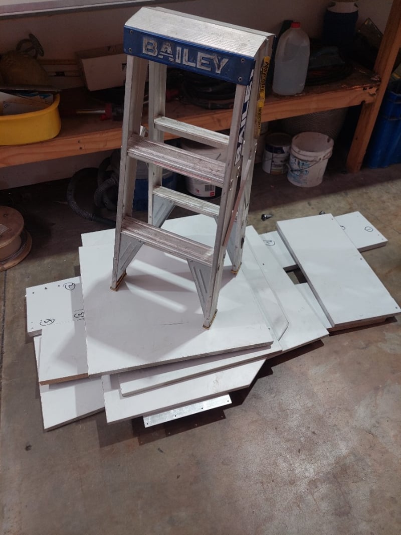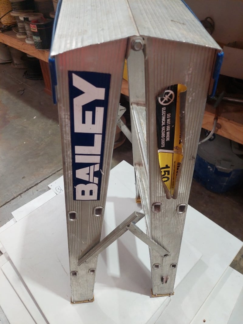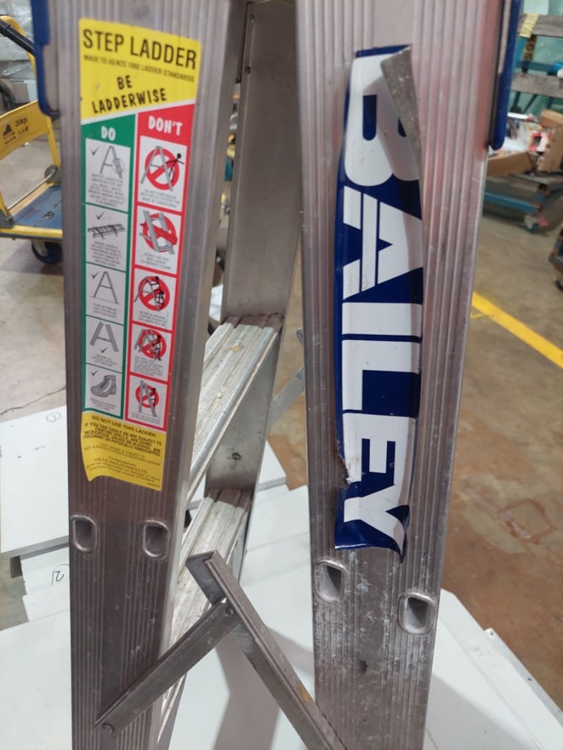 Bailey aluminium step ladder in fair condition. Features a dual-sided design with safety decals and warnings clearly visible on both sides. The ladder includes a sturdy cross-brace support system and appears to have approximately 5-6 steps. Comes with multiple white composite panels (approximately 8-10 panels visible) that appear to be replacement parts.Sold as Lot