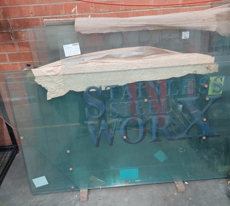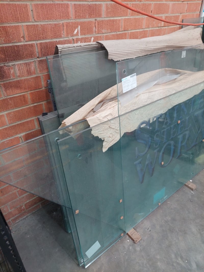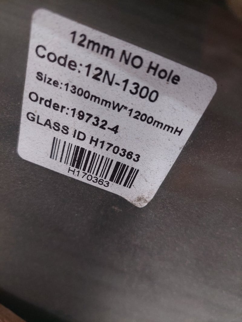 Toughened glass panel, 12mm no-hole specification, dimensions 1300mm (width) x 1200mm (height). Code 12N-1300, Order 19732-4, Glass ID H170363 includes various sizes ..Sold as Lot