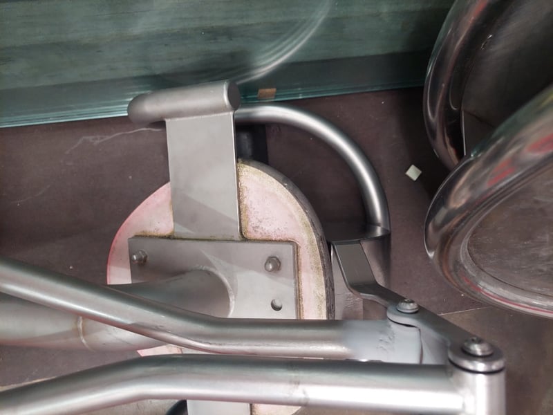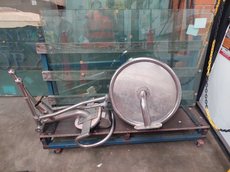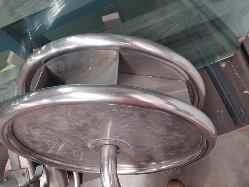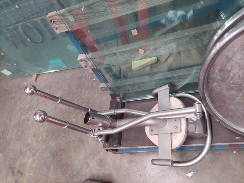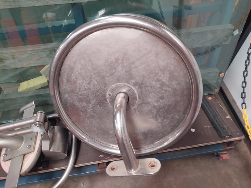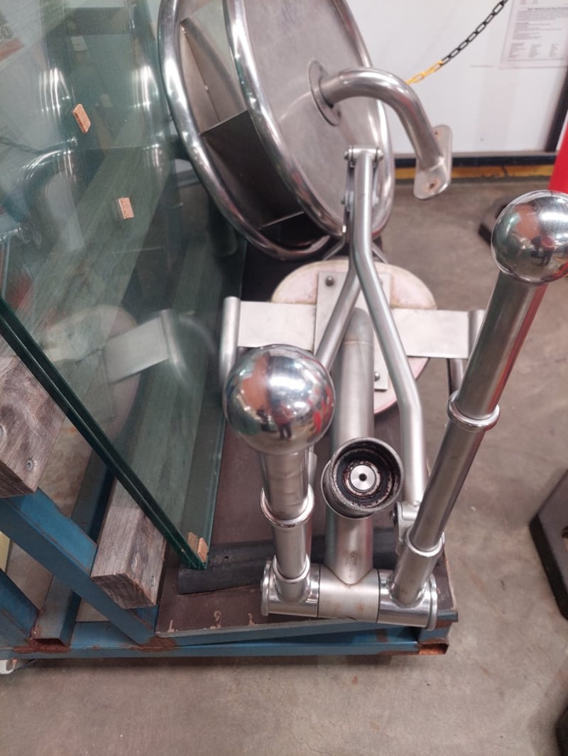 Commercial stainless steel tilting kettle with fixed volume capacity, mounted on mobile blue steel base frame with castor wheels. Features heavy-duty construction with polished stainless steel bowl, riveted handles, and dual ball valve controls with chrome plating and glass panelsSold as Lot