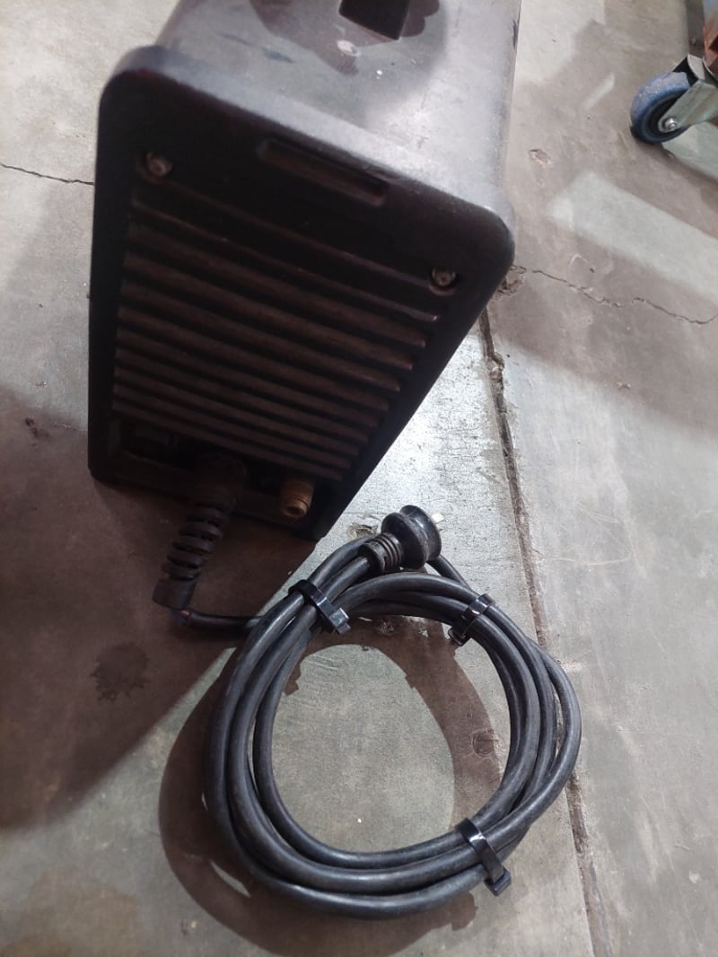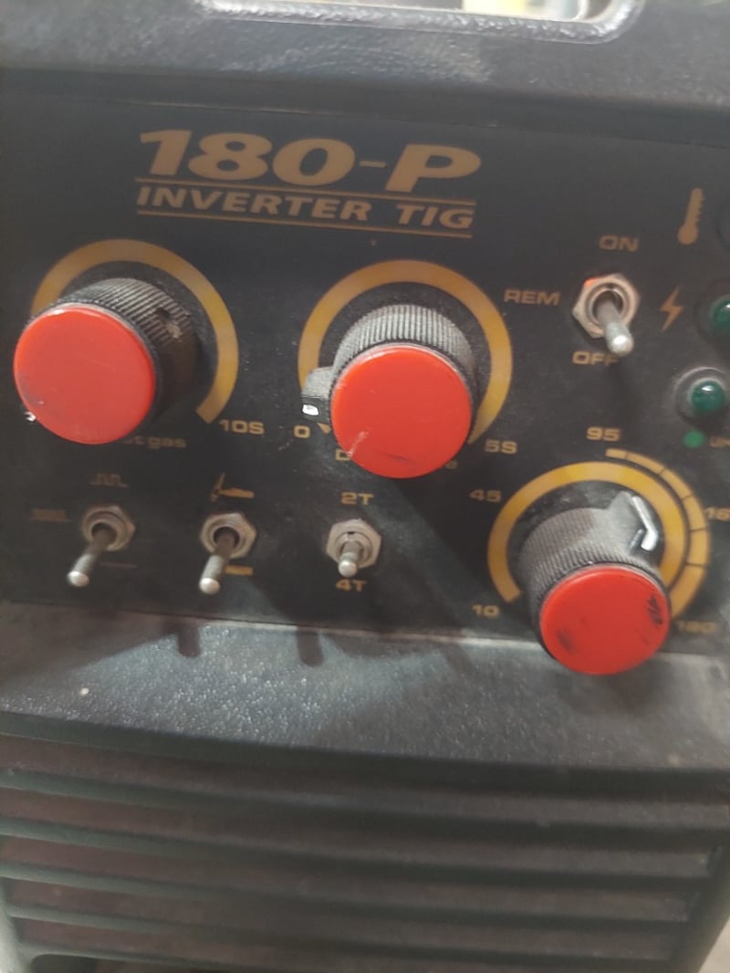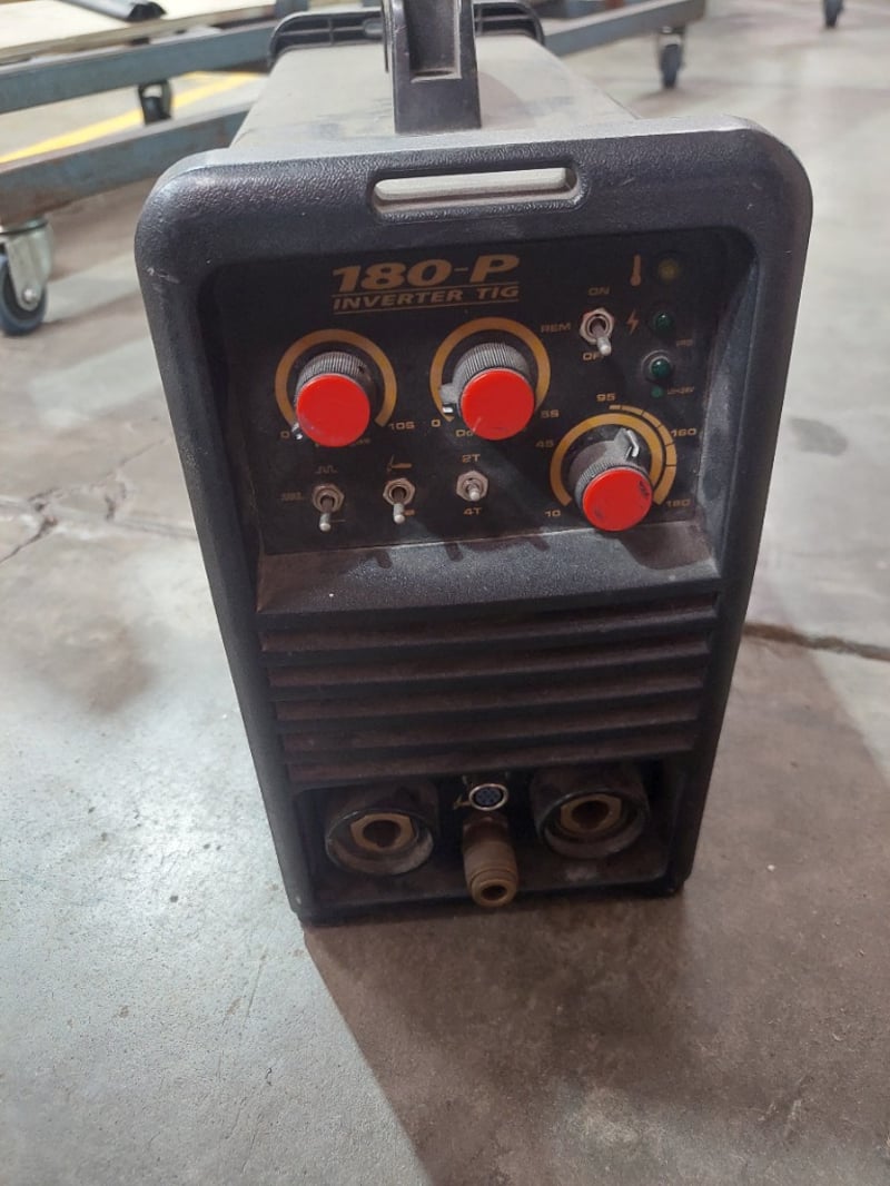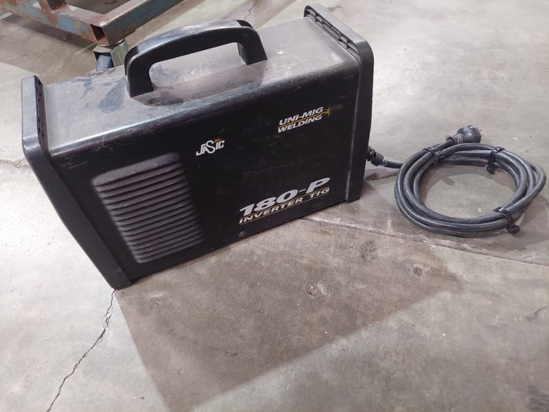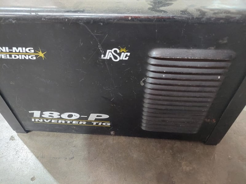 JASIC 180-P Inverter TIG Welding Machine. Portable MIG/TIG welder featuring dual control knobs for amperage adjustment and remote function. Equipped with professional-grade specifications including 10S and 95 amp settings. Includes power cable with standard industrial connector and foot pedal control attachment. Unit demonstrates working condition with visible wear consistent with workshop use. Ideal for metal fabrication, automotive repair, and general welding applications. Compact design with carry handle for job-site mobility.Bid Per Each Note: untested, signs of wear
