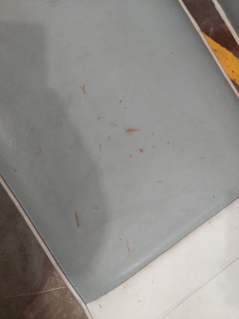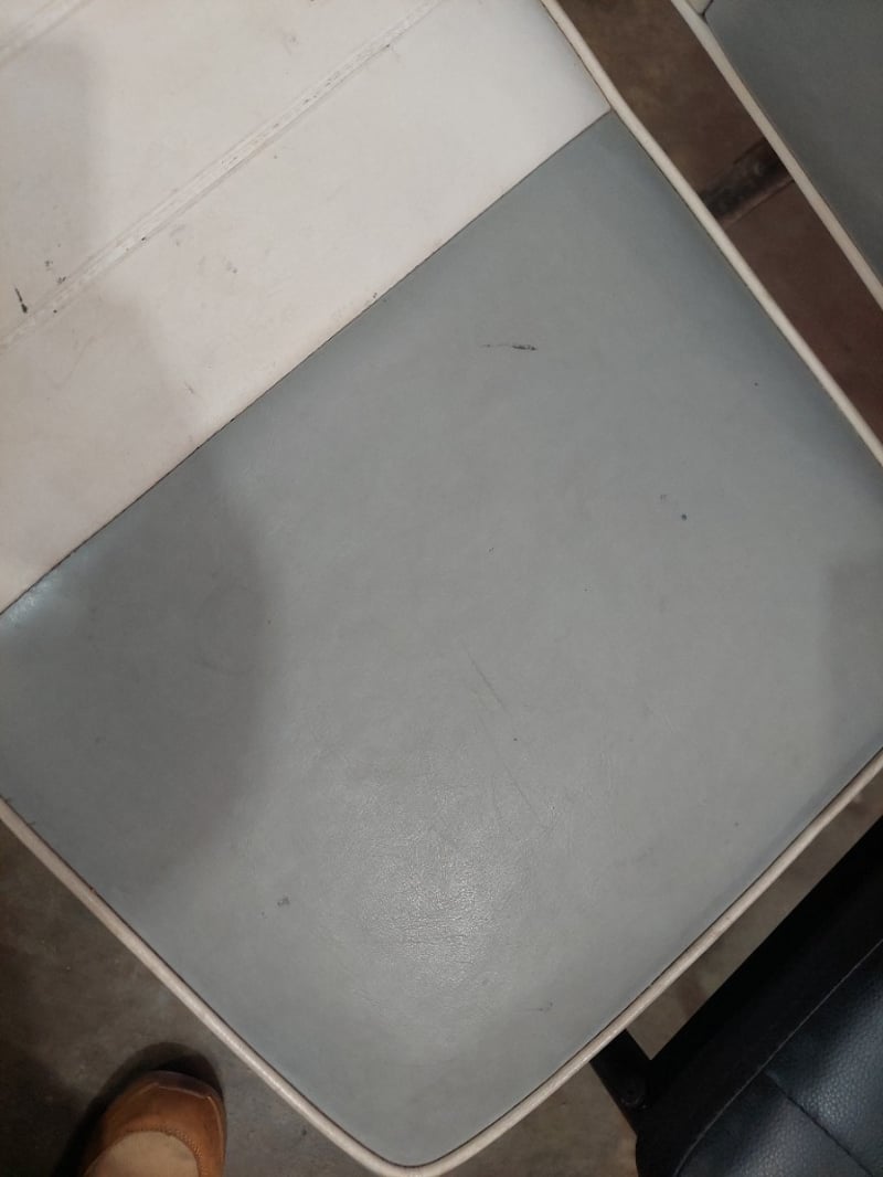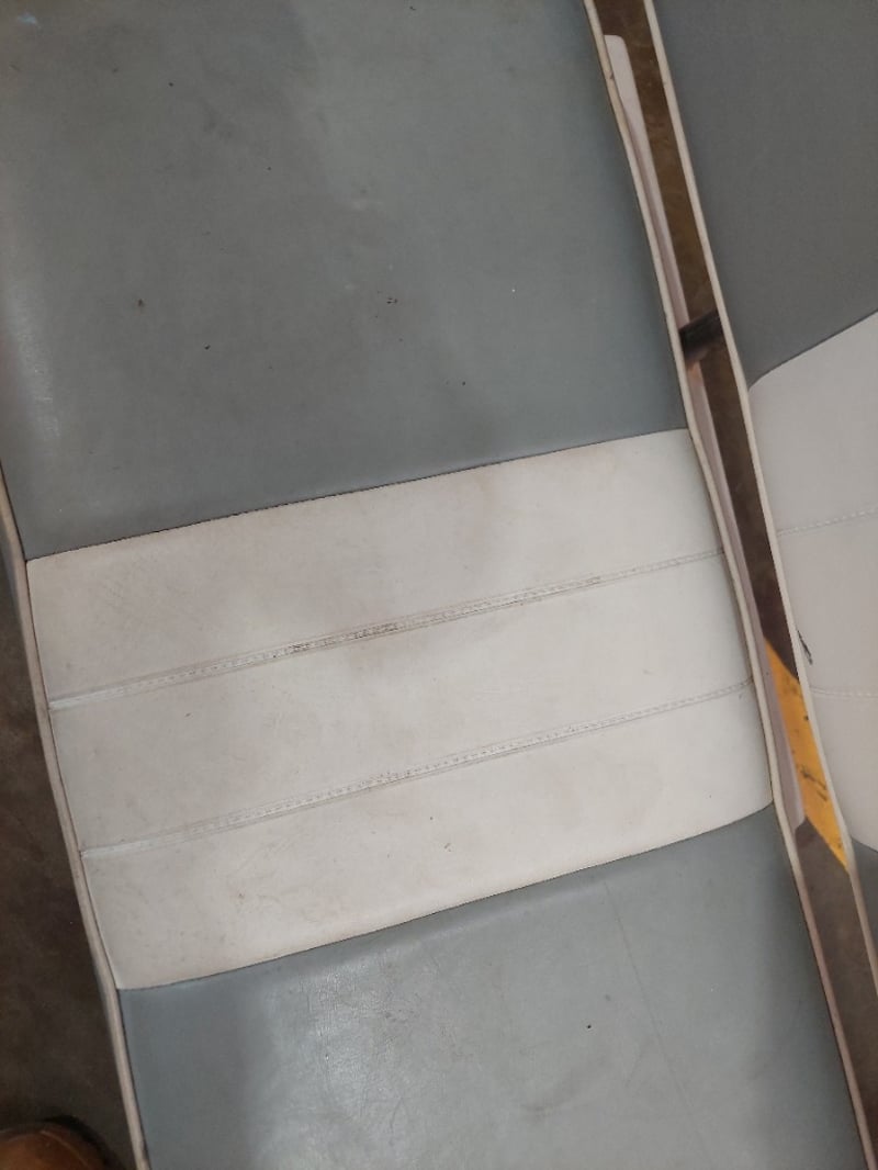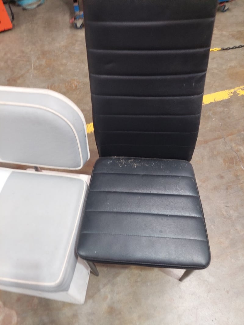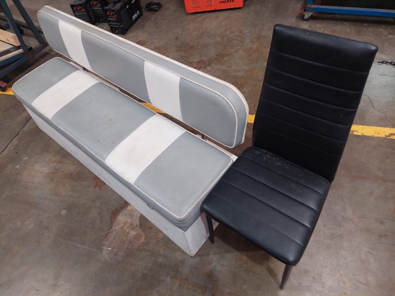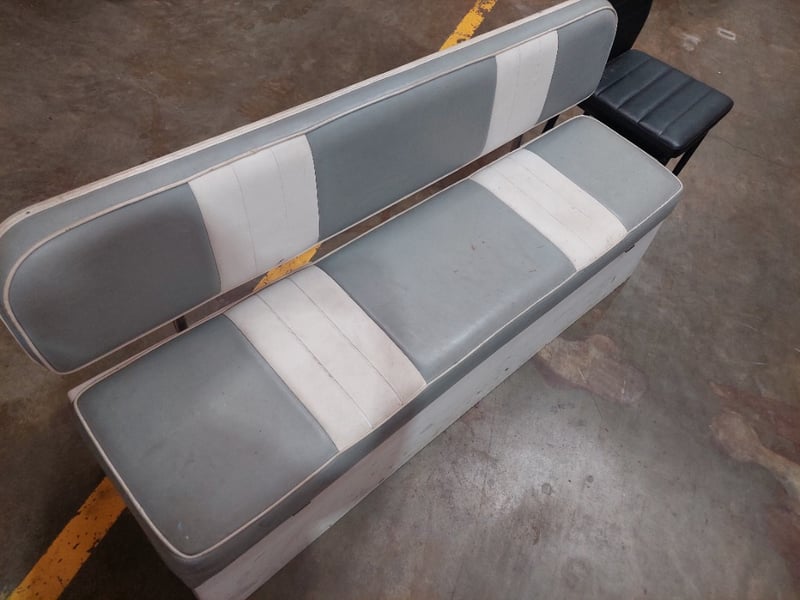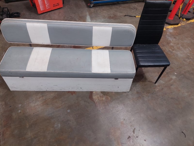 Retro-style dinette set featuring a grey and white striped upholstered bench seat with matching backrest and chrome trim, paired with a black padded dining chair. The bench seat displays a classic aesthetic with horizontal grey and white vinyl striping. The set shows evidence of age-appropriate wear including surface marks and minor staining on the upholstery. Note: signs of wearSold as Lot