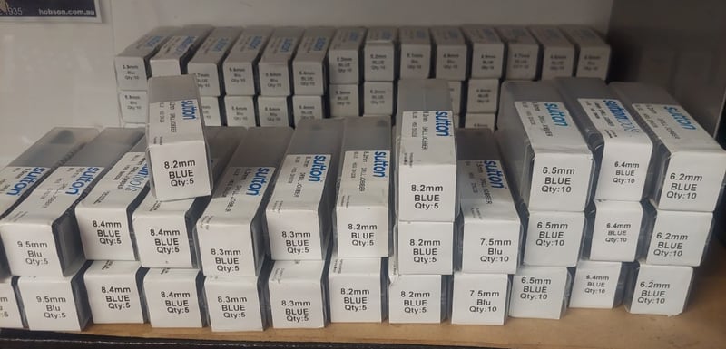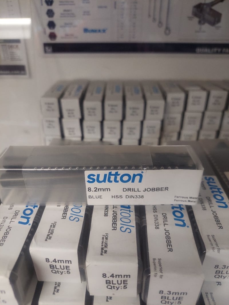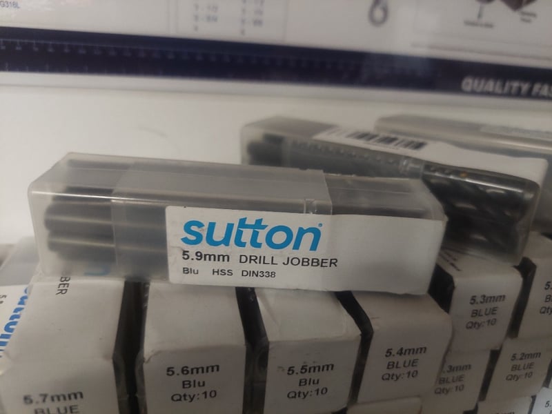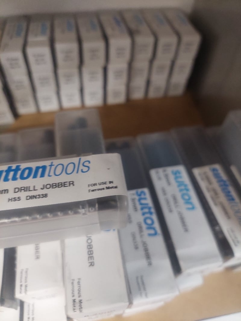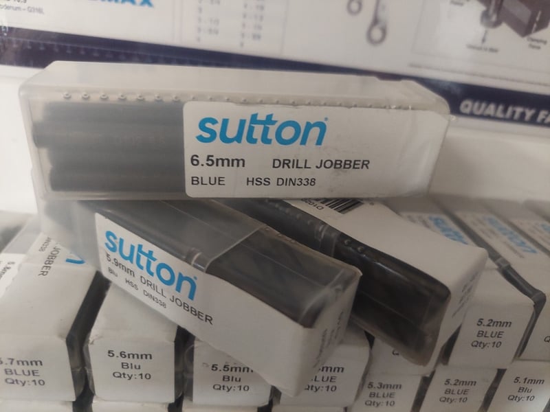 Comprehensive nventory of Sutton brand HSS DIN338 Blue Drill Jobbers in various metric sizes. Collection includes multiple boxes containing drill bits ranging from approximately 5.1mm to 9.5mm diameter. Boxes are clearly labeled with size specifications and quantities. Sold as lot
