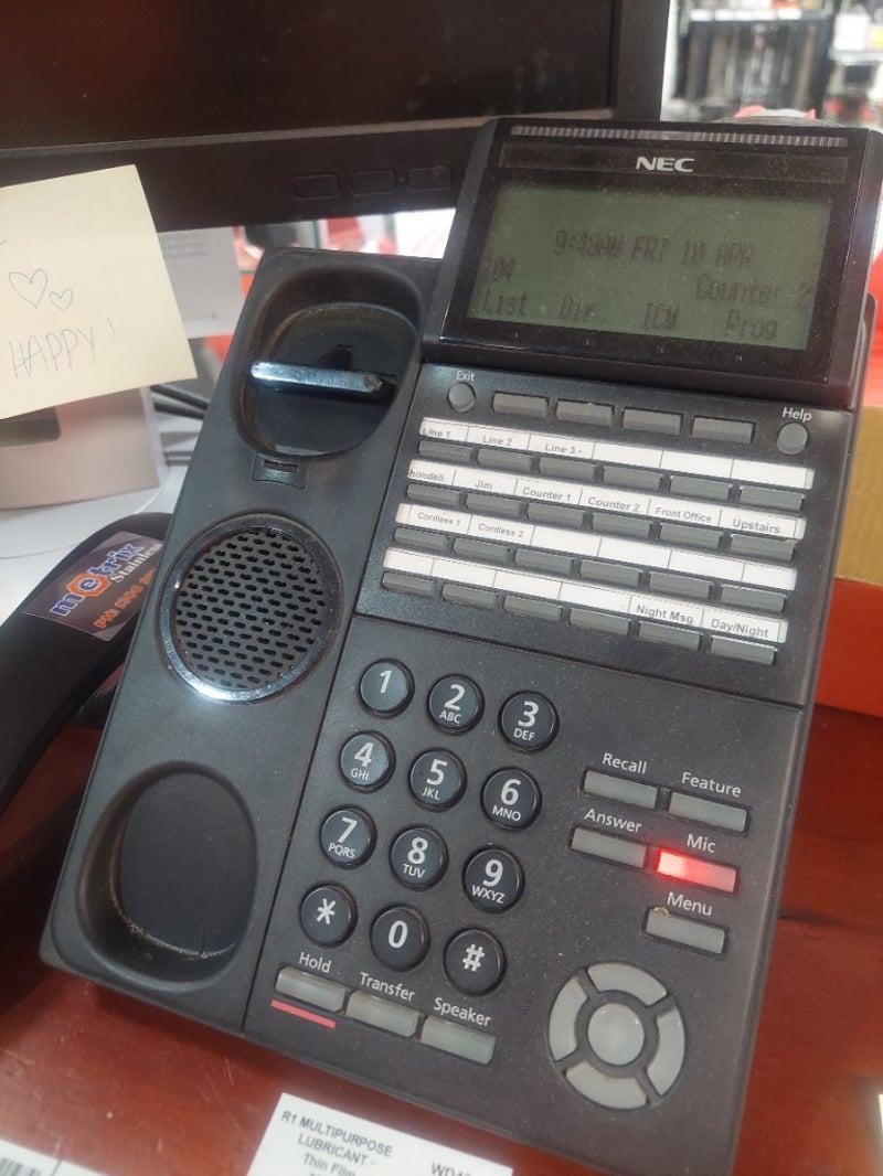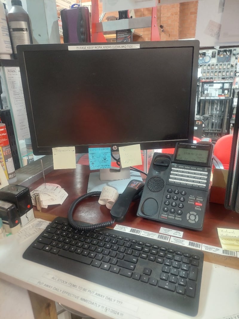 Comprehensive office equipment lot comprising HP monitor, NEC business telephone system, keyboard and mouse, and computer power supply unit. Sold as lot Note: untesredsigns of wear