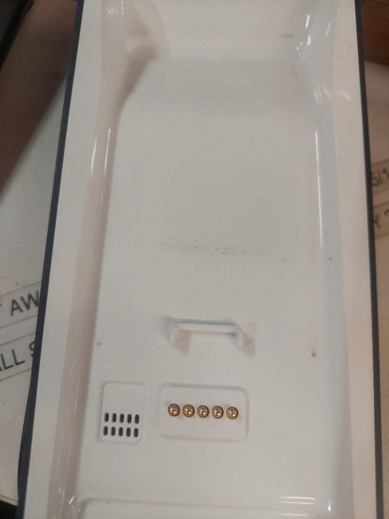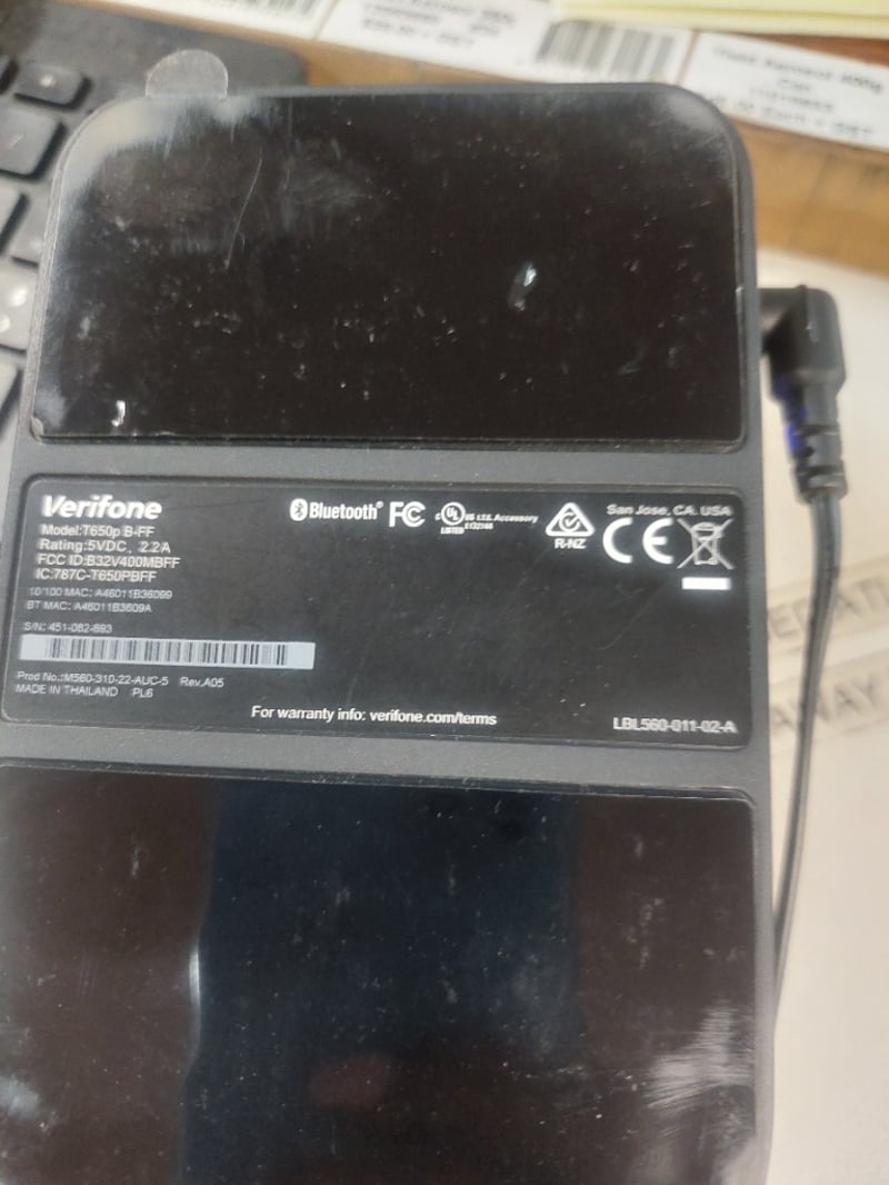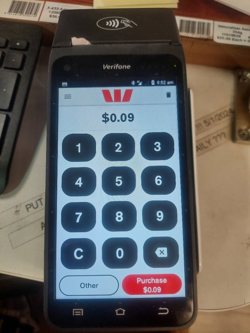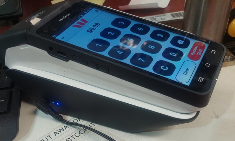 Verifone Model 7650p B-FF EFTPOS terminal with touchscreen display. Device features NFC contactless payment capability, numeric keypad with function buttons, and Westpac banking integration. The unit displays a transaction screen showing $0.09 amount with Purchase button prominently displayed. Includes power adapter with blue LED indicators and charging dock. Note: Untestedsigns of wear