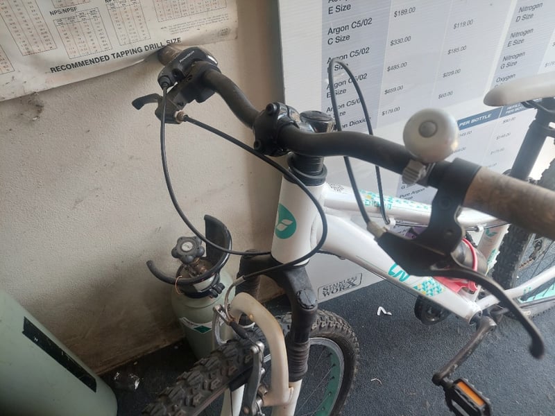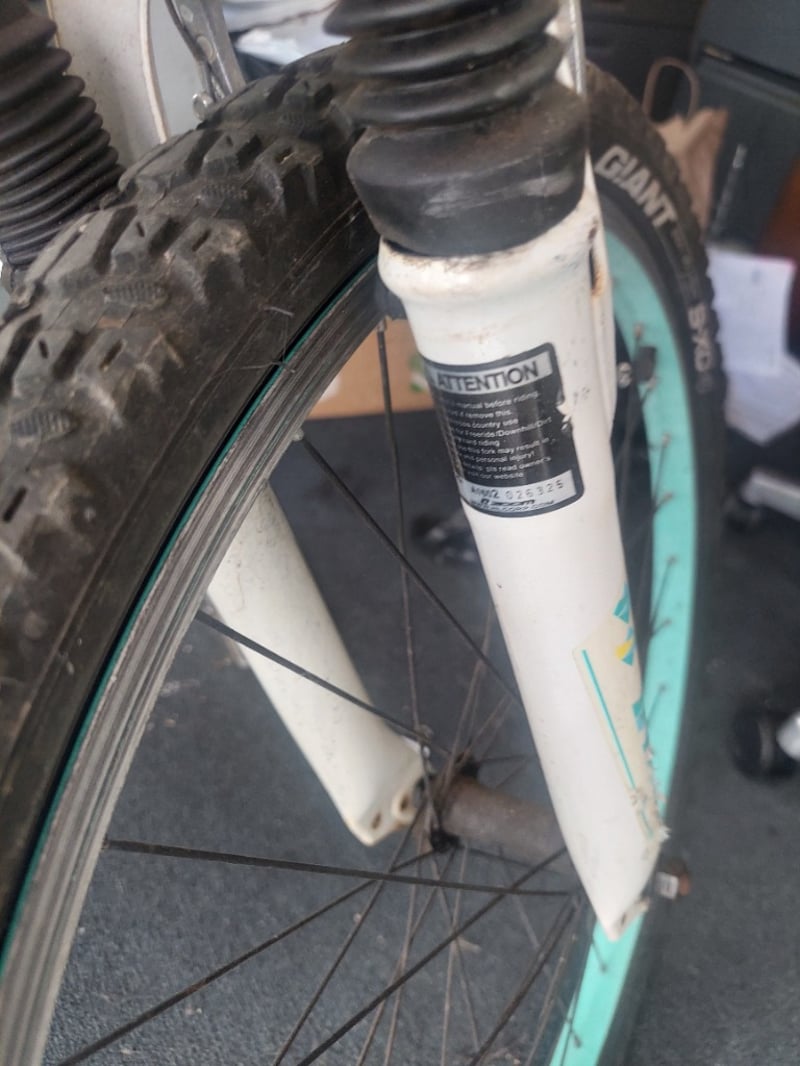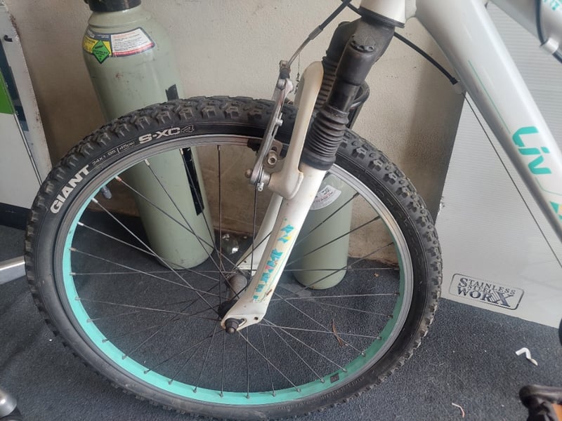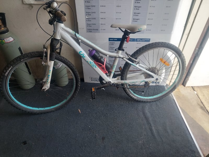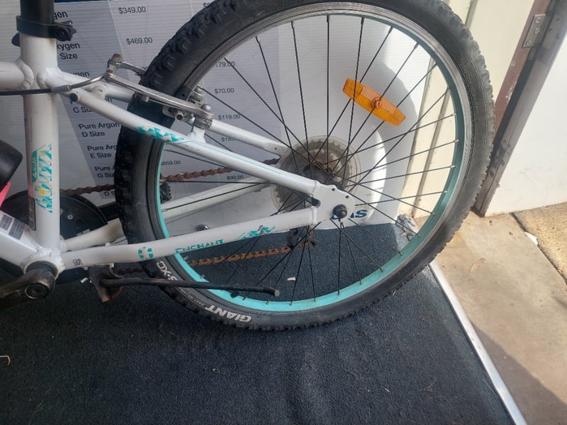Mountain bike featuring white frame with turquoise accents. Equipped with suspension front fork, flat handlebars with brake levers, and dual mechanical disc brakes. Giant SXD4 tyres mounted on 26-inch wheels with turquoise rims. Single-speed drivetrain with pedals and chain visible. Includes front and rear orange reflectors, water bottle cage.Note: Untested,, signs if wear