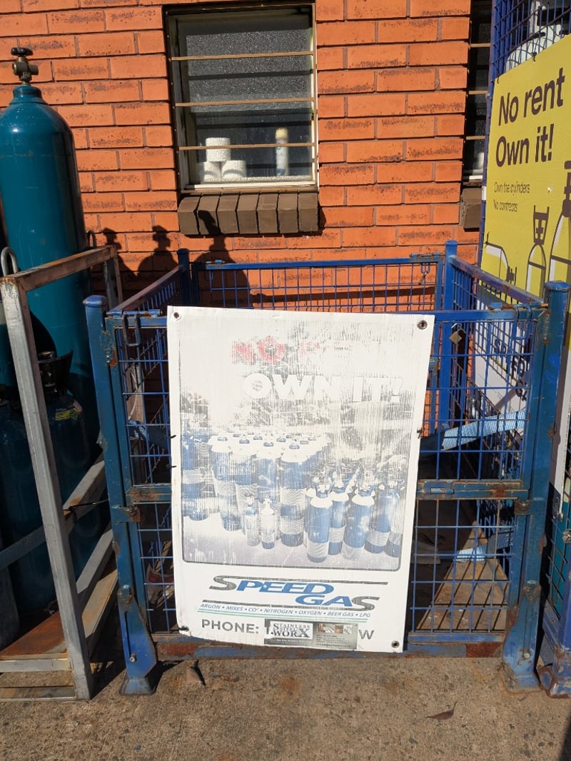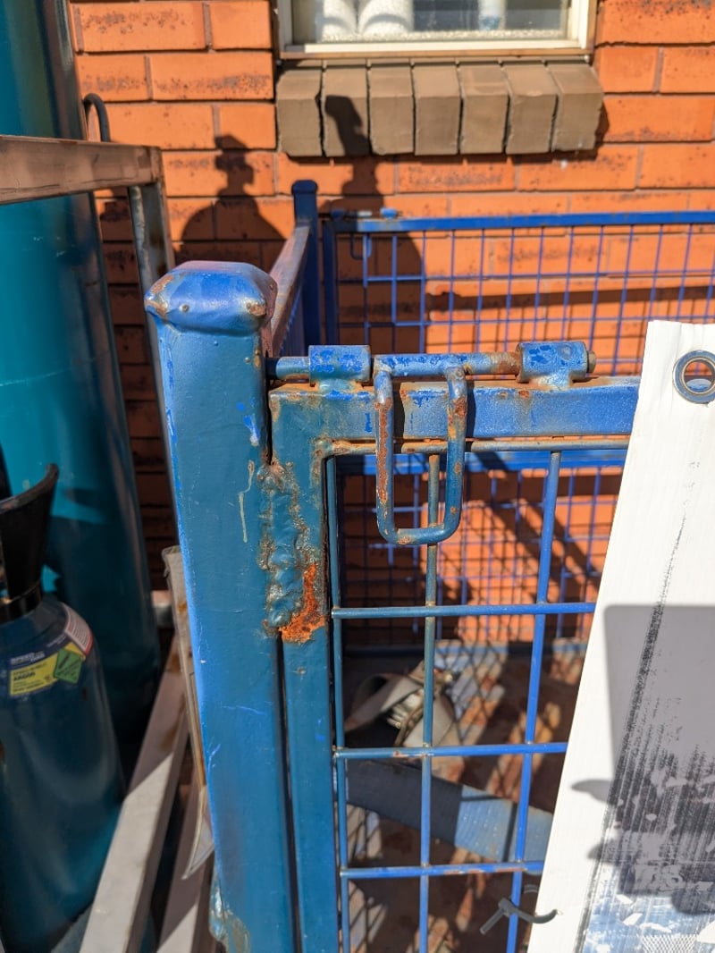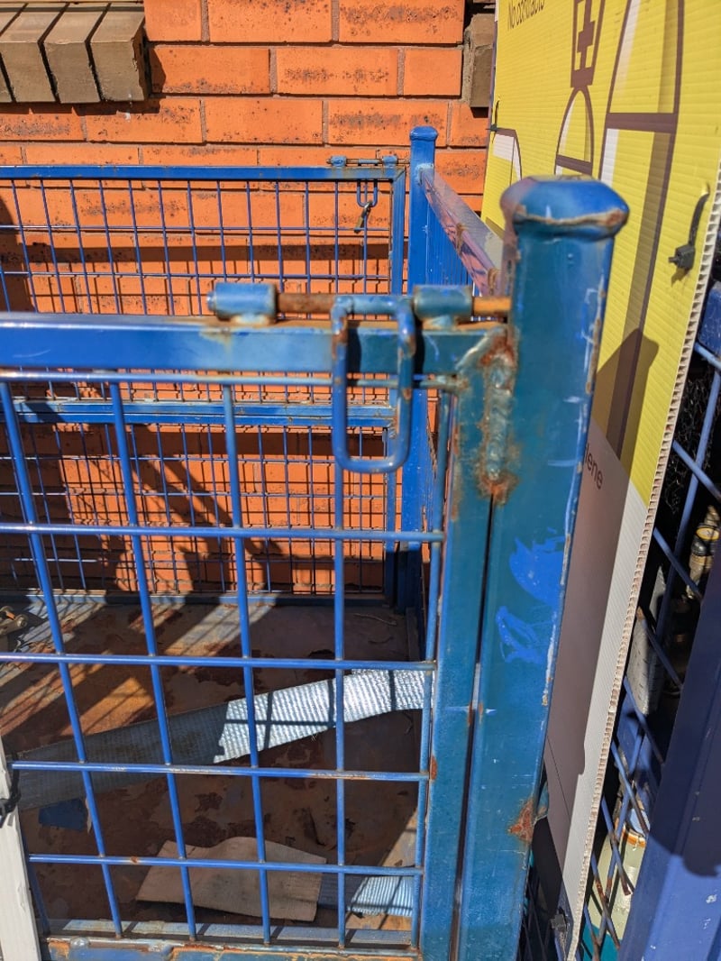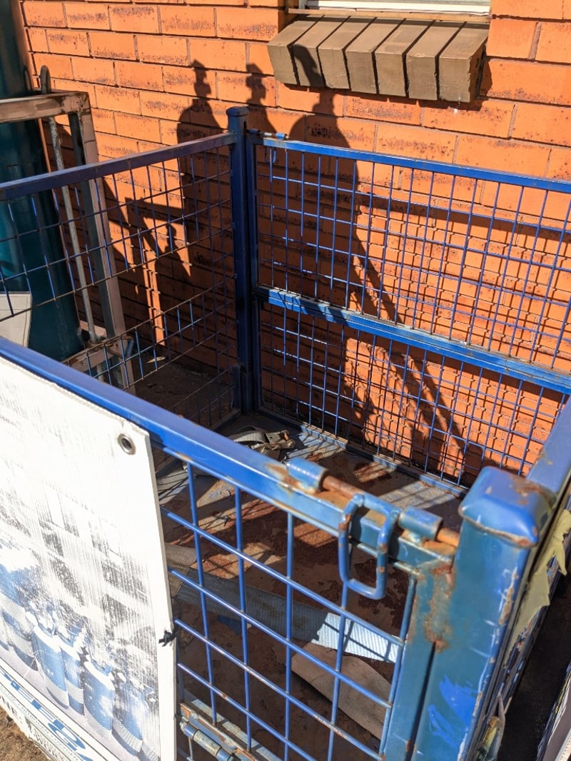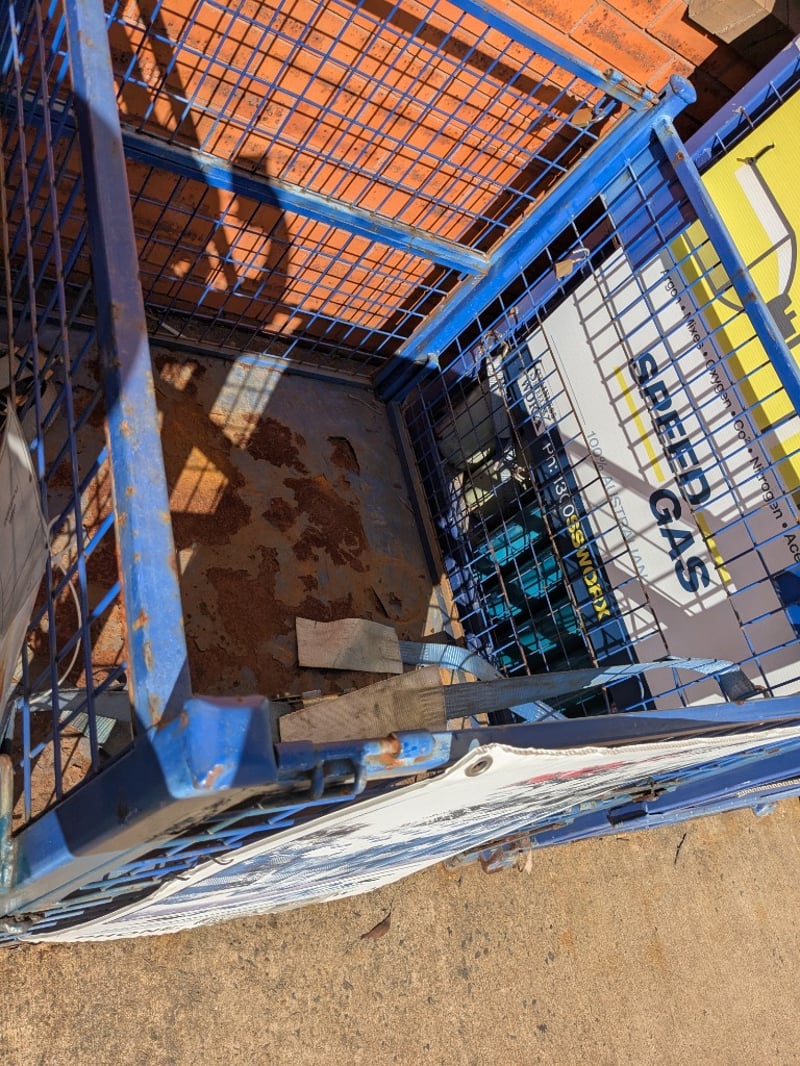 Industrial blue steel cage trailer with lockable gate and hinged roof access. Note: Signs Of Wear