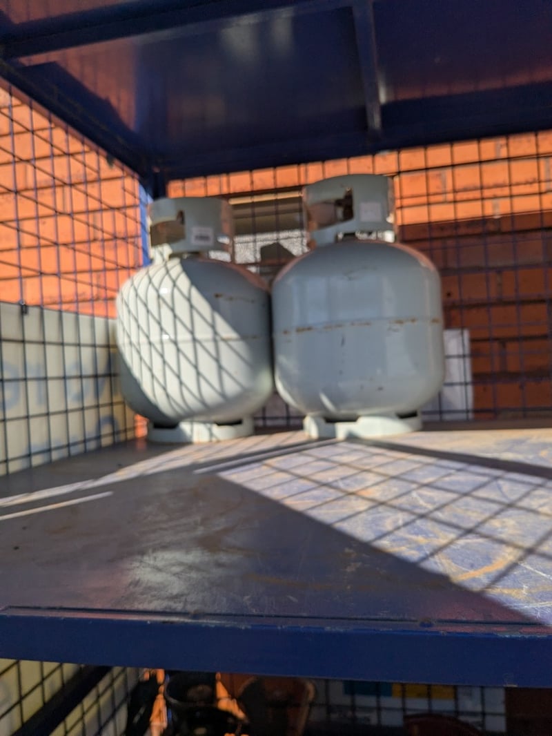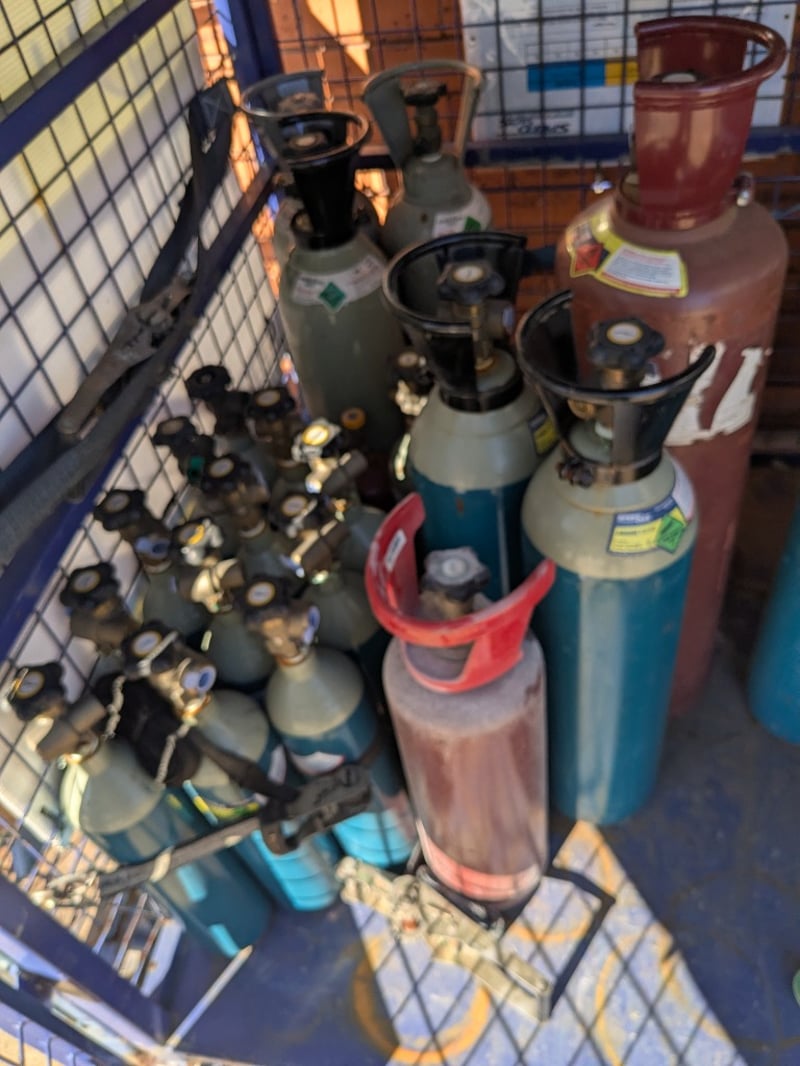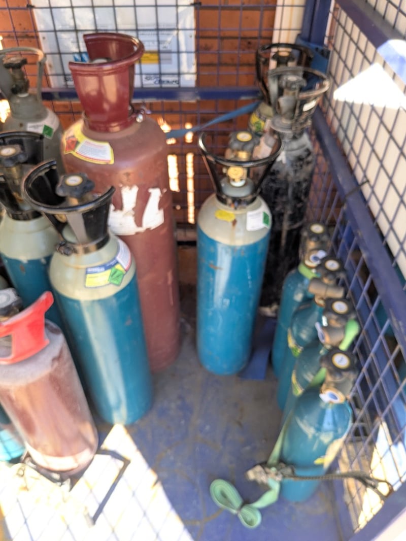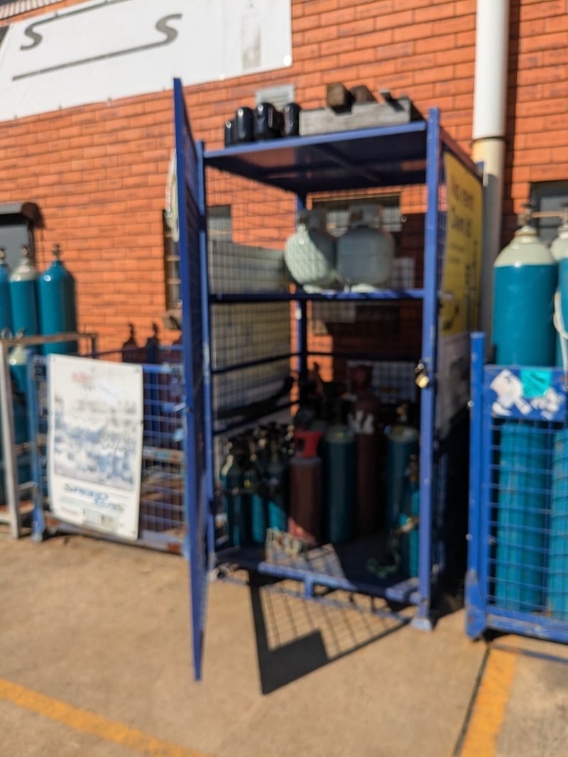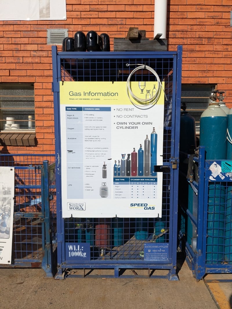 Speed Gas cylinder display and storage system featuring a blue steel cage frame with secure mesh fencing and loading capacity of 1000kg. The unit contains multiple gas cylinders in various sizes and types including Argon & Argon mix, Oxygen, Acetylene, Nitrogen, CO2 and mixed gases. Includes yellow informational signage detailing gas types, connection uses, and available cylinder sizes. Two large grey propane-style storage cylinders mounted on upper shelf. Sold as lot Note: Note: cylinders may be empty