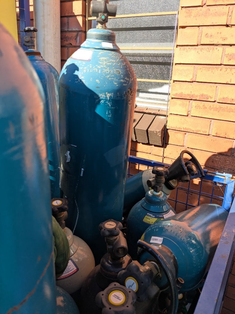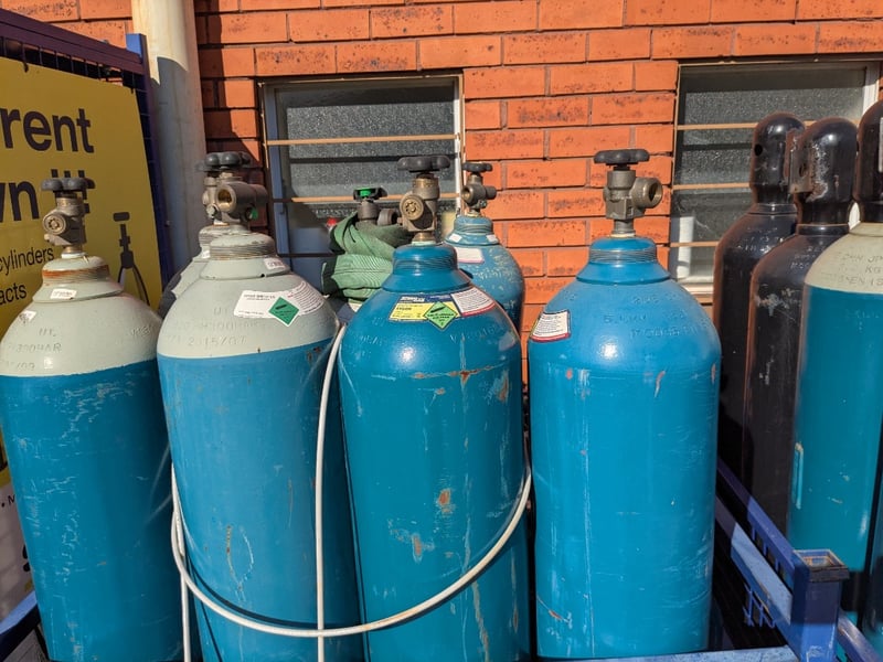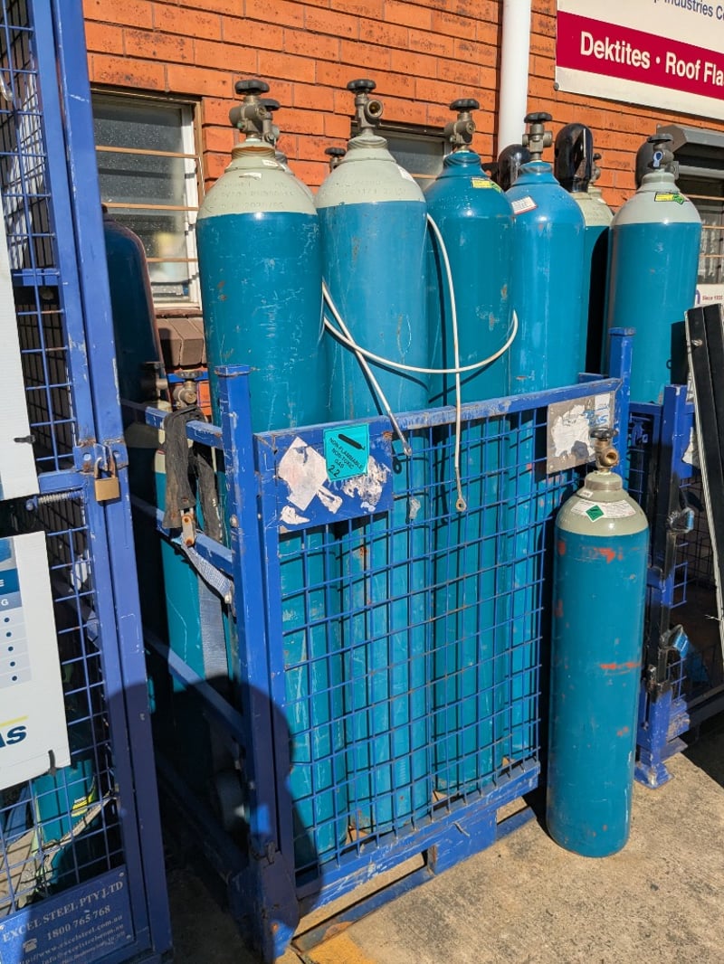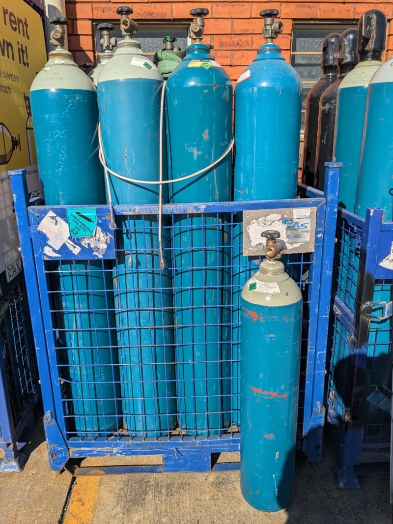 Substantial collection of industrial gas cylinders in varying sizes and conditions. Predominantly turquoise-painted steel cylinders with white/cream upper sections, fitted with brass valve assemblies and pressure regulators. Collection includes multiple full-sized cylinders (approximately 50-60cm height) and smaller portable cylinders. Cylinders display wear consistent with industrial use, including surface oxidation, paint chipping, and patina. Safety labels and identification tags visible on several units. Cylinders are securely stored in blue industrial mesh cages with metal reinforcement.Sold as lotNote: cylinders may be empty