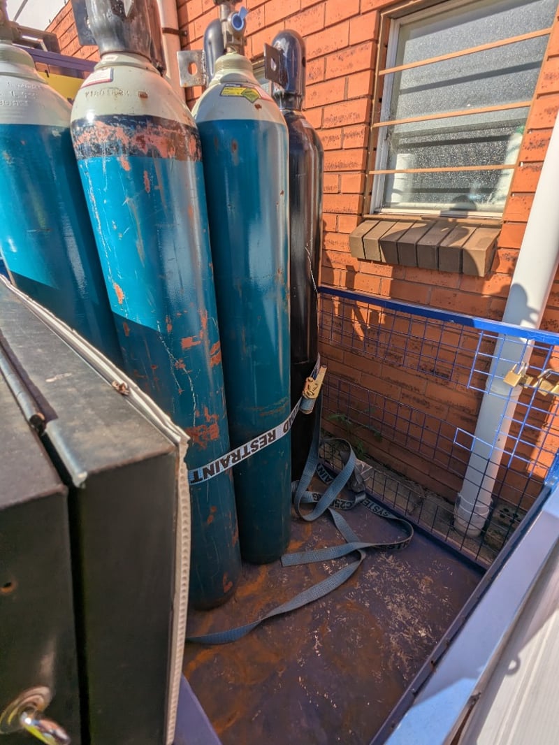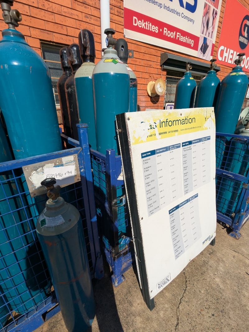 Comprehensive gas cylinder collection featuring multiple industrial-grade compressed gas bottles in teal blue finish. Includes various gas types (Acetylene, Argon, Nitrogen, Oxygen, Pure Argon, Hydrocarbon 30) in assorted sizes (C, D, E, G). Cylinders mounted on blue wire mesh cages with secure fastening mechanisms.Sold as lotNote: cylinders may be empty