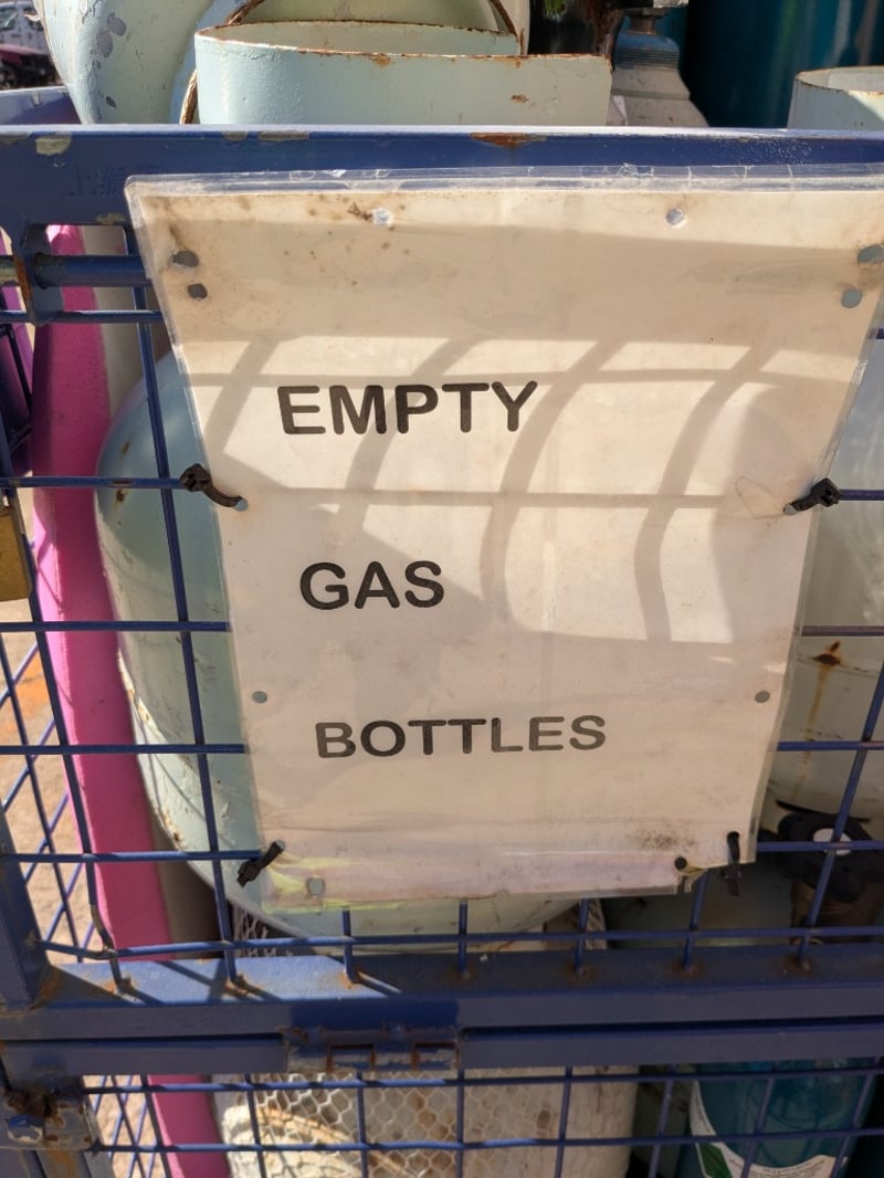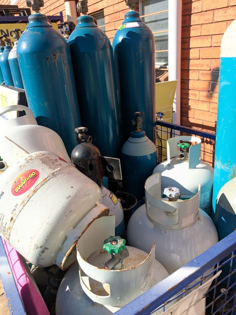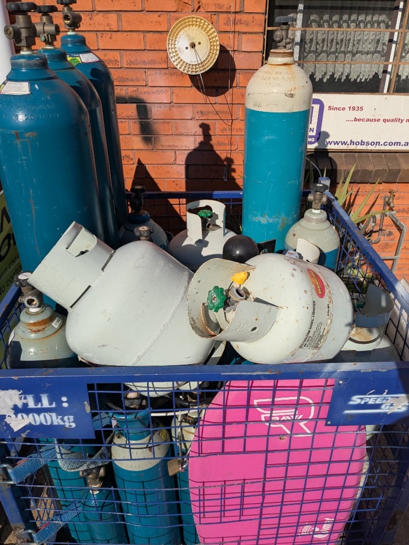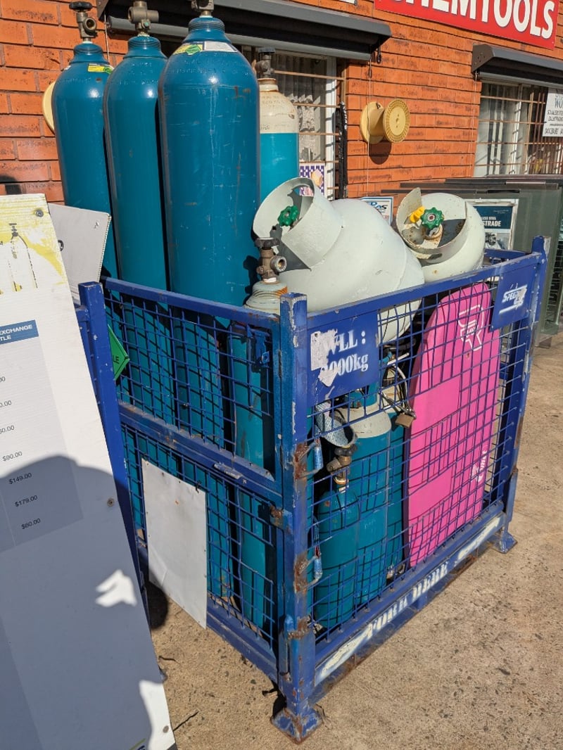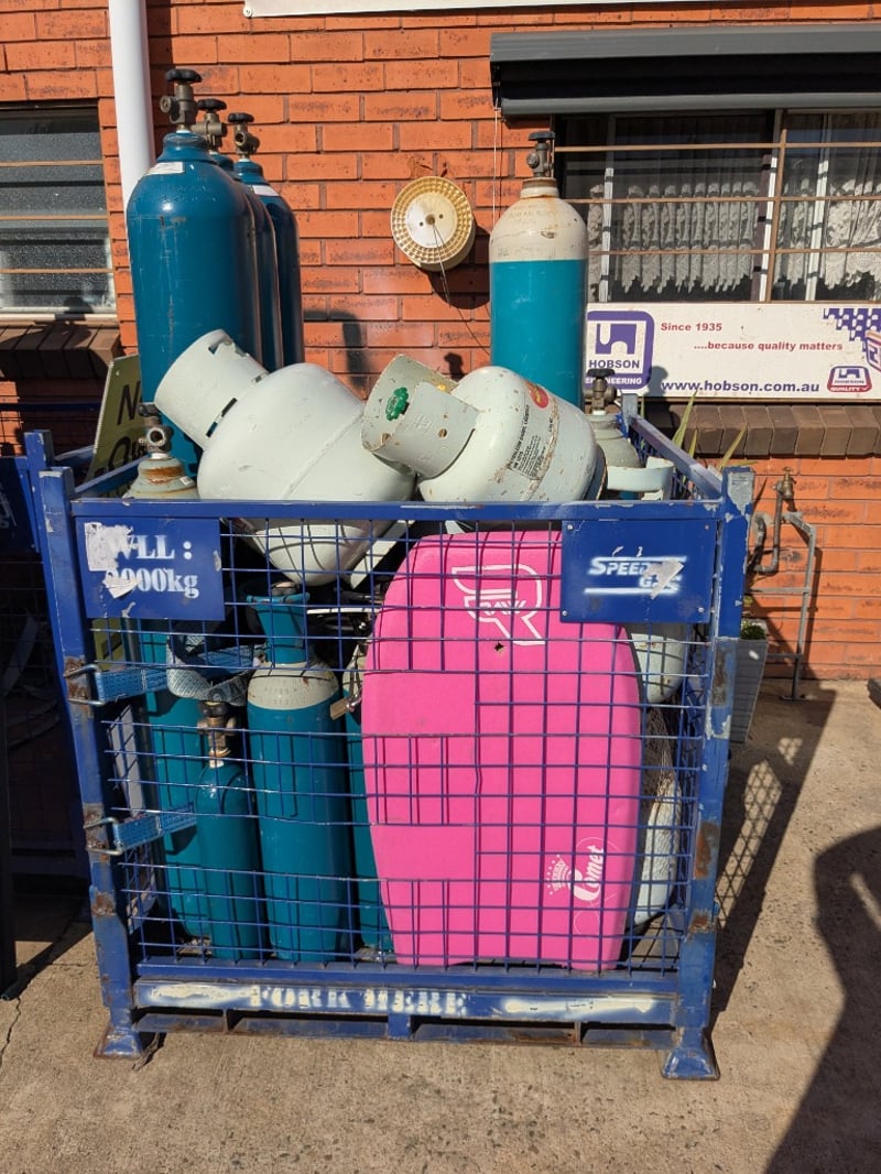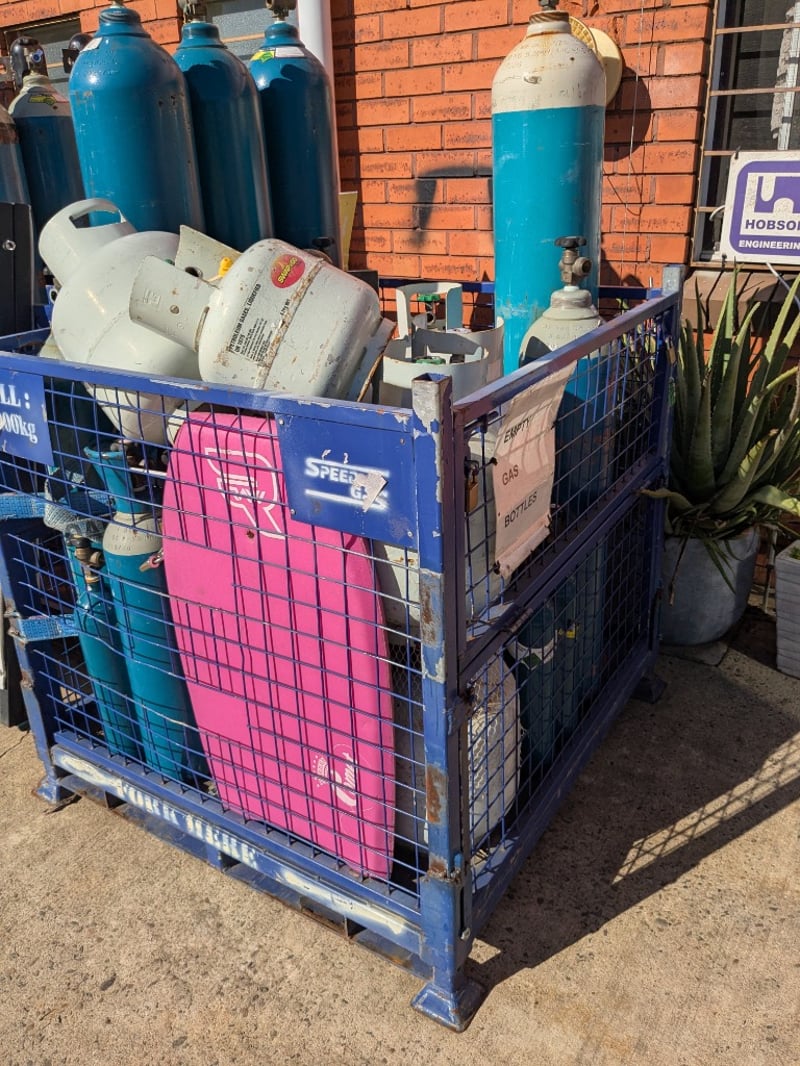 Comprehensive gas bottle storage and transport lot featuring multiple blue welded steel cylinders and white LPG bottles. Collection includes approximately 3-4 large blue industrial gas cylinders (appear to be oxygen or similar compressed gas), multiple white portable LPG/propane bottles of varying sizes, regulators, and associated fittings. All items secured in a blue steel cage trolley with pink mesh divider and capacity marking of 900kg. Includes pressure gauges and valve mechanisms on cylinders. Sold as lotNote: cylinders may be empty