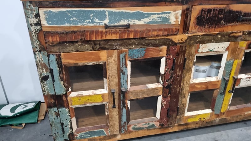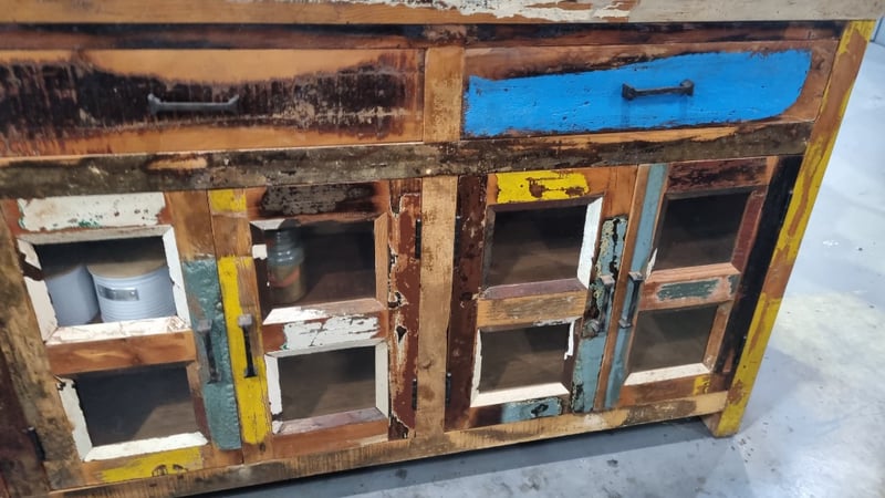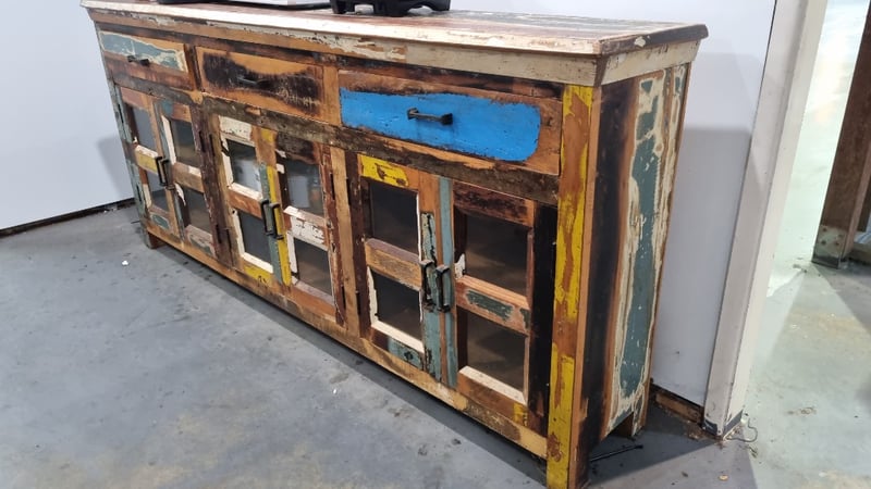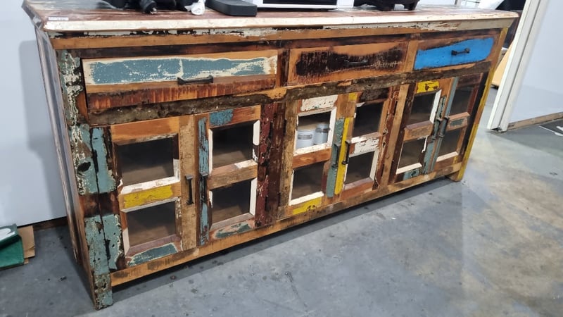 Timber Side Cabinet, Reclaimed Timber Style features 3 drawers And 6 Glass Doors Dimensions 910H x 1990W x 355DLocation: South Lismore, NSW Inspection: Wednesday 22nd of April, 9am to 3pm Collections: STRICTLY Tuesday the 28th April to Friday 1st May
